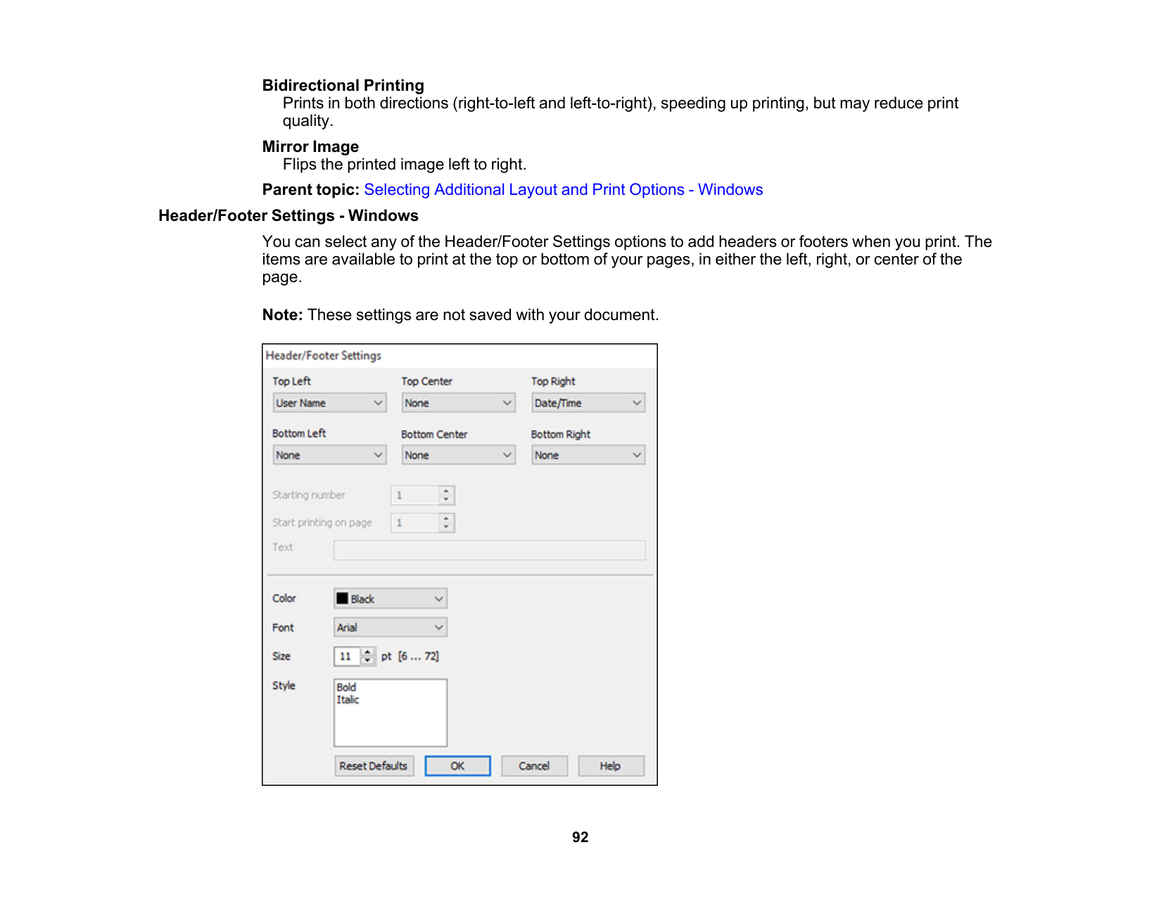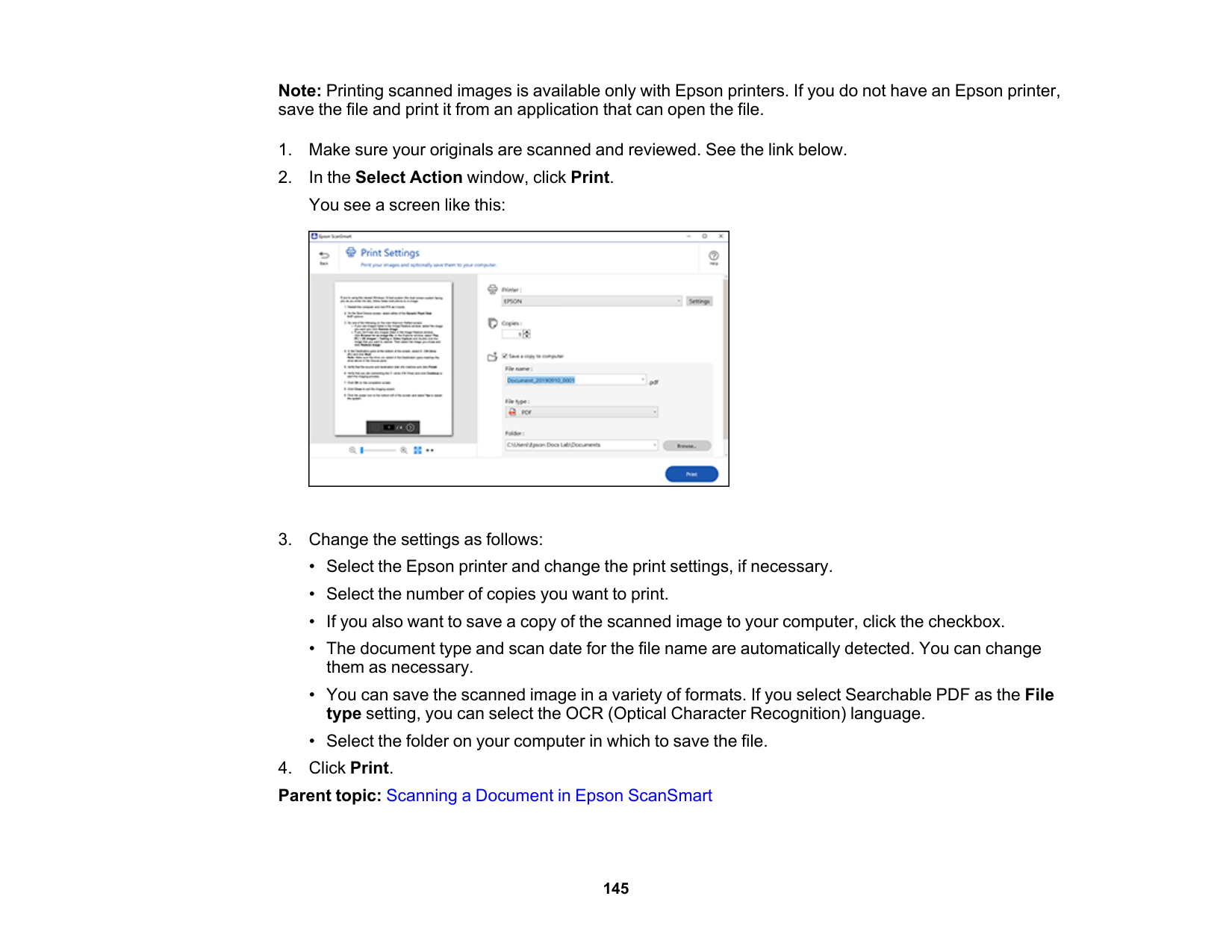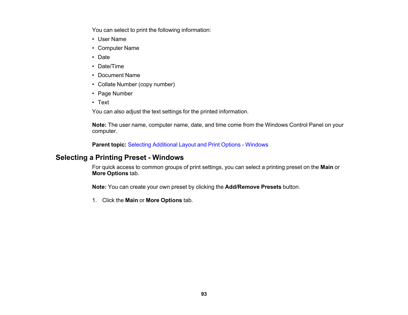 5 Placing Originals on the Product ............................................................................................................. 71 Placing Originals on the Scanner Glass ............................................................................................. 71 Placing Originals in the Automatic Document Feeder ........................................................................ 73 ADF Original Document Specifications .............................................................................................. 76 Copying...................................................................................................................................................... 77 Copying Documents or Photos........................................................................................................... 77 Copying Options................................................................................................................................. 78 Printing from a Computer ......................................................................................................................... 80 Printing with Windows ........................................................................................................................ 80 Selecting Basic Print Settings - Windows ...................................................................................... 81 Print Quality Options - Windows ............................................................................................... 83 Multi-Page Printing Options - Windows..................................................................................... 83 Selecting Double-sided Printing Settings - Windows..................................................................... 84 Double-sided Printing Options - Windows................................................................................. 87 Print Density Adjustments - Windows ....................................................................................... 87 Selecting Additional Layout and Print Options - Windows ............................................................. 88 Custom Color Correction Options - Windows............................................................................ 90 Image Options and Additional Settings - Windows.................................................................... 91 Header/Footer Settings - Windows ........................................................................................... 92 Selecting a Printing Preset - Windows........................................................................................... 93 Selecting Extended Settings - Windows ........................................................................................ 94 Extended Settings - Windows ................................................................................................... 96 Printing Your Document or Photo - Windows................................................................................. 98 Checking Print Status - Windows .................................................................................................. 99 Locking Printer Settings - Windows ............................................................................................. 100 Locked Setting Options........................................................................................................... 101 Selecting Default Print Settings - Windows.................................................................................. 103 Changing the Language of the Printer Software Screens ....................................................... 104 Changing Automatic Update Options .......................................................................................... 105 Printing with the Built-in Epson Driver - Windows 10 S..................................................................... 106 Selecting Print Settings - Windows 10 S...................................................................................... 106 Printing on a Mac ............................................................................................................................. 110 Selecting Basic Print Settings - Mac ........................................................................................... 111