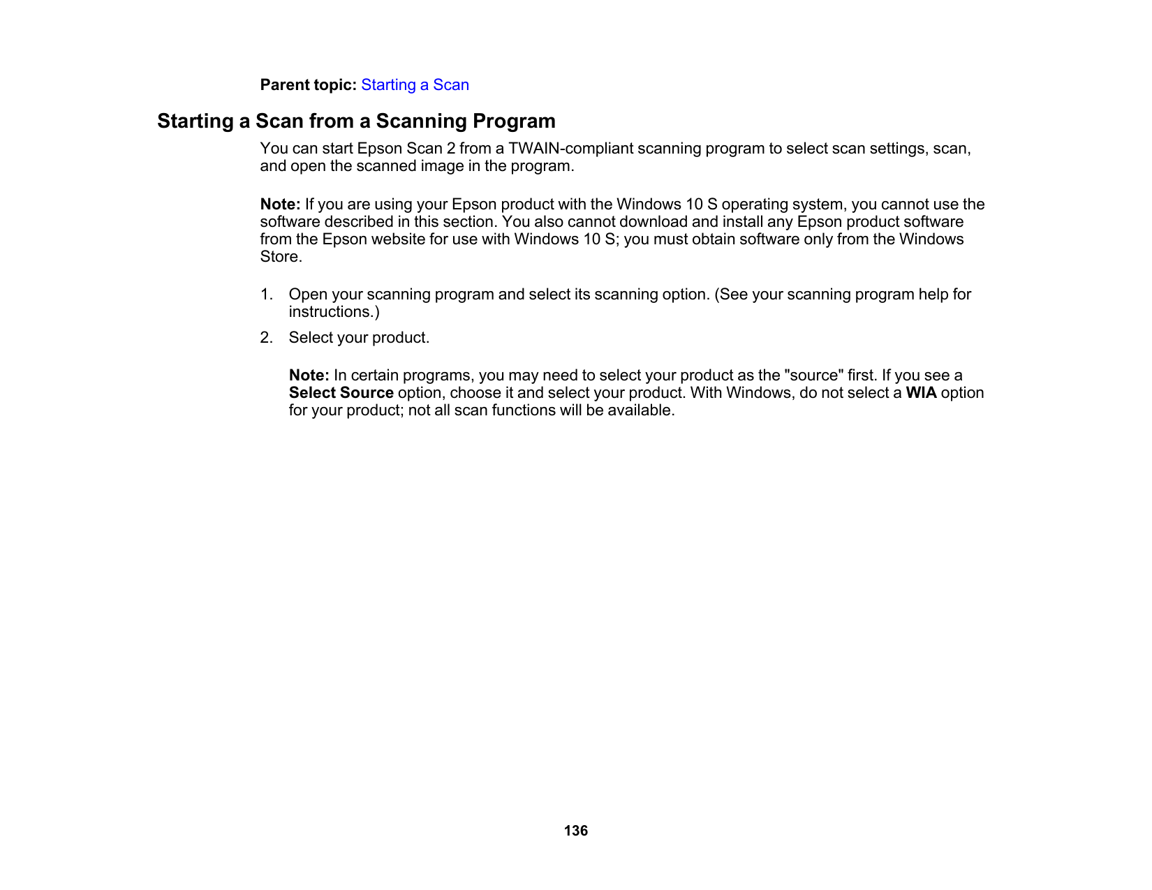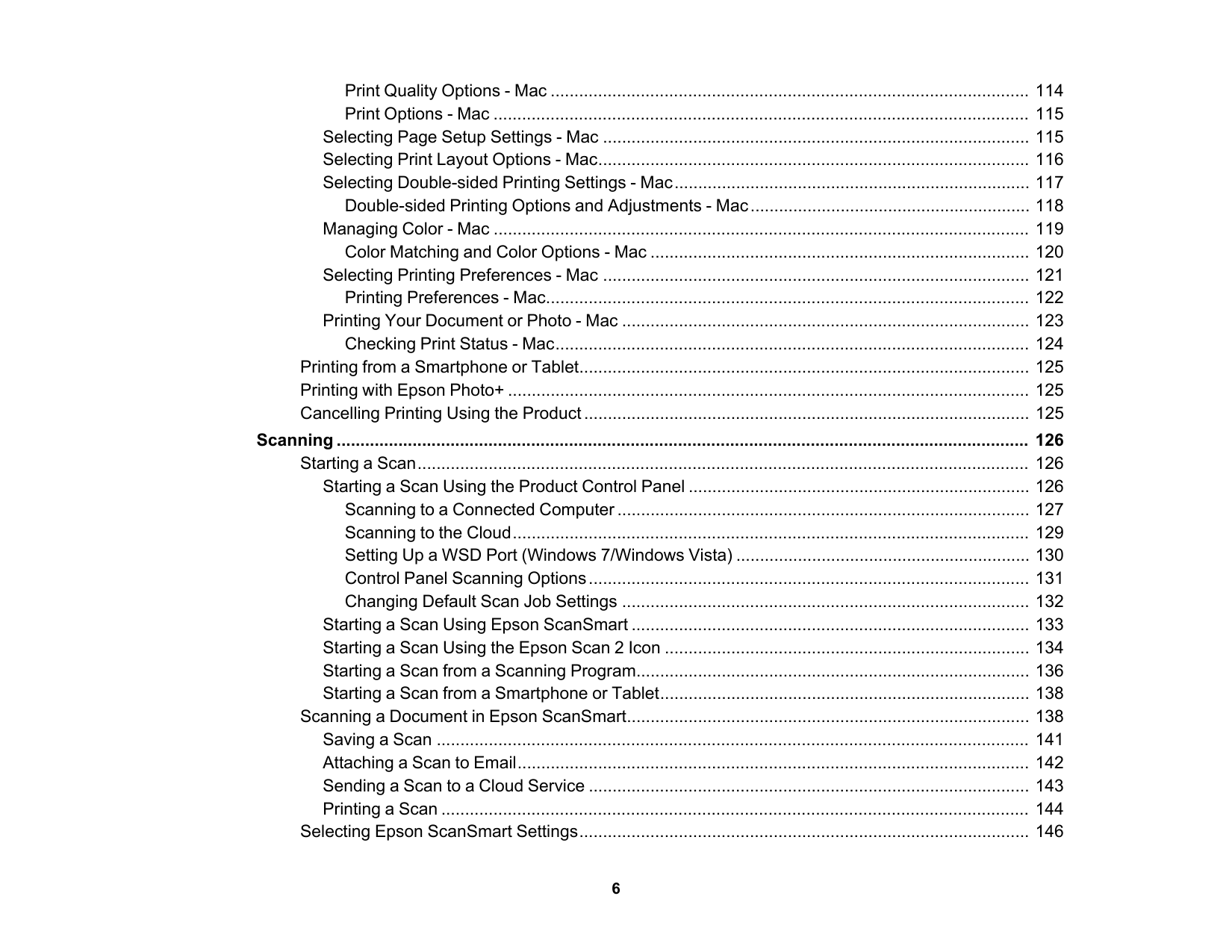 6 Print Quality Options - Mac ..................................................................................................... 114 Print Options - Mac ................................................................................................................. 115 Selecting Page Setup Settings - Mac .......................................................................................... 115 Selecting Print Layout Options - Mac........................................................................................... 116 Selecting Double-sided Printing Settings - Mac........................................................................... 117 Double-sided Printing Options and Adjustments - Mac........................................................... 118 Managing Color - Mac ................................................................................................................. 119 Color Matching and Color Options - Mac ................................................................................ 120 Selecting Printing Preferences - Mac .......................................................................................... 121 Printing Preferences - Mac...................................................................................................... 122 Printing Your Document or Photo - Mac ...................................................................................... 123 Checking Print Status - Mac.................................................................................................... 124 Printing from a Smartphone or Tablet............................................................................................... 125 Printing with Epson Photo+ .............................................................................................................. 125 Cancelling Printing Using the Product.............................................................................................. 125 Scanning .................................................................................................................................................. 126 Starting a Scan................................................................................................................................. 126 Starting a Scan Using the Product Control Panel ........................................................................ 126 Scanning to a Connected Computer ....................................................................................... 127 Scanning to the Cloud............................................................................................................. 129 Setting Up a WSD Port (Windows 7/Windows Vista) .............................................................. 130 Control Panel Scanning Options............................................................................................. 131 Changing Default Scan Job Settings ...................................................................................... 132 Starting a Scan Using Epson ScanSmart .................................................................................... 133 Starting a Scan Using the Epson Scan 2 Icon ............................................................................. 134 Starting a Scan from a Scanning Program................................................................................... 136 Starting a Scan from a Smartphone or Tablet.............................................................................. 138 Scanning a Document in Epson ScanSmart..................................................................................... 138 Saving a Scan ............................................................................................................................. 141 Attaching a Scan to Email............................................................................................................ 142 Sending a Scan to a Cloud Service ............................................................................................. 143 Printing a Scan ............................................................................................................................ 144 Selecting Epson ScanSmart Settings............................................................................................... 146