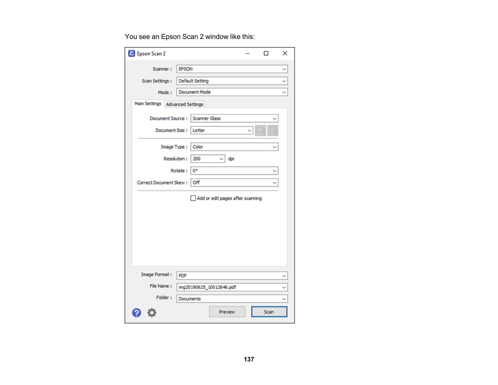 258 Additional Scanning Settings - Main Settings Tab Image Colors are Patchy at the Edges If you are scanning a thick or warped original, cover its edges with paper to block external light as you scan it. Parent topic: Solving Scanned Image Quality Problems Ripple Patterns Appear in an Image You may see a ripple pattern (called a moiré) in scanned images of printed documents. This is caused by interference from differing pitches in the scanner's screen and your original's halftone screen. To reduce this effect, adjust these Epson Scan 2 settings (if available) and try scanning again: