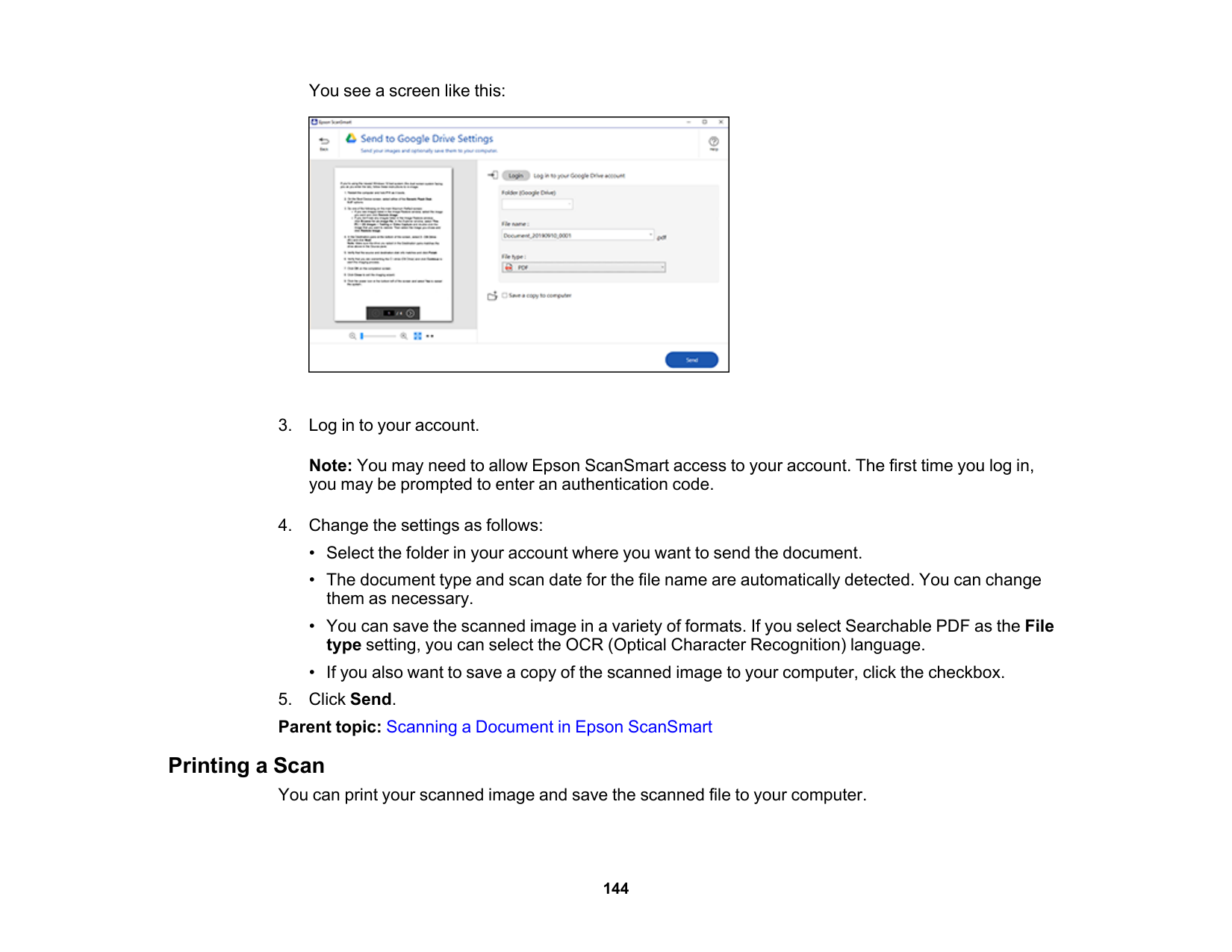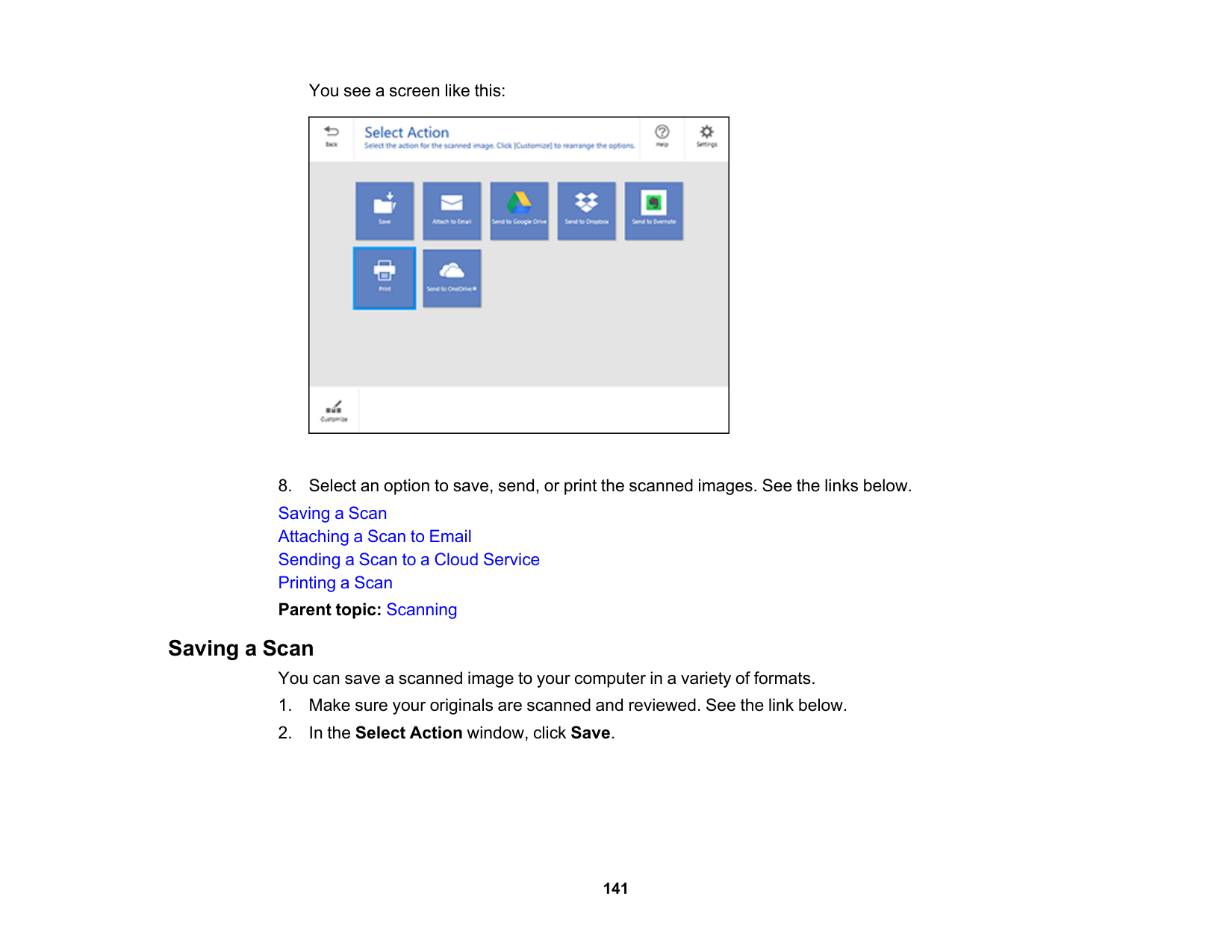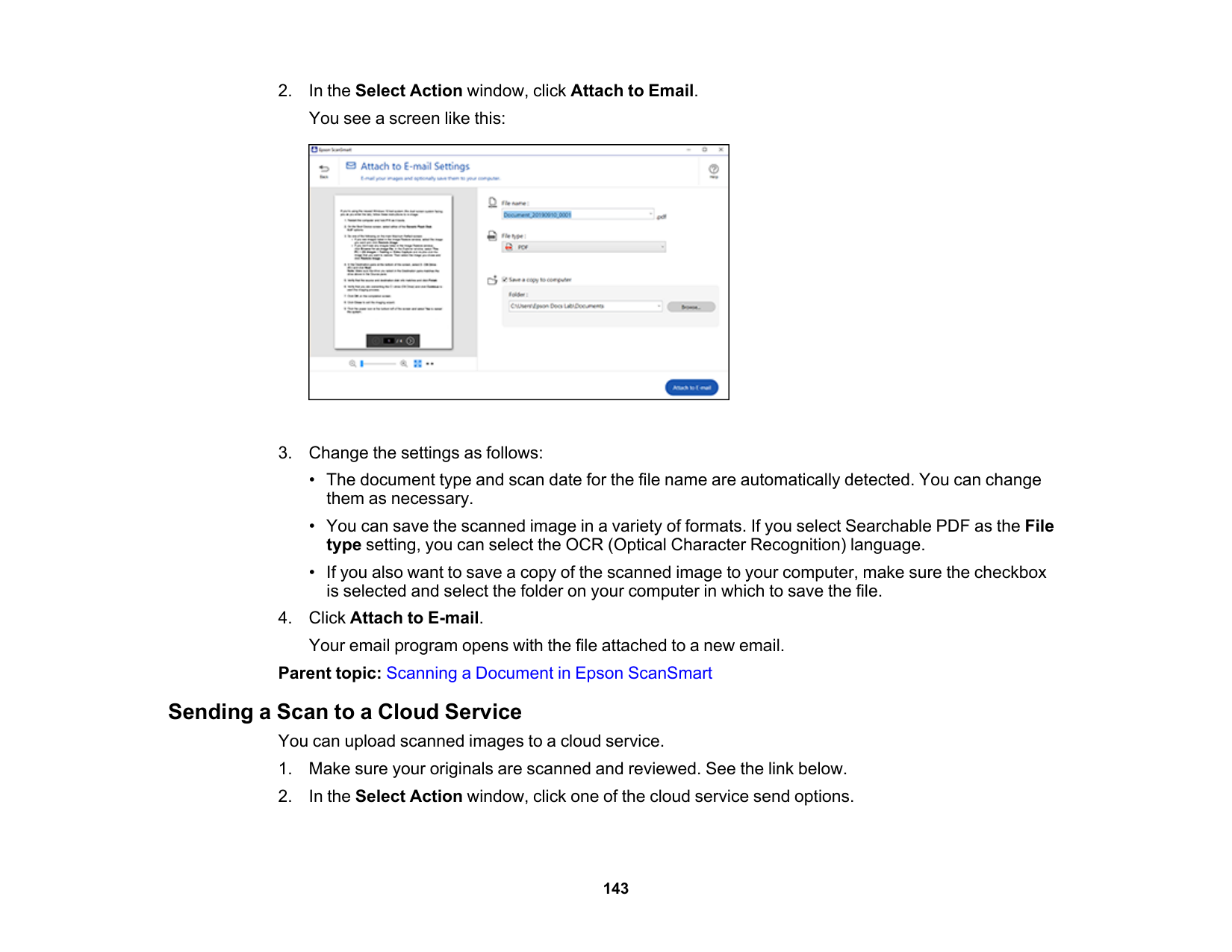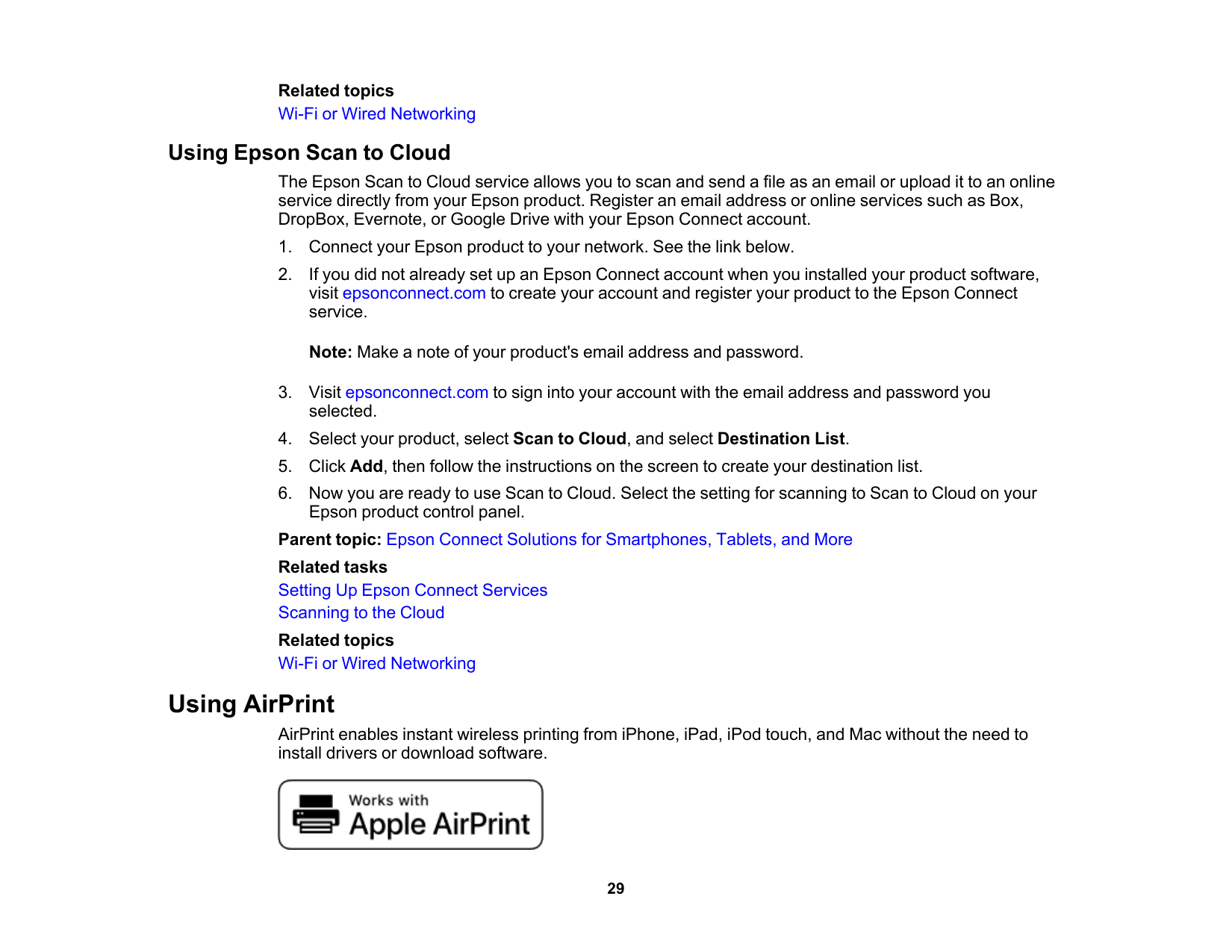29 Related topics Wi-Fi or Wired Networking Using Epson Scan to Cloud The Epson Scan to Cloud service allows you to scan and send a file as an email or upload it to an online service directly from your Epson product. Register an email address or online services such as Box, DropBox, Evernote, or Google Drive with your Epson Connect account.