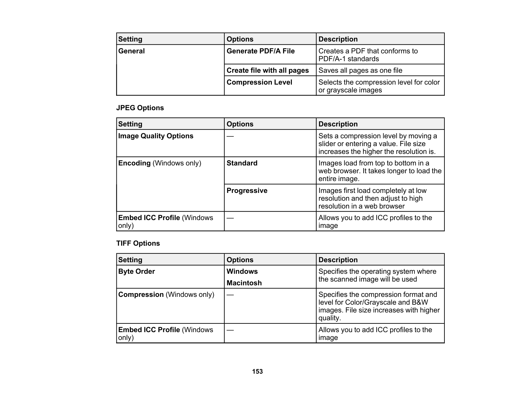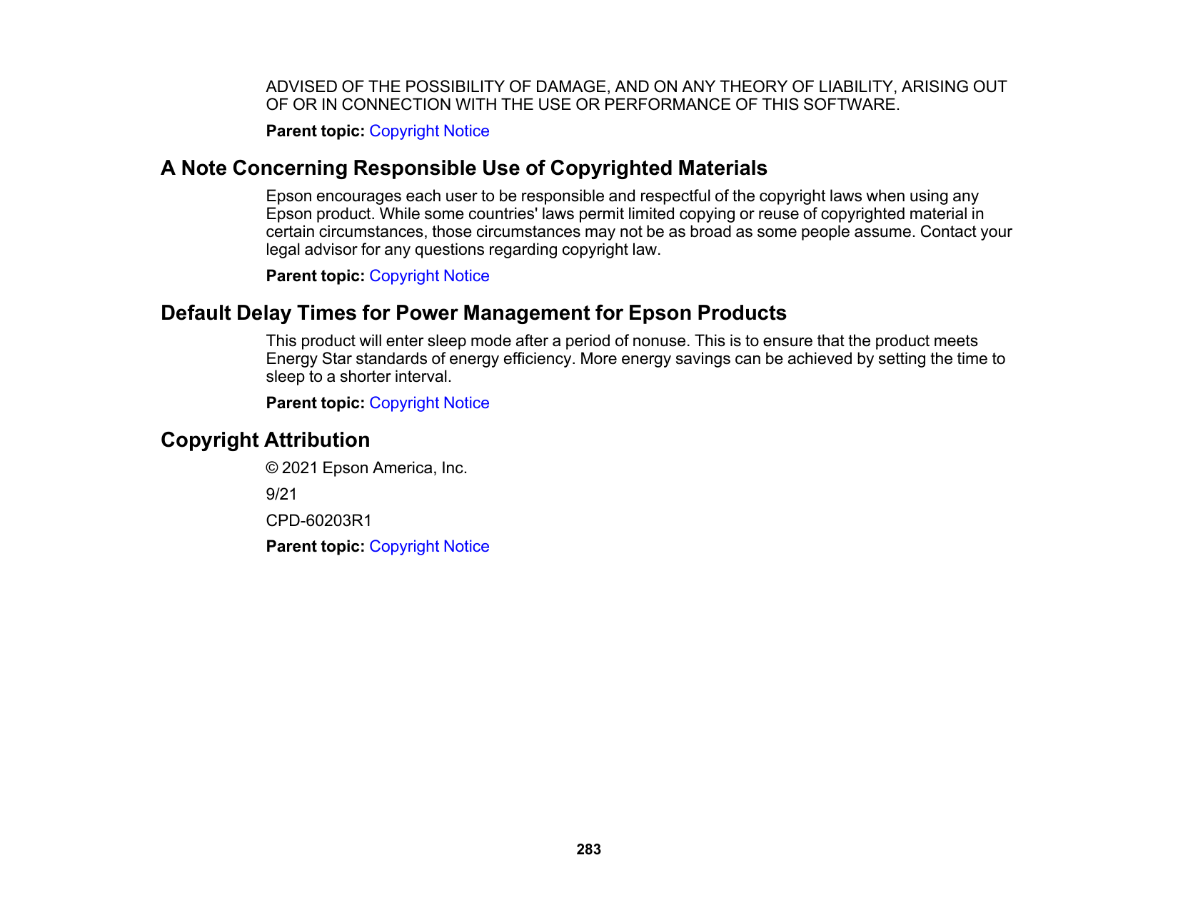 282 designed only for use with this Epson product. Epson is not responsible for any use of this information as applied to other products. Neither Seiko Epson Corporation nor its affiliates shall be liable to the purchaser of this product or third parties for damages, losses, costs, or expenses incurred by purchaser or third parties as a result of: accident, misuse, or abuse of this product or unauthorized modifications, repairs, or alterations to this product, or (excluding the U.S.) failure to strictly comply with Seiko Epson Corporation's operating and maintenance instructions. Seiko Epson Corporation shall not be liable for any damages or problems arising from the use of any options or any consumable products other than those designated as Original Epson Products or Epson Approved Products by Seiko Epson Corporation. Seiko Epson Corporation shall not be held liable for any damage resulting from electromagnetic interference that occurs from the use of any interface cables other than those designated as Epson approved Products by Seiko Epson Corporation. This information is subject to change without notice. libTIFF Software Acknowledgment A Note Concerning Responsible Use of Copyrighted Materials Default Delay Times for Power Management for Epson Products Copyright Attribution Parent topic: Notices libTIFF Software Acknowledgment Copyright © 1988-1997 Sam Leffler Copyright © 1991-1997 Silicon Graphics, Inc. Permission to use, copy, modify, distribute, and sell this software and its documentation for any purpose is hereby granted without fee, provided that (I) the above copyright notices and this permission notice appear in all copies of the software and related documentation, and (ii) the names of Sam Leffler and Silicon Graphics may not be used in any advertising or publicity relating to the software without the specific, prior written permission of Sam Leffler and Silicon Graphics.
