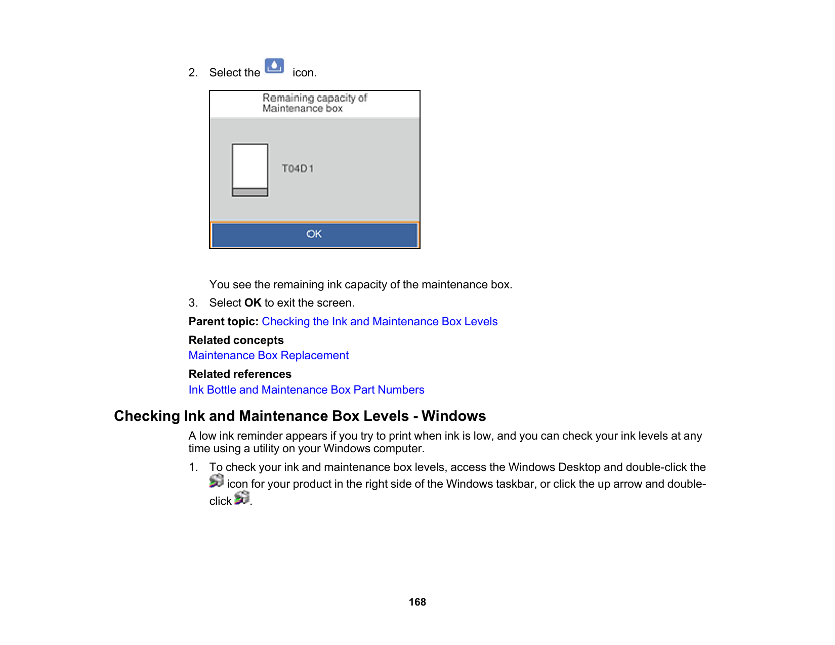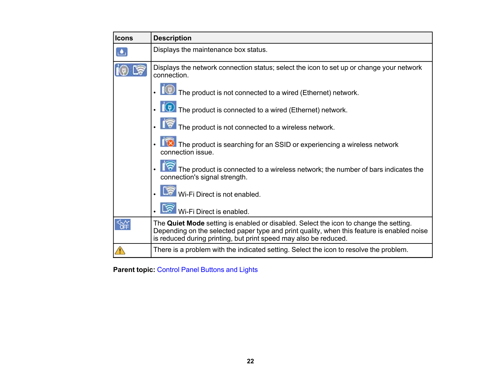 22 Icons Description Displays the maintenance box status. Displays the network connection status; select the icon to set up or change your network connection. • The product is not connected to a wired (Ethernet) network. • The product is connected to a wired (Ethernet) network. • The product is not connected to a wireless network. • The product is searching for an SSID or experiencing a wireless network connection issue. • The product is connected to a wireless network; the number of bars indicates the connection's signal strength. • Wi-Fi Direct is not enabled. • Wi-Fi Direct is enabled. The Quiet Mode setting is enabled or disabled. Select the icon to change the setting. Depending on the selected paper type and print quality, when this feature is enabled noise is reduced during printing, but print speed may also be reduced. There is a problem with the indicated setting. Select the icon to resolve the problem. Parent topic: Control Panel Buttons and Lights