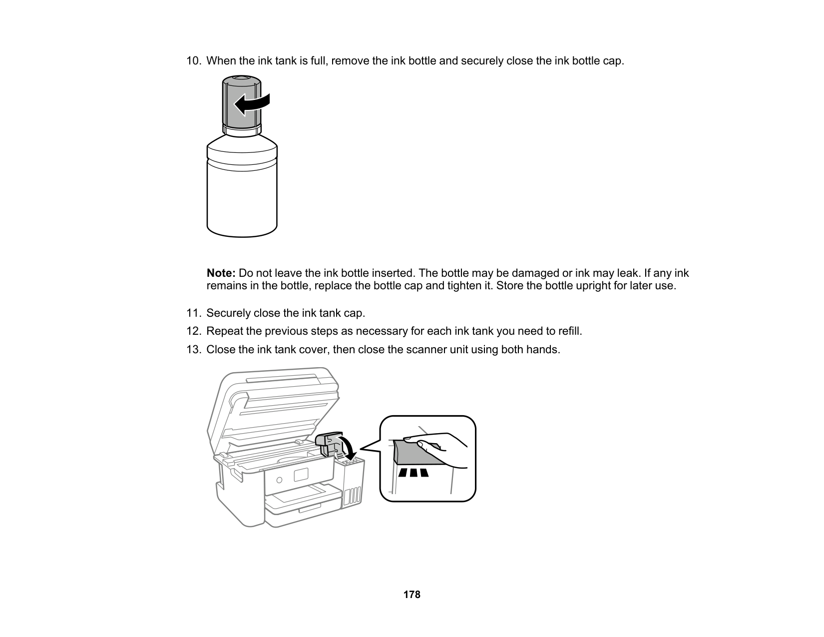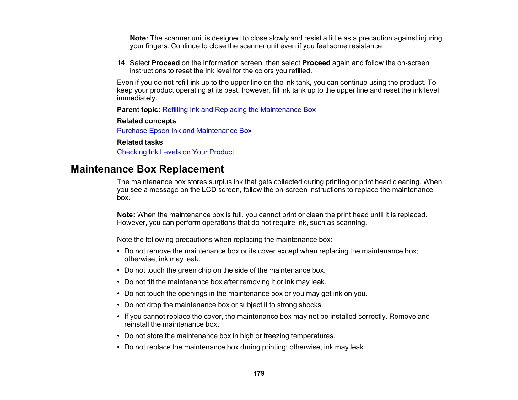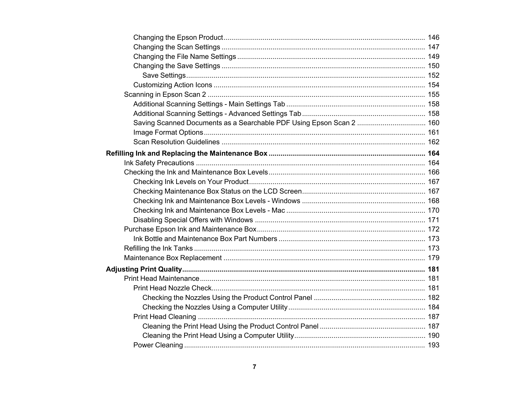 7 Changing the Epson Product....................................................................................................... 146 Changing the Scan Settings ........................................................................................................ 147 Changing the File Name Settings ................................................................................................ 149 Changing the Save Settings ........................................................................................................ 150 Save Settings.......................................................................................................................... 152 Customizing Action Icons ............................................................................................................ 154 Scanning in Epson Scan 2 ............................................................................................................... 155 Additional Scanning Settings - Main Settings Tab ....................................................................... 158 Additional Scanning Settings - Advanced Settings Tab............................................................... 158 Saving Scanned Documents as a Searchable PDF Using Epson Scan 2 ................................... 160 Image Format Options................................................................................................................. 161 Scan Resolution Guidelines ........................................................................................................ 162 Refilling Ink and Replacing the Maintenance Box ................................................................................ 164 Ink Safety Precautions ..................................................................................................................... 164 Checking the Ink and Maintenance Box Levels................................................................................ 166 Checking Ink Levels on Your Product.......................................................................................... 167 Checking Maintenance Box Status on the LCD Screen............................................................... 167 Checking Ink and Maintenance Box Levels - Windows ............................................................... 168 Checking Ink and Maintenance Box Levels - Mac ....................................................................... 170 Disabling Special Offers with Windows ....................................................................................... 171 Purchase Epson Ink and Maintenance Box...................................................................................... 172 Ink Bottle and Maintenance Box Part Numbers ........................................................................... 173 Refilling the Ink Tanks ...................................................................................................................... 173 Maintenance Box Replacement ....................................................................................................... 179 Adjusting Print Quality............................................................................................................................ 181 Print Head Maintenance................................................................................................................... 181 Print Head Nozzle Check............................................................................................................. 181 Checking the Nozzles Using the Product Control Panel ......................................................... 182 Checking the Nozzles Using a Computer Utility...................................................................... 184 Print Head Cleaning .................................................................................................................... 187 Cleaning the Print Head Using the Product Control Panel ...................................................... 187 Cleaning the Print Head Using a Computer Utility................................................................... 190 Power Cleaning ........................................................................................................................... 193