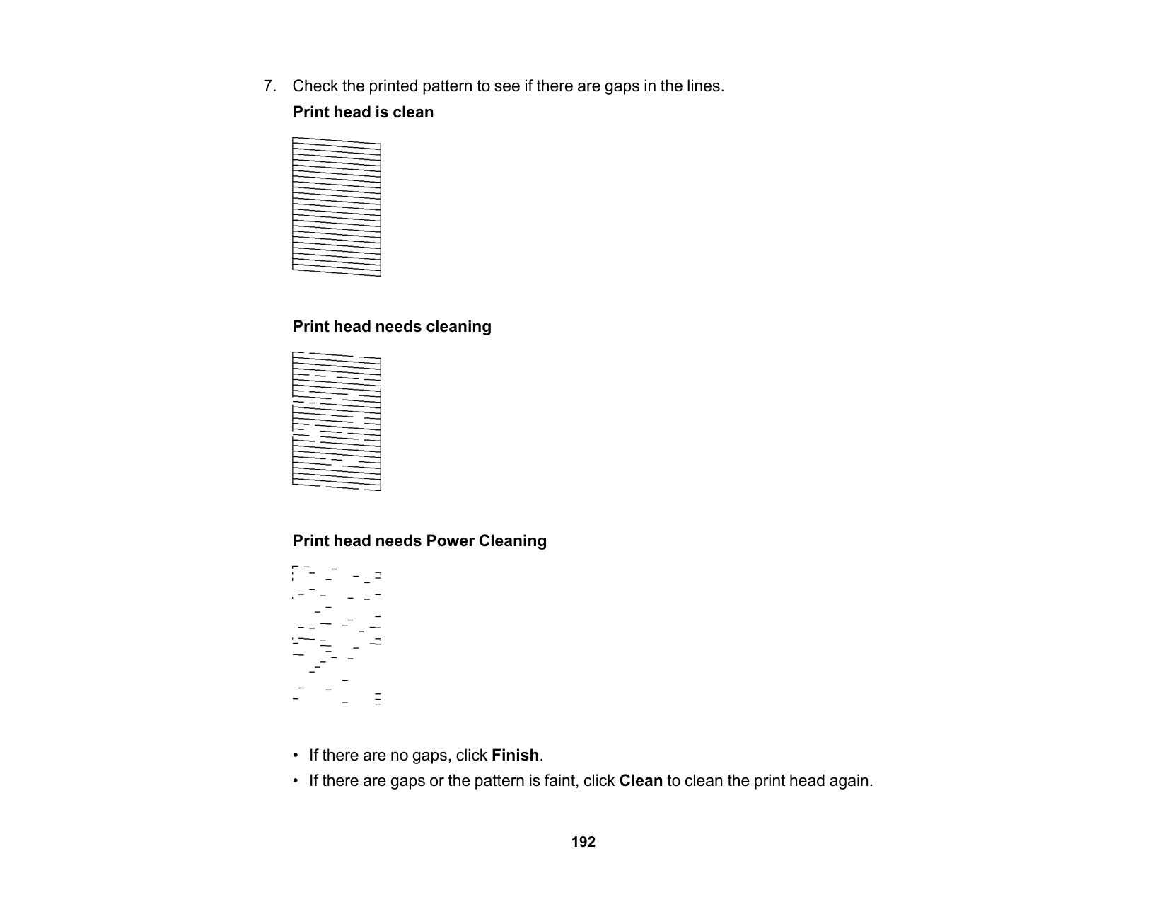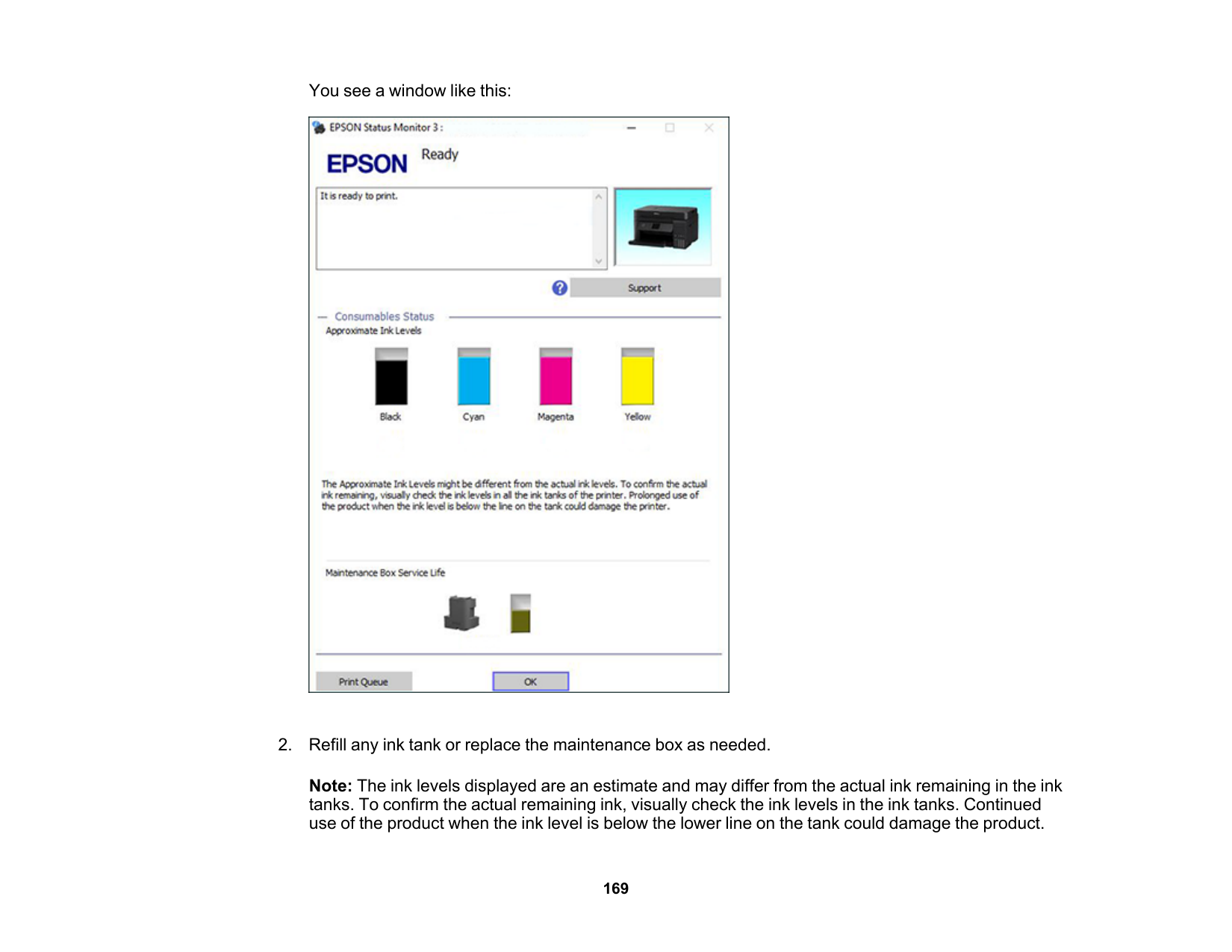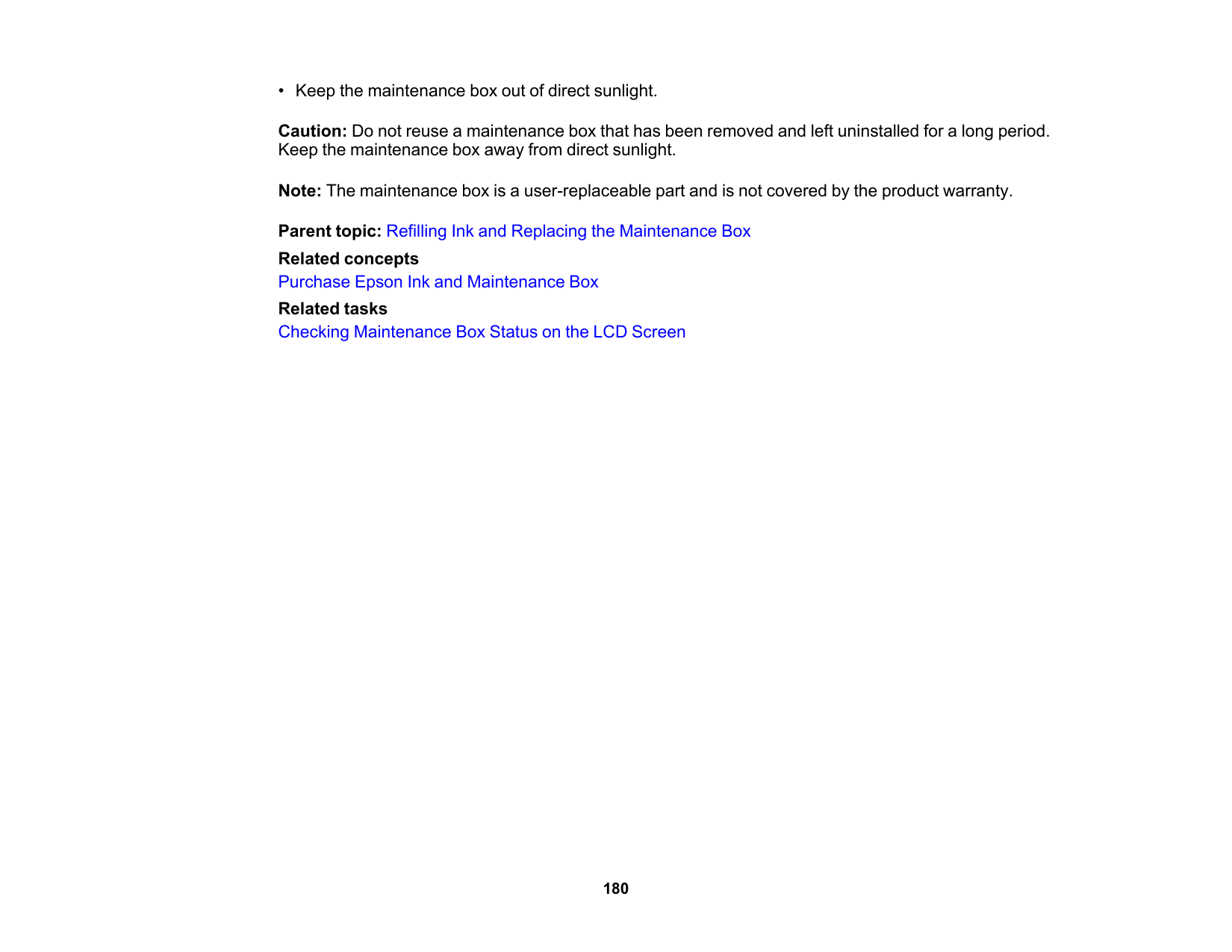 7 Changing the Epson Product....................................................................................................... 146 Changing the Scan Settings ........................................................................................................ 147 Changing the File Name Settings ................................................................................................ 149 Changing the Save Settings ........................................................................................................ 150 Save Settings.......................................................................................................................... 152 Customizing Action Icons ............................................................................................................ 154 Scanning in Epson Scan 2 ............................................................................................................... 155 Additional Scanning Settings - Main Settings Tab ....................................................................... 158 Additional Scanning Settings - Advanced Settings Tab............................................................... 158 Saving Scanned Documents as a Searchable PDF Using Epson Scan 2 ................................... 160 Image Format Options................................................................................................................. 161 Scan Resolution Guidelines ........................................................................................................ 162 Refilling Ink and Replacing the Maintenance Box ................................................................................ 164 Ink Safety Precautions ..................................................................................................................... 164 Checking the Ink and Maintenance Box Levels................................................................................ 166 Checking Ink Levels on Your Product.......................................................................................... 167 Checking Maintenance Box Status on the LCD Screen............................................................... 167 Checking Ink and Maintenance Box Levels - Windows ............................................................... 168 Checking Ink and Maintenance Box Levels - Mac ....................................................................... 170 Disabling Special Offers with Windows ....................................................................................... 171 Purchase Epson Ink and Maintenance Box...................................................................................... 172 Ink Bottle and Maintenance Box Part Numbers ........................................................................... 173 Refilling the Ink Tanks ...................................................................................................................... 173 Maintenance Box Replacement ....................................................................................................... 179 Adjusting Print Quality............................................................................................................................ 181 Print Head Maintenance................................................................................................................... 181 Print Head Nozzle Check............................................................................................................. 181 Checking the Nozzles Using the Product Control Panel ......................................................... 182 Checking the Nozzles Using a Computer Utility...................................................................... 184 Print Head Cleaning .................................................................................................................... 187 Cleaning the Print Head Using the Product Control Panel ...................................................... 187 Cleaning the Print Head Using a Computer Utility................................................................... 190 Power Cleaning ........................................................................................................................... 193