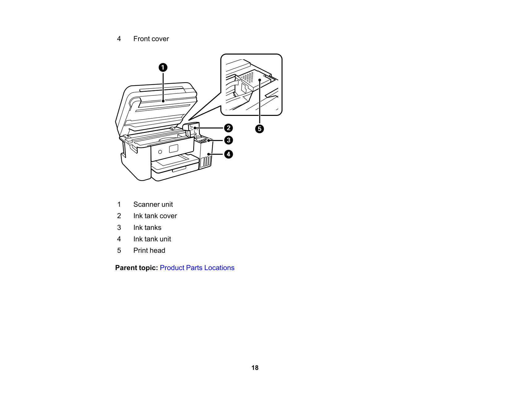 18 4 Front cover 1 Scanner unit 2 Ink tank cover 3 Ink tanks 4 Ink tank unit 5 Print head Parent topic: Product Parts Locations