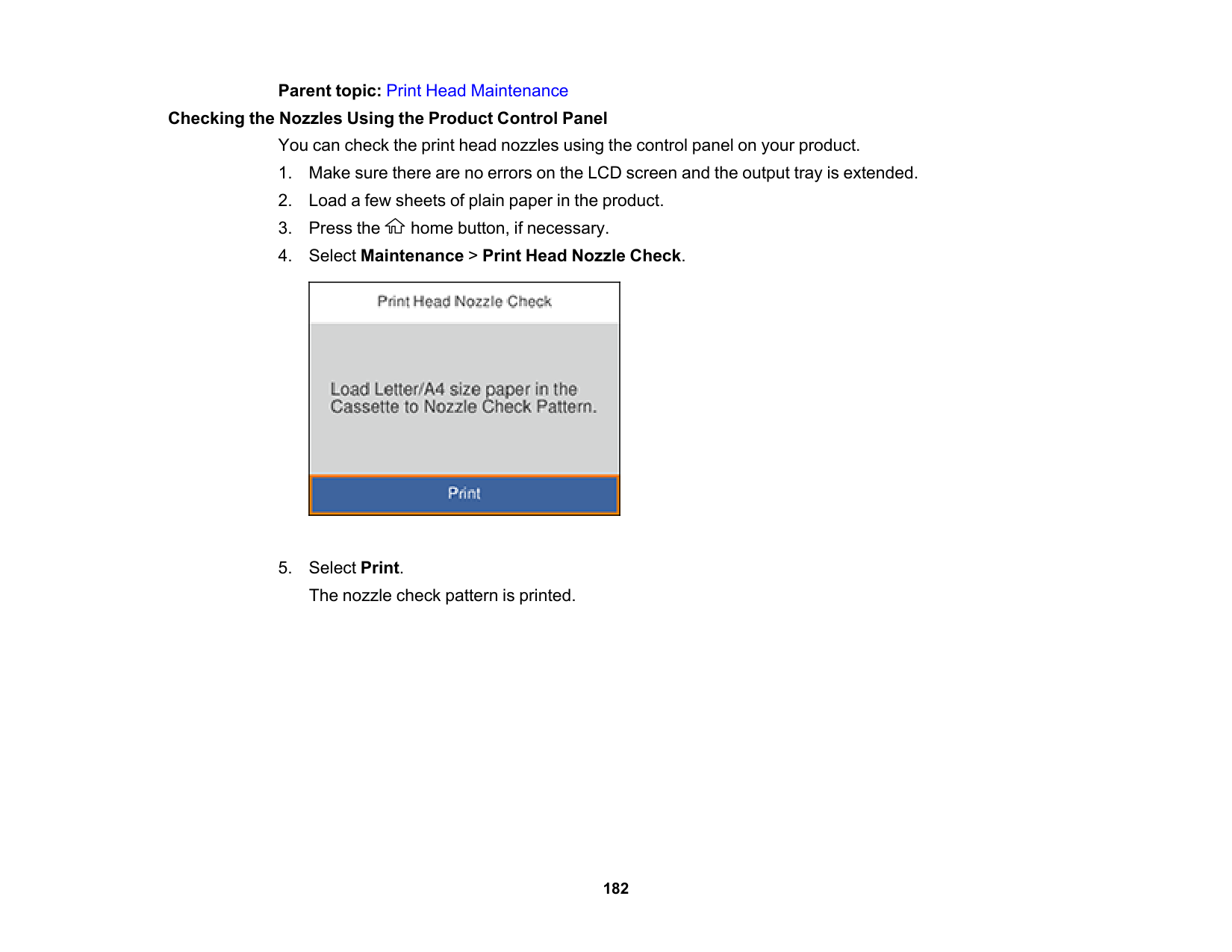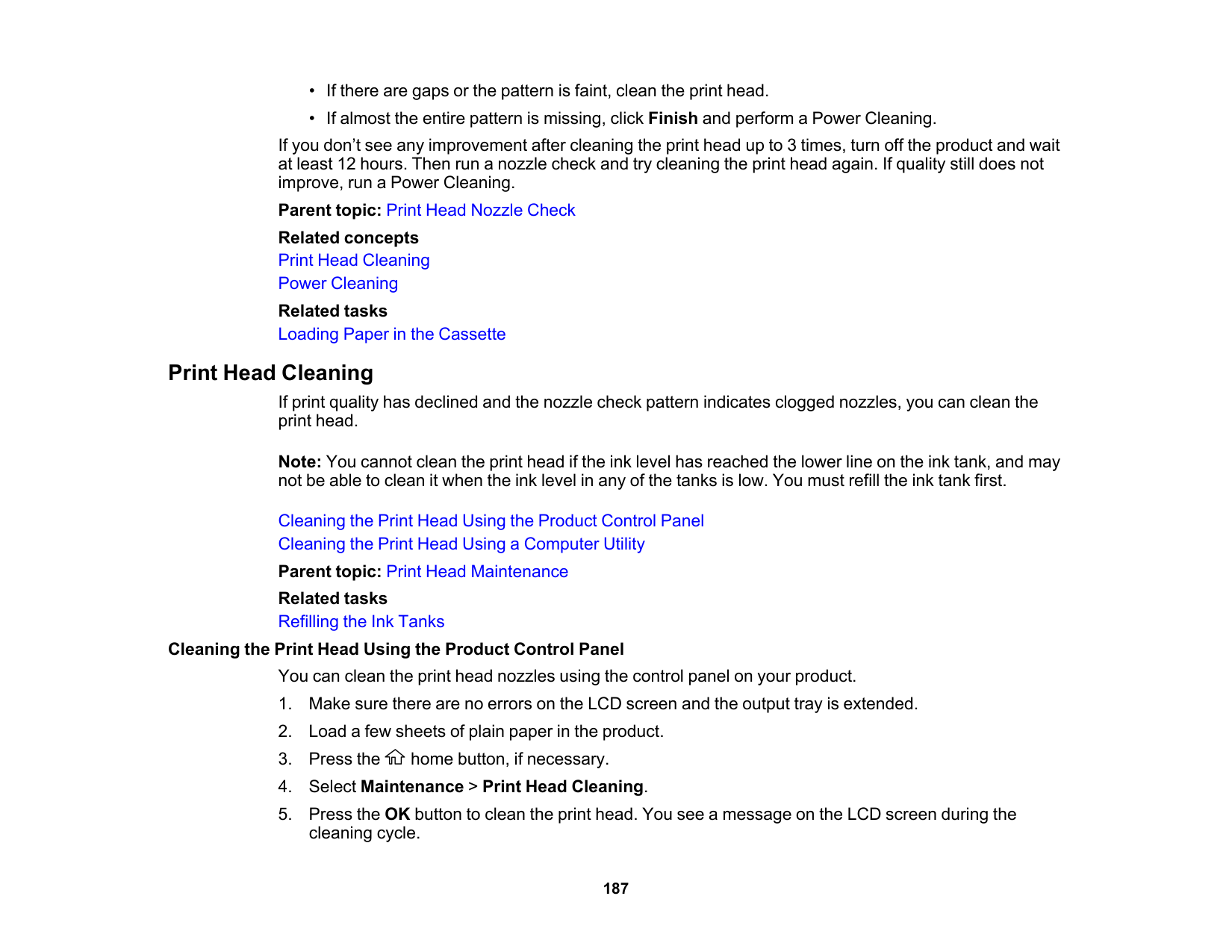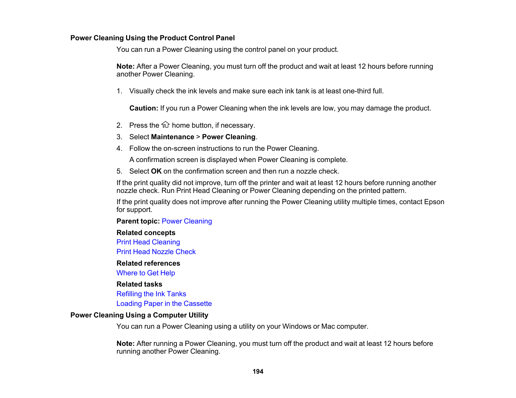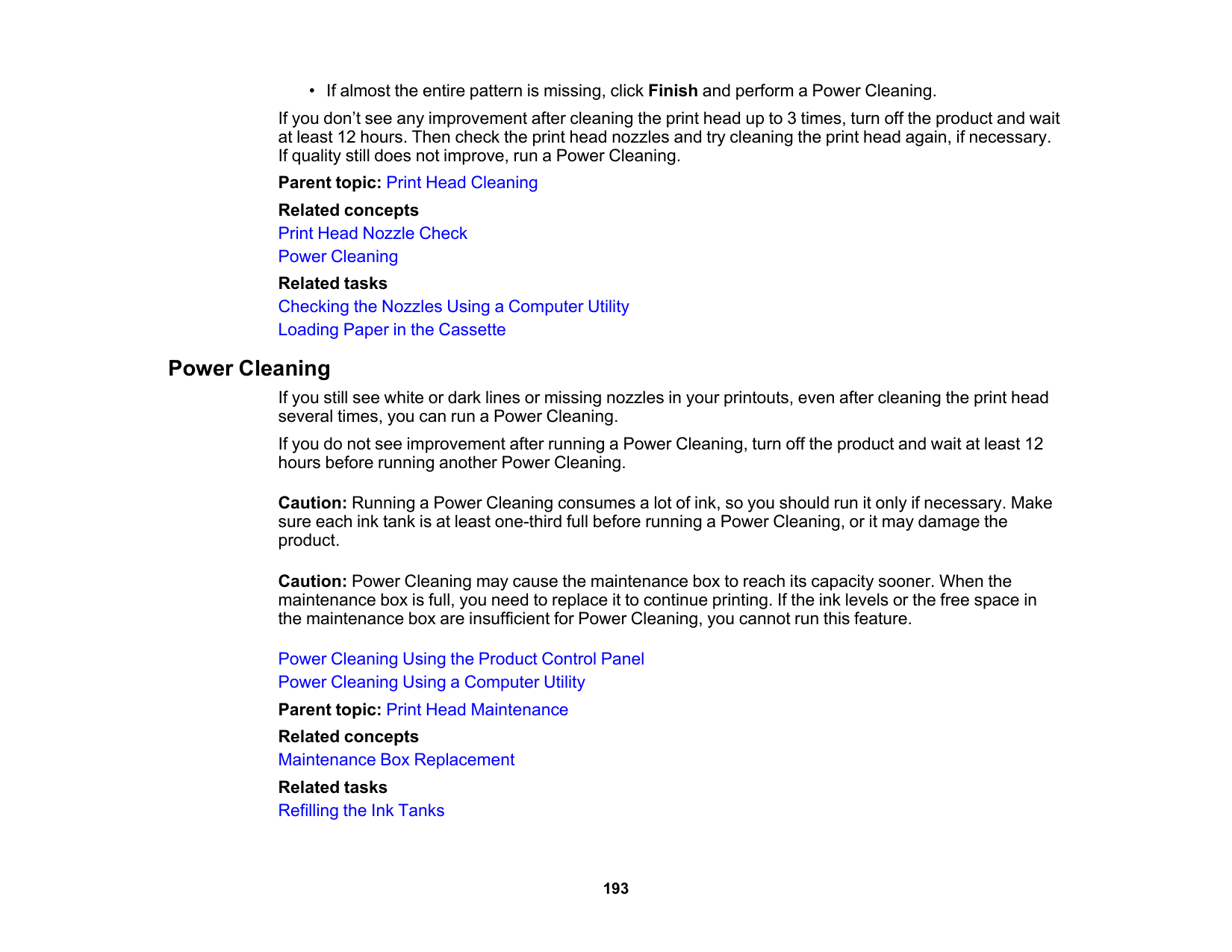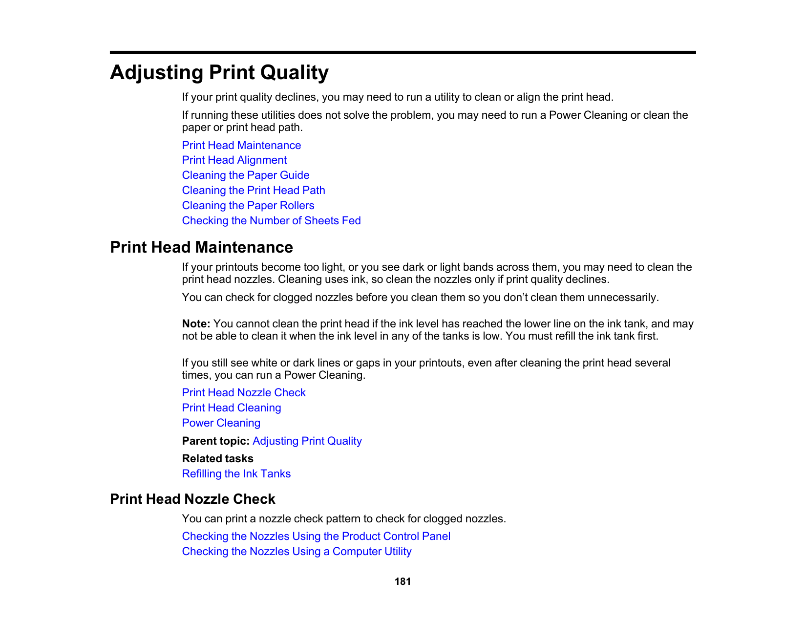 249 Print Head Alignment Print Head Nozzle Check Power Cleaning Checking the Ink and Maintenance Box Levels Related tasks Refilling the Ink Tanks Aligning the Print Head Using the Product Control Panel Cleaning the Paper Guide Cleaning the Print Head Path Related topics Loading Paper Grainy Printout If your printouts are grainy, try these solutions: