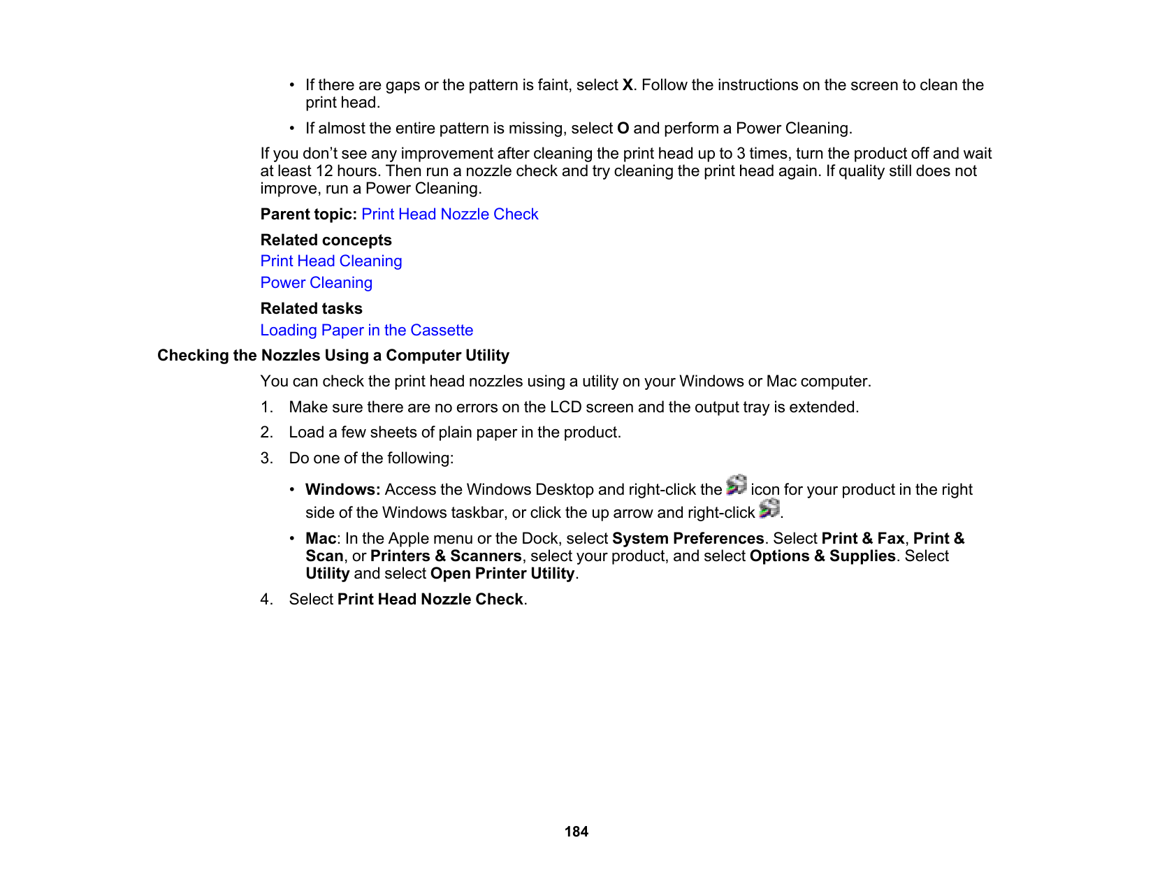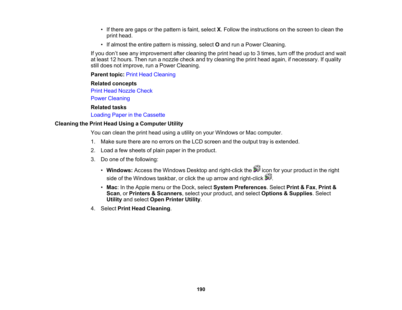 250 Parent topic: Solving Print Quality Problems Related concepts Print Head Nozzle Check Print Head Cleaning Power Cleaning Print Head Alignment Related tasks Refilling the Ink Tanks Loading Paper in the Cassette Selecting Basic Print Settings - Windows Selecting Additional Layout and Print Options - Windows Selecting Basic Print Settings - Mac Selecting Printing Preferences - Mac Incorrect Colors If your printouts have incorrect colors, try these solutions: