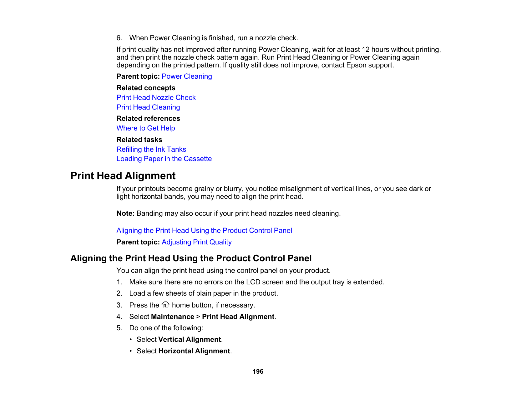 246 Related tasks Refilling the Ink Tanks Selecting Basic Print Settings - Windows Aligning the Print Head Using the Product Control Panel Selecting Printing Preferences - Mac Selecting Additional Layout and Print Options - Windows Selecting Basic Print Settings - Mac Related topics Loading Paper Blurry or Smeared Printout If your printouts are blurry or smeared, try these solutions:
