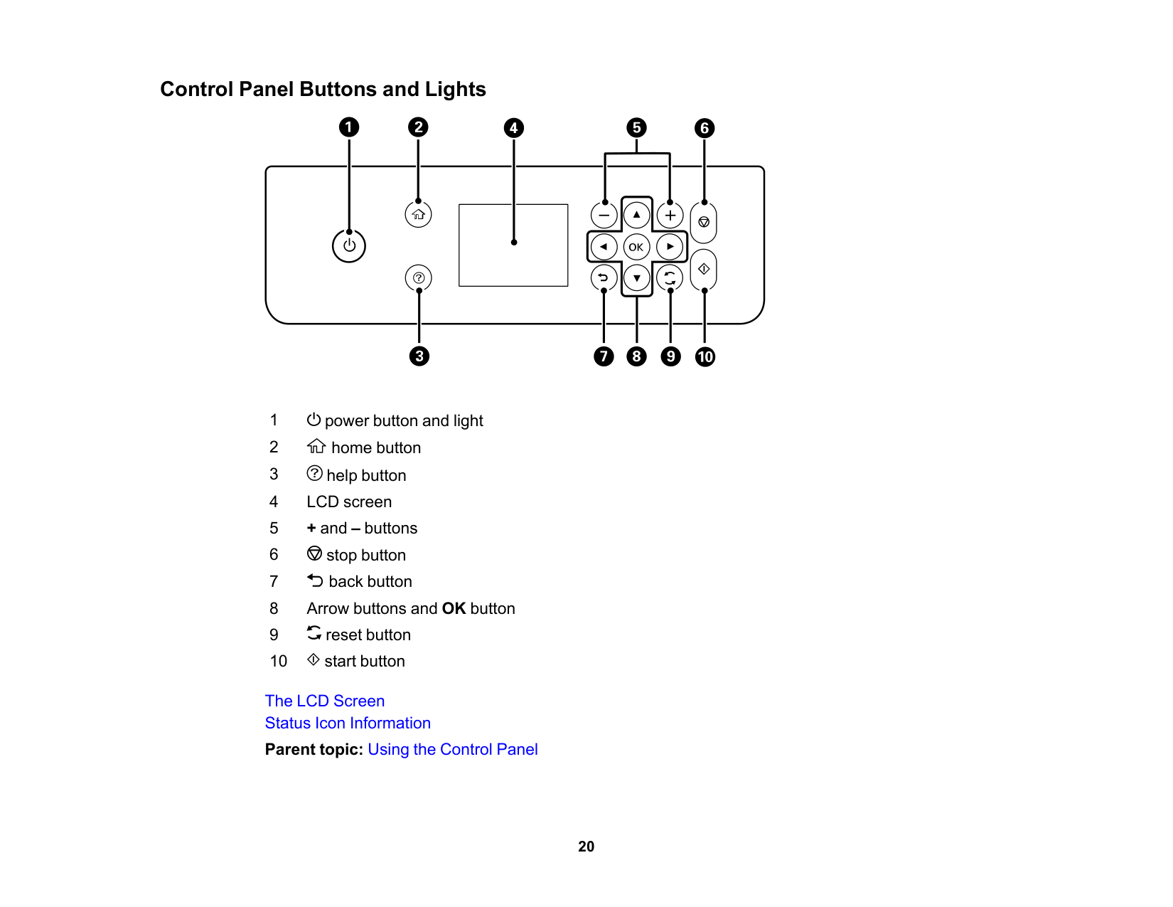 20 Control Panel Buttons and Lights 1 power button and light 2 home button 3 help button 4 LCD screen 5 + and – buttons 6 stop button 7 back button 8 Arrow buttons and OK button 9 reset button 10 start button The LCD Screen Status Icon Information Parent topic: Using the Control Panel