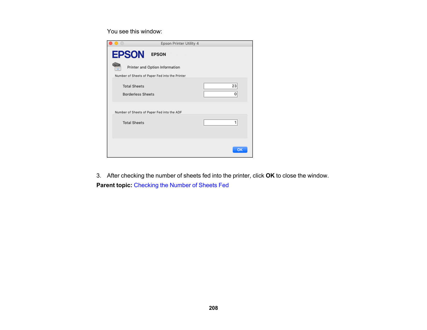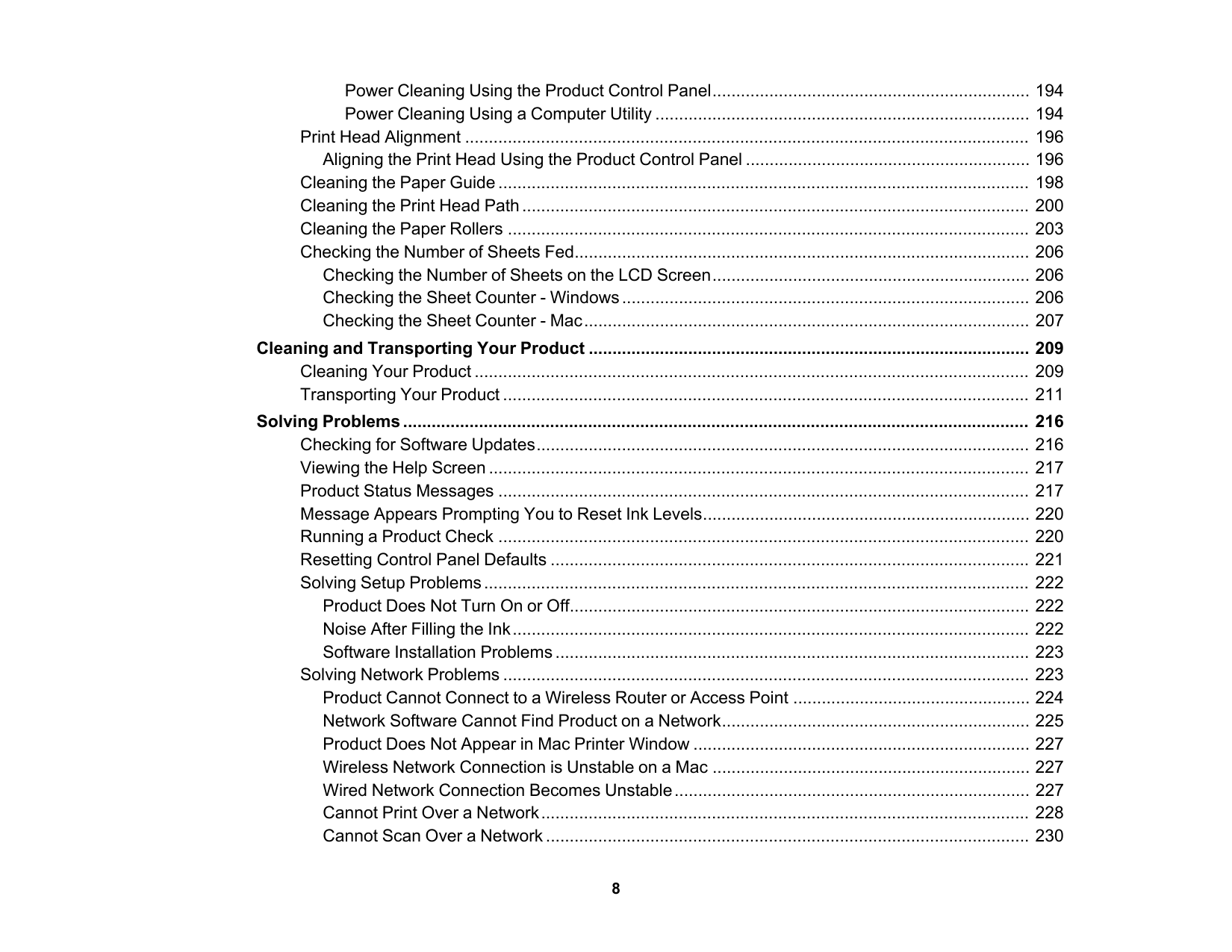 8 Power Cleaning Using the Product Control Panel................................................................... 194 Power Cleaning Using a Computer Utility ............................................................................... 194 Print Head Alignment ....................................................................................................................... 196 Aligning the Print Head Using the Product Control Panel ............................................................ 196 Cleaning the Paper Guide ................................................................................................................ 198 Cleaning the Print Head Path........................................................................................................... 200 Cleaning the Paper Rollers .............................................................................................................. 203 Checking the Number of Sheets Fed................................................................................................ 206 Checking the Number of Sheets on the LCD Screen................................................................... 206 Checking the Sheet Counter - Windows...................................................................................... 206 Checking the Sheet Counter - Mac.............................................................................................. 207 Cleaning and Transporting Your Product ............................................................................................. 209 Cleaning Your Product ..................................................................................................................... 209 Transporting Your Product ............................................................................................................... 211 Solving Problems.................................................................................................................................... 216 Checking for Software Updates........................................................................................................ 216 Viewing the Help Screen .................................................................................................................. 217 Product Status Messages ................................................................................................................ 217 Message Appears Prompting You to Reset Ink Levels..................................................................... 220 Running a Product Check ................................................................................................................ 220 Resetting Control Panel Defaults ..................................................................................................... 221 Solving Setup Problems................................................................................................................... 222 Product Does Not Turn On or Off................................................................................................. 222 Noise After Filling the Ink............................................................................................................. 222 Software Installation Problems.................................................................................................... 223 Solving Network Problems ............................................................................................................... 223 Product Cannot Connect to a Wireless Router or Access Point .................................................. 224 Network Software Cannot Find Product on a Network................................................................. 225 Product Does Not Appear in Mac Printer Window ....................................................................... 227 Wireless Network Connection is Unstable on a Mac ................................................................... 227 Wired Network Connection Becomes Unstable........................................................................... 227 Cannot Print Over a Network....................................................................................................... 228 Cannot Scan Over a Network ...................................................................................................... 230