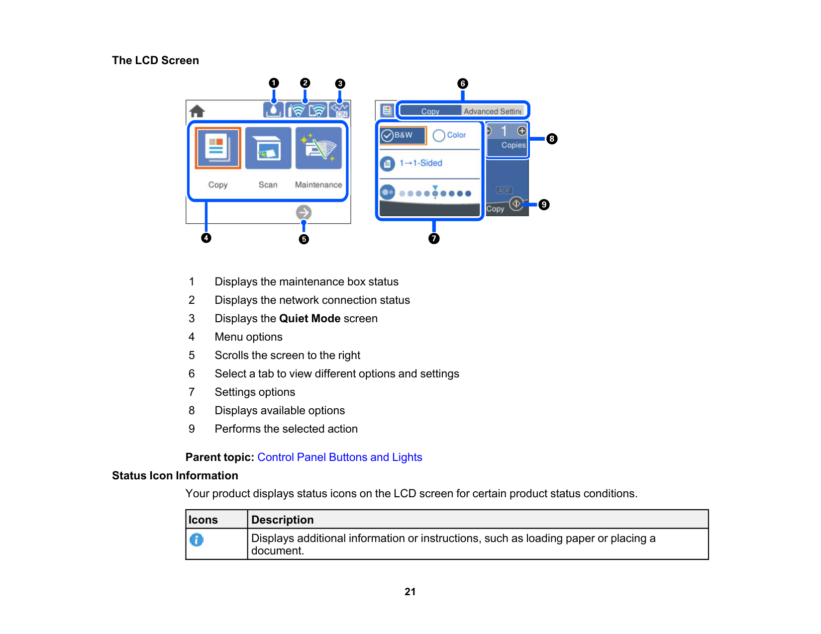 21 The LCD Screen 1 Displays the maintenance box status 2 Displays the network connection status 3 Displays the Quiet Mode screen 4 Menu options 5 Scrolls the screen to the right 6 Select a tab to view different options and settings 7 Settings options 8 Displays available options 9 Performs the selected action Parent topic: Control Panel Buttons and Lights Status Icon Information Your product displays status icons on the LCD screen for certain product status conditions. Icons Description Displays additional information or instructions, such as loading paper or placing a document.