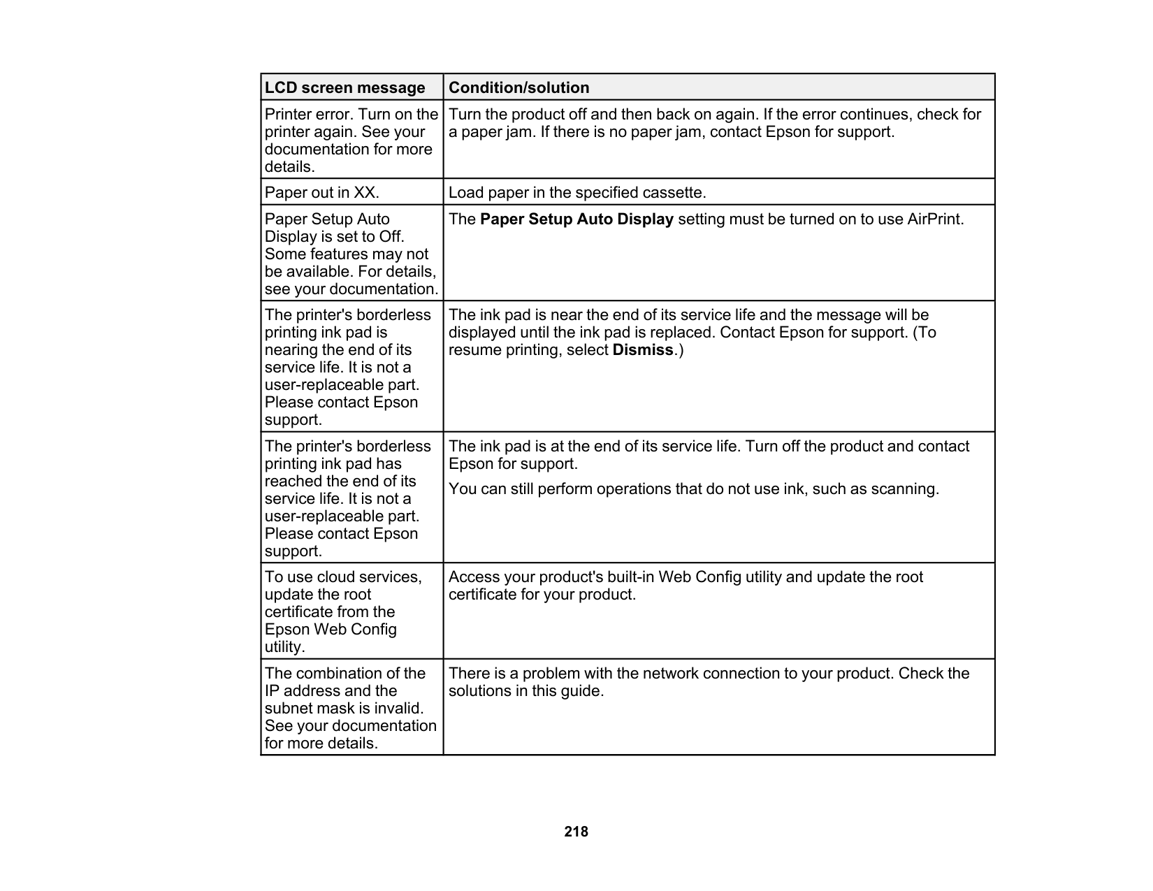 218 LCD screen message Condition/solution Printer error. Turn on the printer again. See your documentation for more details. Turn the product off and then back on again. If the error continues, check for a paper jam. If there is no paper jam, contact Epson for support. Paper out in XX. Load paper in the specified cassette. Paper Setup Auto Display is set to Off. Some features may not be available. For details, see your documentation. The Paper Setup Auto Display setting must be turned on to use AirPrint. The printer's borderless printing ink pad is nearing the end of its service life. It is not a user-replaceable part. Please contact Epson support. The ink pad is near the end of its service life and the message will be displayed until the ink pad is replaced. Contact Epson for support. (To resume printing, select Dismiss.) The printer's borderless printing ink pad has reached the end of its service life. It is not a user-replaceable part. Please contact Epson support. The ink pad is at the end of its service life. Turn off the product and contact Epson for support. You can still perform operations that do not use ink, such as scanning. To use cloud services, update the root certificate from the Epson Web Config utility. Access your product's built-in Web Config utility and update the root certificate for your product. The combination of the IP address and the subnet mask is invalid. See your documentation for more details. There is a problem with the network connection to your product. Check the solutions in this guide.