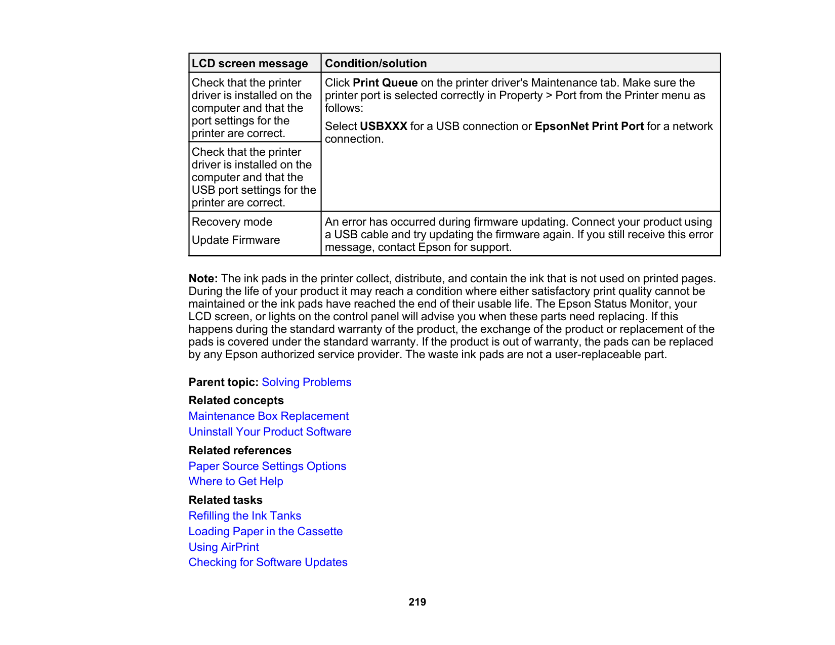 219 LCD screen message Condition/solution Check that the printer driver is installed on the computer and that the port settings for the printer are correct. Click Print Queue on the printer driver's Maintenance tab. Make sure the printer port is selected correctly in Property > Port from the Printer menu as follows: Select USBXXX for a USB connection or EpsonNet Print Port for a network connection. Check that the printer driver is installed on the computer and that the USB port settings for the printer are correct. Recovery mode Update Firmware An error has occurred during firmware updating. Connect your product using a USB cable and try updating the firmware again. If you still receive this error message, contact Epson for support. Note: The ink pads in the printer collect, distribute, and contain the ink that is not used on printed pages. During the life of your product it may reach a condition where either satisfactory print quality cannot be maintained or the ink pads have reached the end of their usable life. The Epson Status Monitor, your LCD screen, or lights on the control panel will advise you when these parts need replacing. If this happens during the standard warranty of the product, the exchange of the product or replacement of the pads is covered under the standard warranty. If the product is out of warranty, the pads can be replaced by any Epson authorized service provider. The waste ink pads are not a user-replaceable part. Parent topic: Solving Problems Related concepts Maintenance Box Replacement Uninstall Your Product Software Related references Paper Source Settings Options Where to Get Help Related tasks Refilling the Ink Tanks Loading Paper in the Cassette Using AirPrint Checking for Software Updates