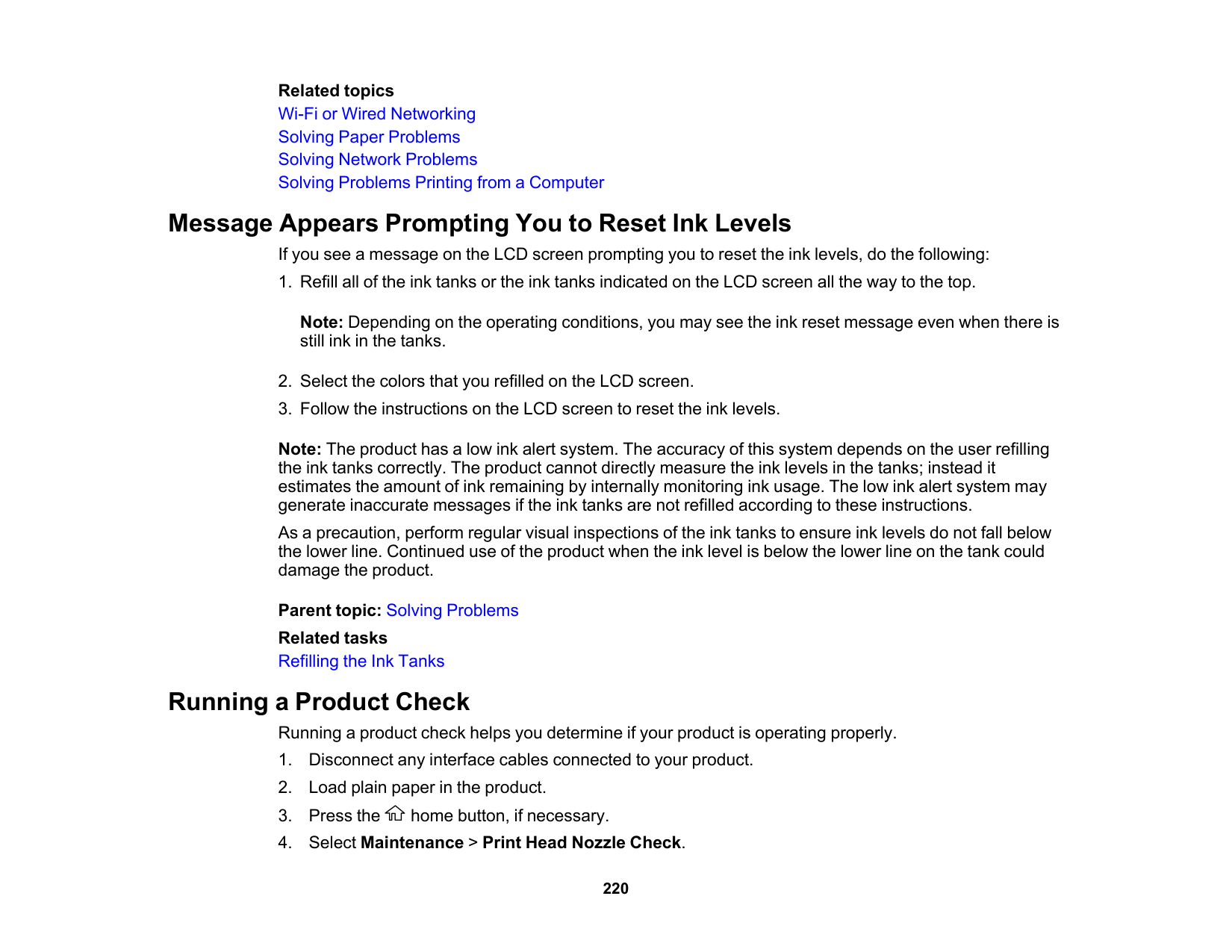 220 Related topics Wi-Fi or Wired Networking Solving Paper Problems Solving Network Problems Solving Problems Printing from a Computer Message Appears Prompting You to Reset Ink Levels If you see a message on the LCD screen prompting you to reset the ink levels, do the following: