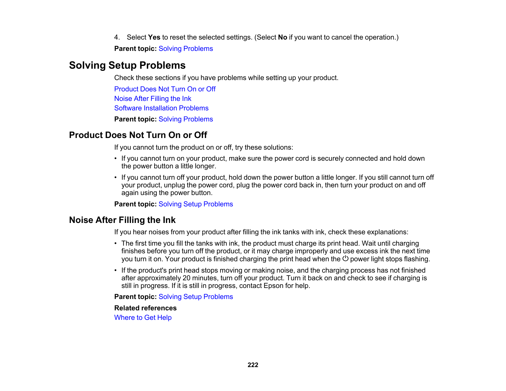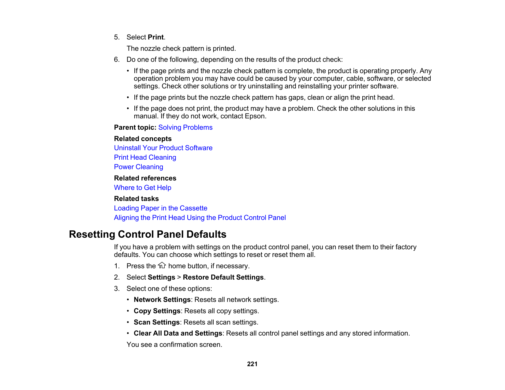 216 Solving Problems Check these sections for solutions to problems you may have using your product. Checking for Software Updates Viewing the Help Screen Product Status Messages Message Appears Prompting You to Reset Ink Levels Running a Product Check Resetting Control Panel Defaults Solving Setup Problems Solving Network Problems Solving Copying Problems Solving Paper Problems Solving Problems Printing from a Computer Solving Page Layout and Content Problems Solving Print Quality Problems Solving Scanning Problems Solving Scanned Image Quality Problems Uninstall Your Product Software Where to Get Help Checking for Software Updates It's a good idea to check Epson's support website occasionally for free updates to your product software. Visit epson.com/support (U.S.) or epson.ca/support (Canada) and select your product.