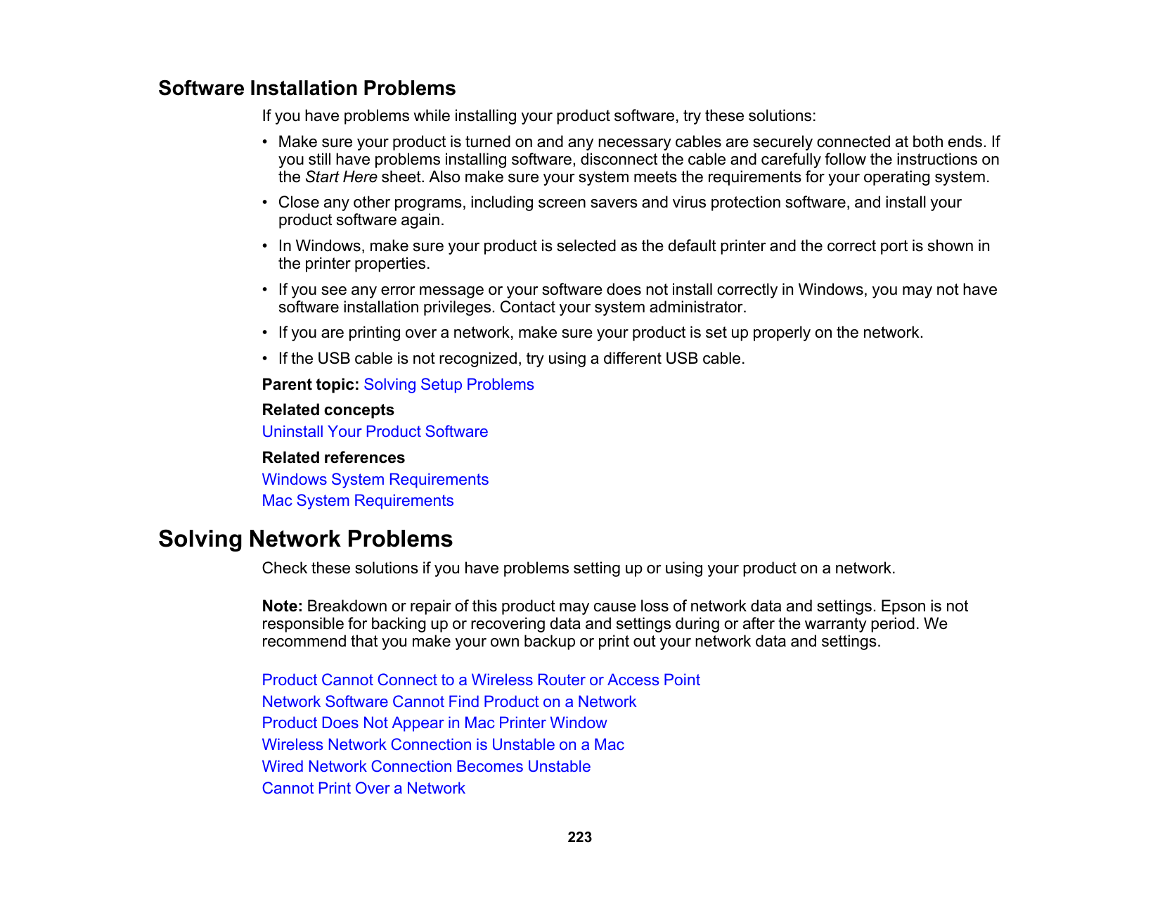 223 Software Installation Problems If you have problems while installing your product software, try these solutions: