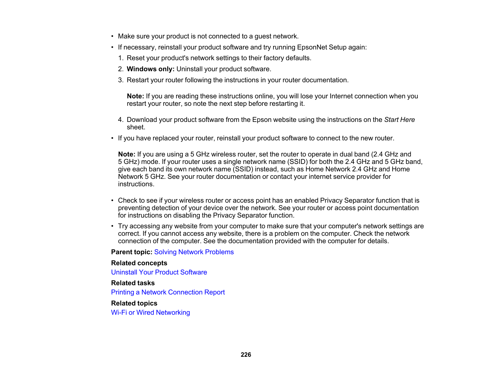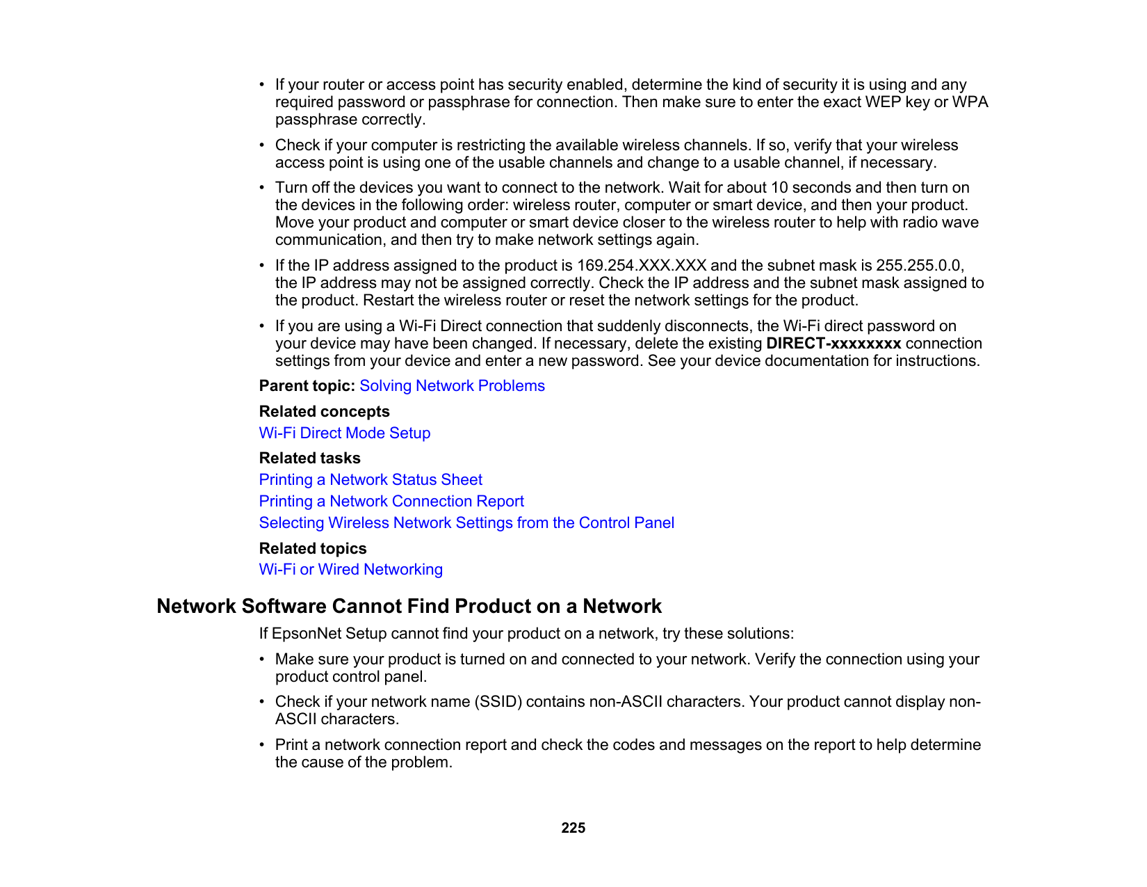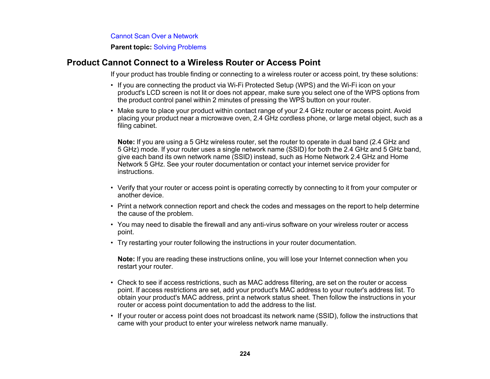 224 Cannot Scan Over a Network Parent topic: Solving Problems Product Cannot Connect to a Wireless Router or Access Point If your product has trouble finding or connecting to a wireless router or access point, try these solutions: