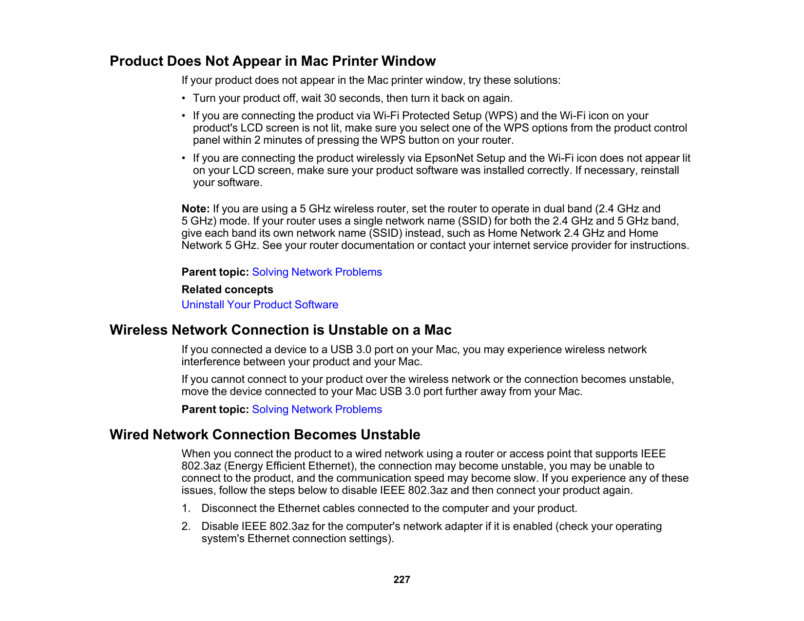 227 Product Does Not Appear in Mac Printer Window If your product does not appear in the Mac printer window, try these solutions: