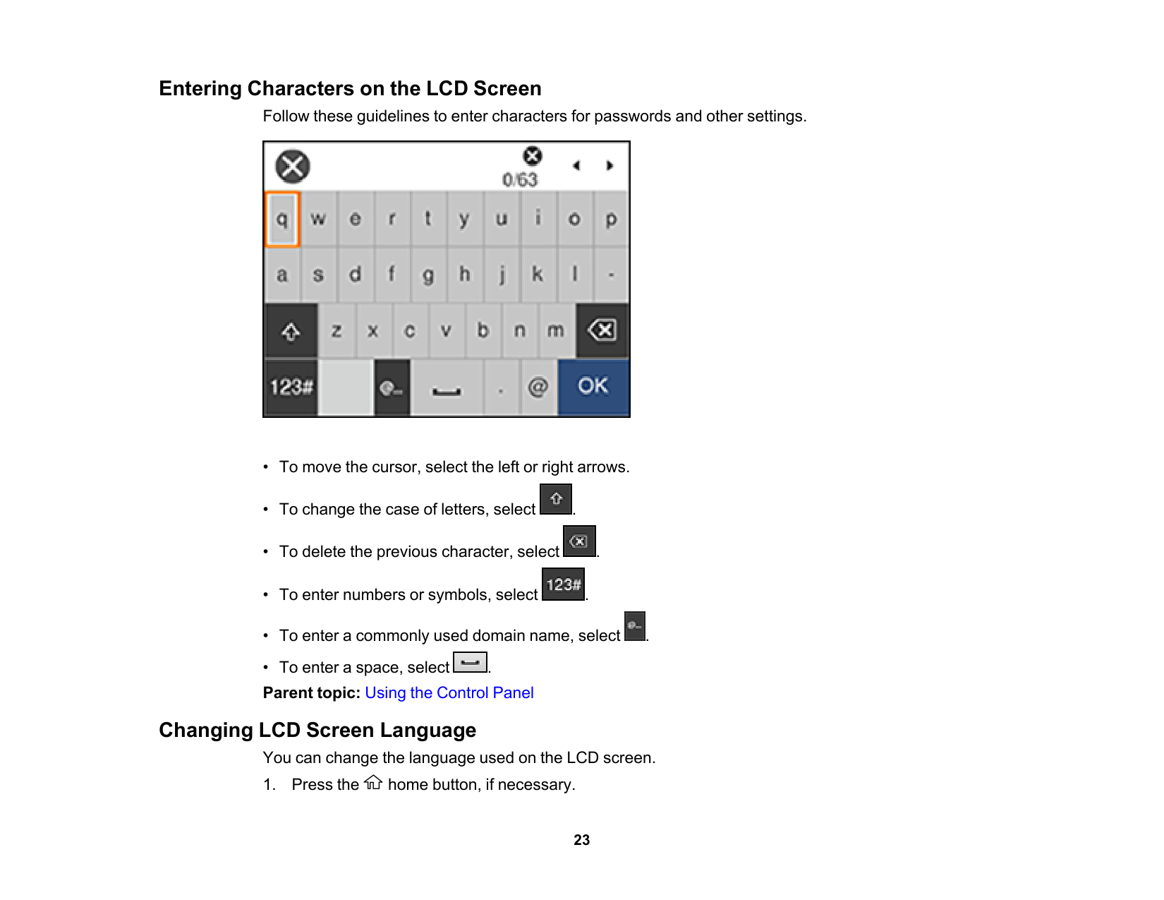 23 Entering Characters on the LCD Screen Follow these guidelines to enter characters for passwords and other settings.