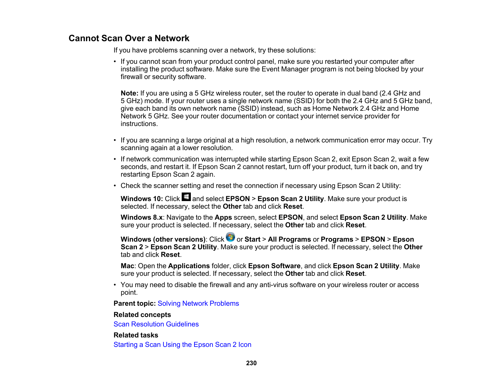 230 Cannot Scan Over a Network If you have problems scanning over a network, try these solutions: