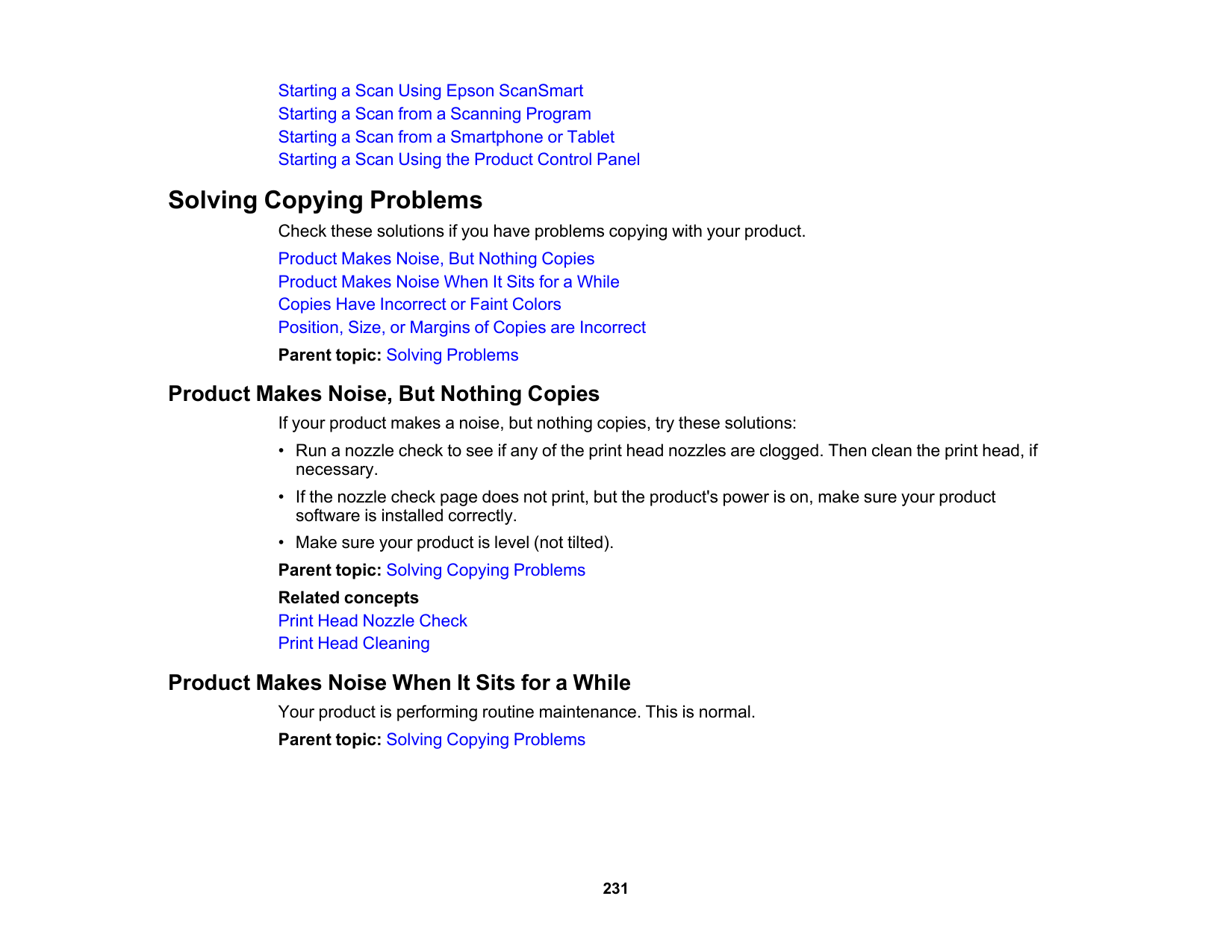 231 Starting a Scan Using Epson ScanSmart Starting a Scan from a Scanning Program Starting a Scan from a Smartphone or Tablet Starting a Scan Using the Product Control Panel Solving Copying Problems Check these solutions if you have problems copying with your product. Product Makes Noise, But Nothing Copies Product Makes Noise When It Sits for a While Copies Have Incorrect or Faint Colors Position, Size, or Margins of Copies are Incorrect Parent topic: Solving Problems Product Makes Noise, But Nothing Copies If your product makes a noise, but nothing copies, try these solutions: