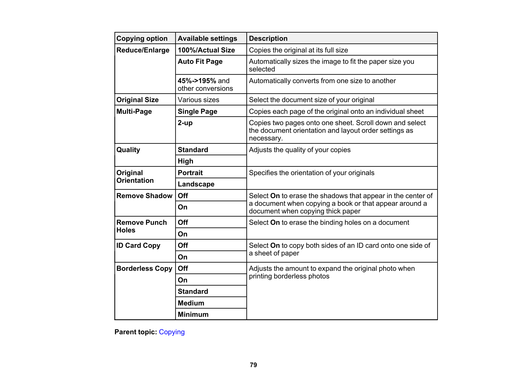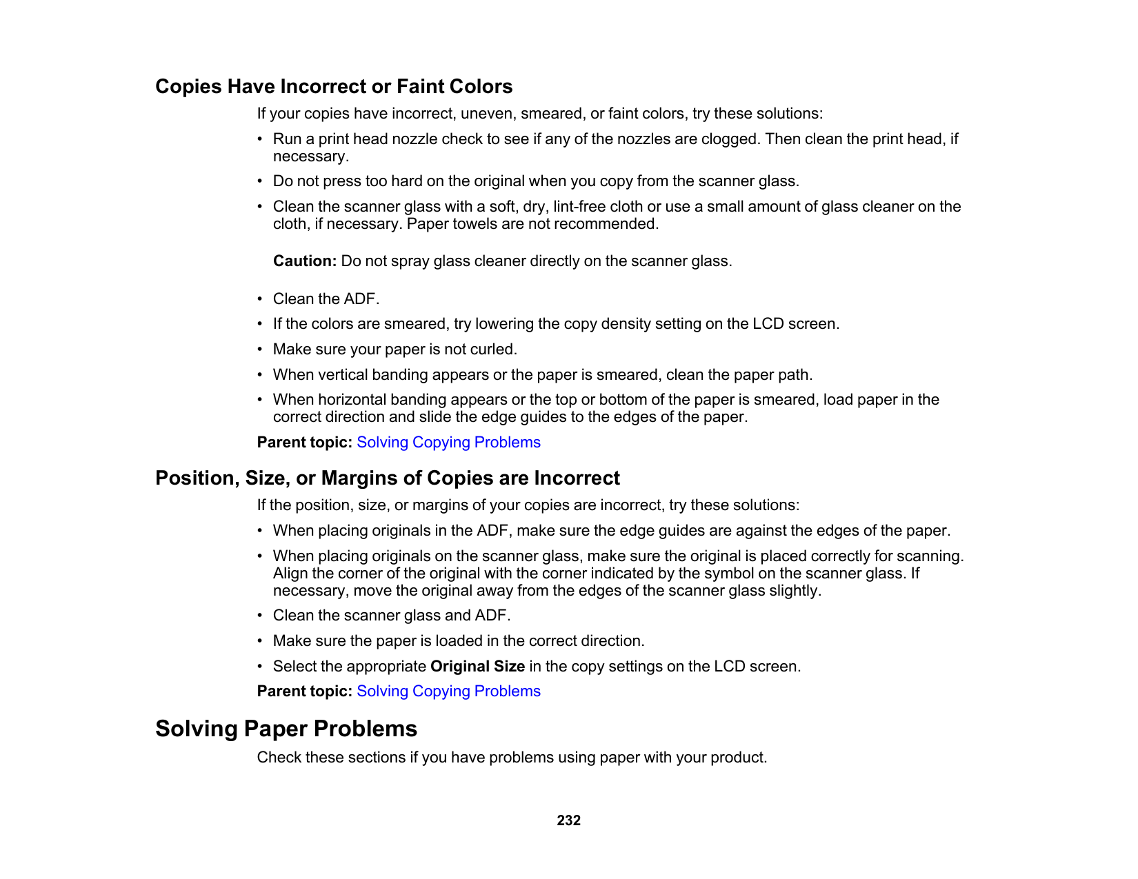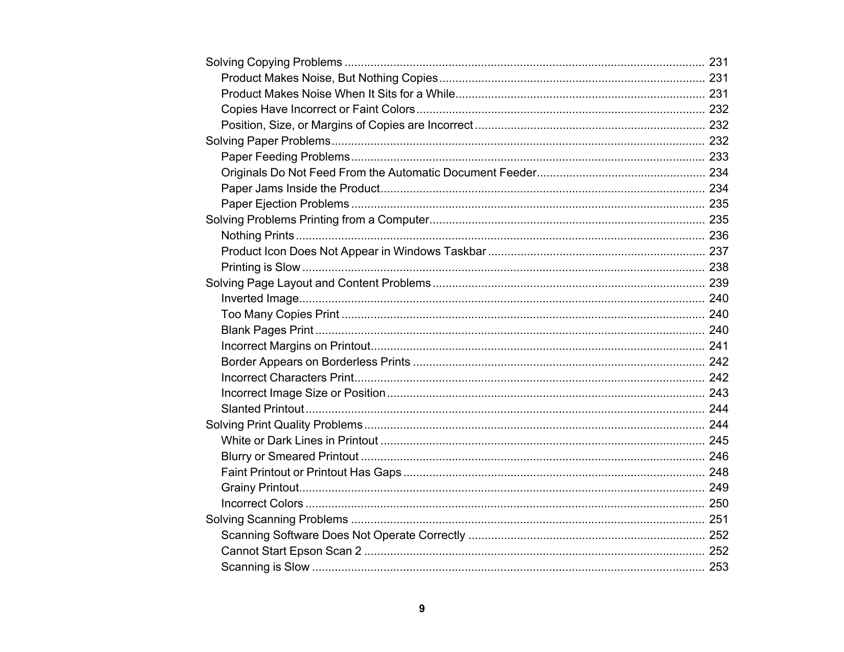 9 Solving Copying Problems ............................................................................................................... 231 Product Makes Noise, But Nothing Copies.................................................................................. 231 Product Makes Noise When It Sits for a While............................................................................. 231 Copies Have Incorrect or Faint Colors......................................................................................... 232 Position, Size, or Margins of Copies are Incorrect ....................................................................... 232 Solving Paper Problems................................................................................................................... 232 Paper Feeding Problems............................................................................................................. 233 Originals Do Not Feed From the Automatic Document Feeder.................................................... 234 Paper Jams Inside the Product.................................................................................................... 234 Paper Ejection Problems............................................................................................................. 235 Solving Problems Printing from a Computer..................................................................................... 235 Nothing Prints.............................................................................................................................. 236 Product Icon Does Not Appear in Windows Taskbar................................................................... 237 Printing is Slow............................................................................................................................ 238 Solving Page Layout and Content Problems.................................................................................... 239 Inverted Image............................................................................................................................. 240 Too Many Copies Print ................................................................................................................ 240 Blank Pages Print........................................................................................................................ 240 Incorrect Margins on Printout....................................................................................................... 241 Border Appears on Borderless Prints .......................................................................................... 242 Incorrect Characters Print............................................................................................................ 242 Incorrect Image Size or Position.................................................................................................. 243 Slanted Printout........................................................................................................................... 244 Solving Print Quality Problems......................................................................................................... 244 White or Dark Lines in Printout .................................................................................................... 245 Blurry or Smeared Printout .......................................................................................................... 246 Faint Printout or Printout Has Gaps............................................................................................. 248 Grainy Printout............................................................................................................................. 249 Incorrect Colors ........................................................................................................................... 250 Solving Scanning Problems ............................................................................................................. 251 Scanning Software Does Not Operate Correctly ......................................................................... 252 Cannot Start Epson Scan 2 ......................................................................................................... 252 Scanning is Slow ......................................................................................................................... 253