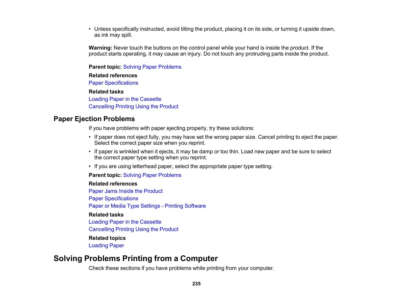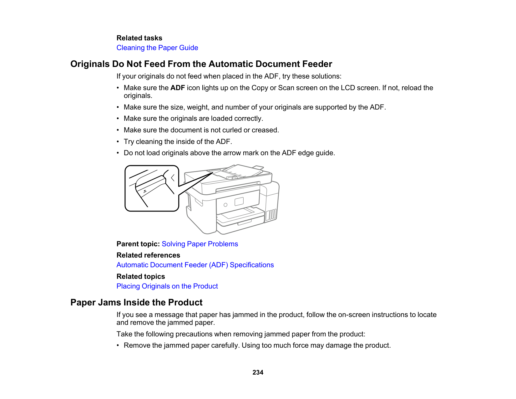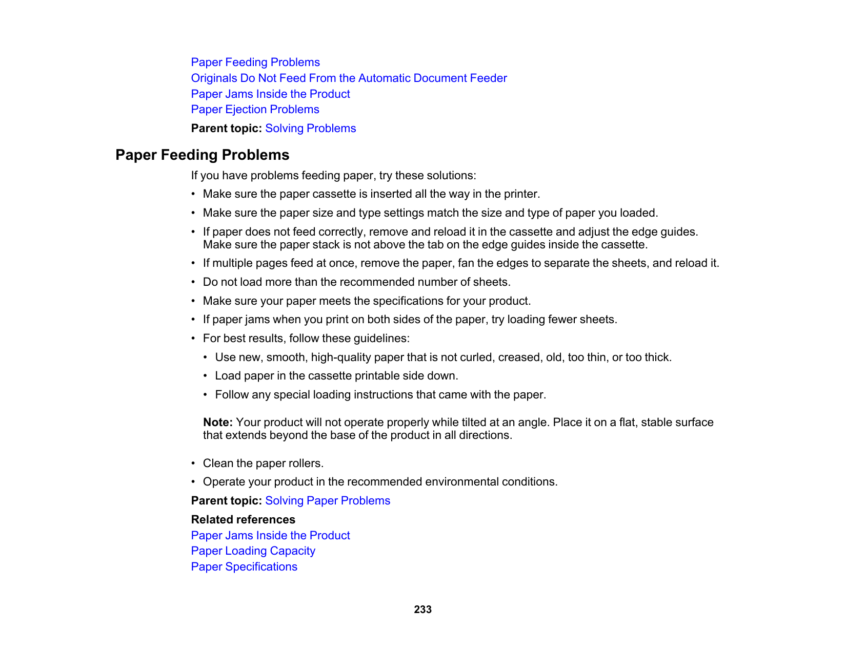 233 Paper Feeding Problems Originals Do Not Feed From the Automatic Document Feeder Paper Jams Inside the Product Paper Ejection Problems Parent topic: Solving Problems Paper Feeding Problems If you have problems feeding paper, try these solutions: