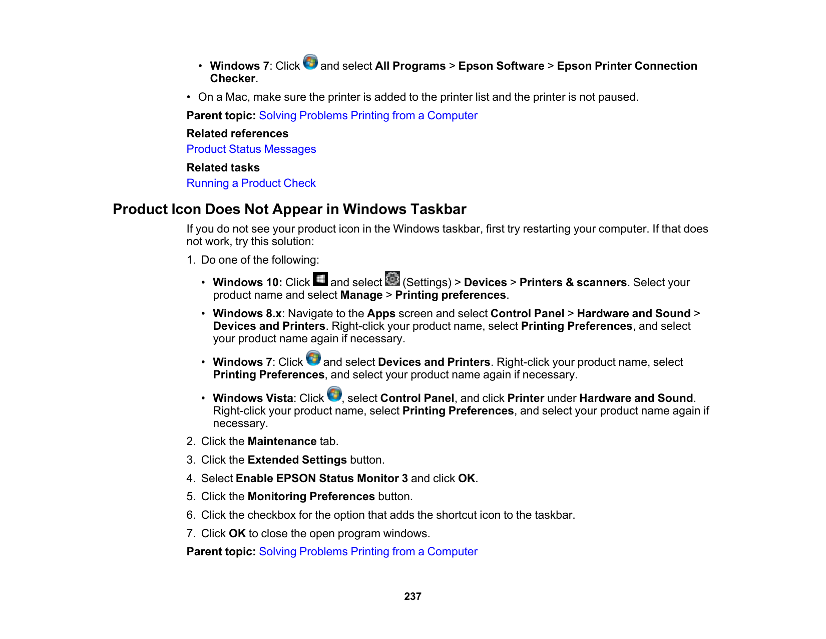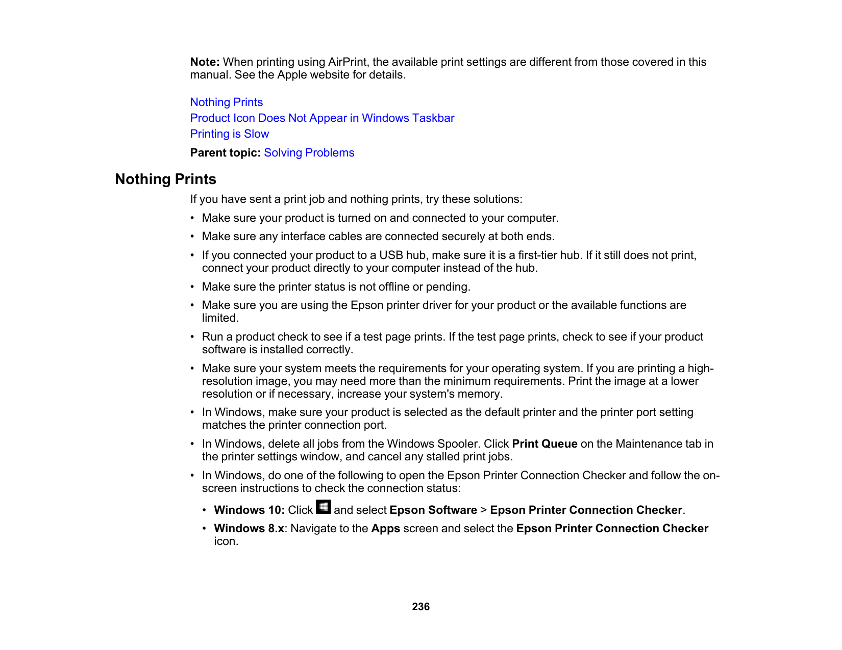 236 Note: When printing using AirPrint, the available print settings are different from those covered in this manual. See the Apple website for details. Nothing Prints Product Icon Does Not Appear in Windows Taskbar Printing is Slow Parent topic: Solving Problems Nothing Prints If you have sent a print job and nothing prints, try these solutions: