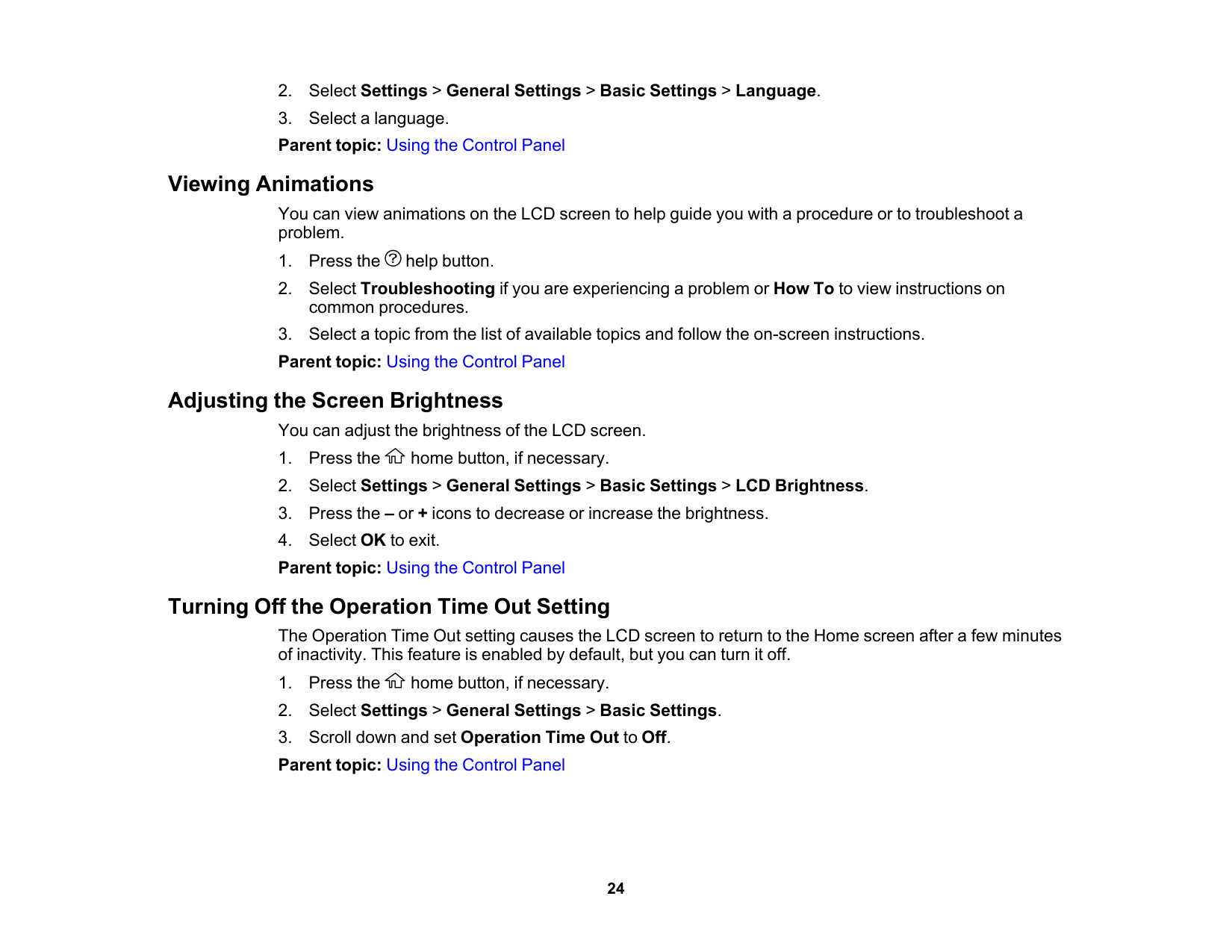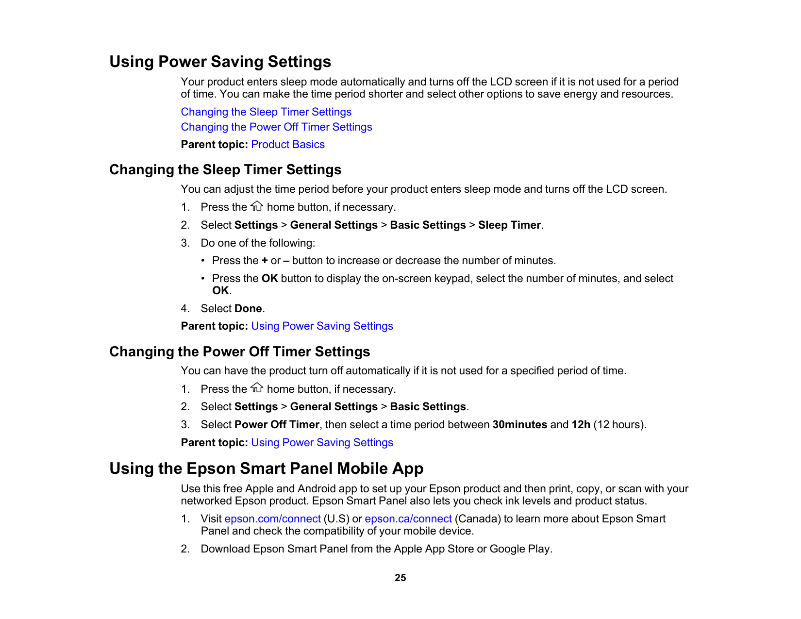 25 Using Power Saving Settings Your product enters sleep mode automatically and turns off the LCD screen if it is not used for a period of time. You can make the time period shorter and select other options to save energy and resources. Changing the Sleep Timer Settings Changing the Power Off Timer Settings Parent topic: Product Basics Changing the Sleep Timer Settings You can adjust the time period before your product enters sleep mode and turns off the LCD screen.