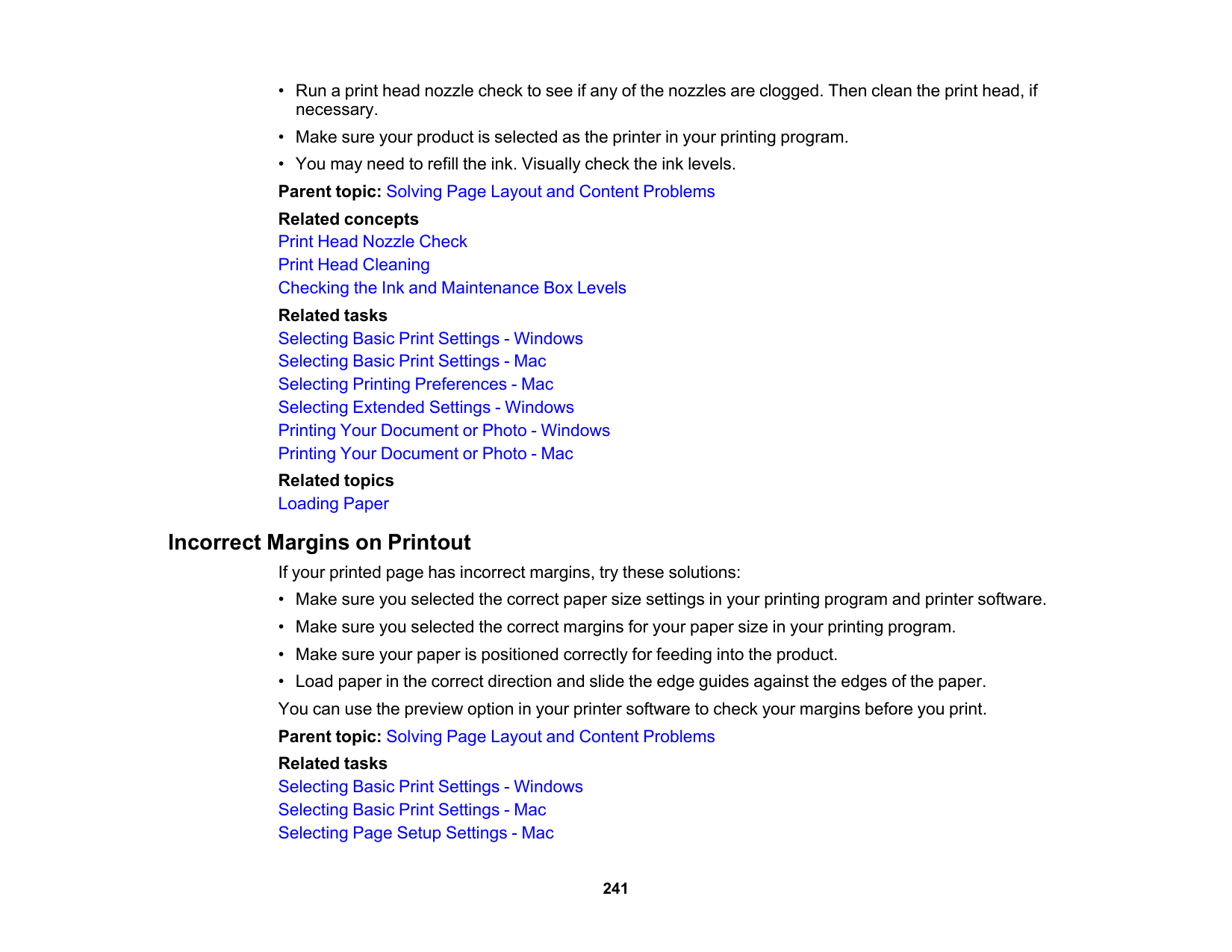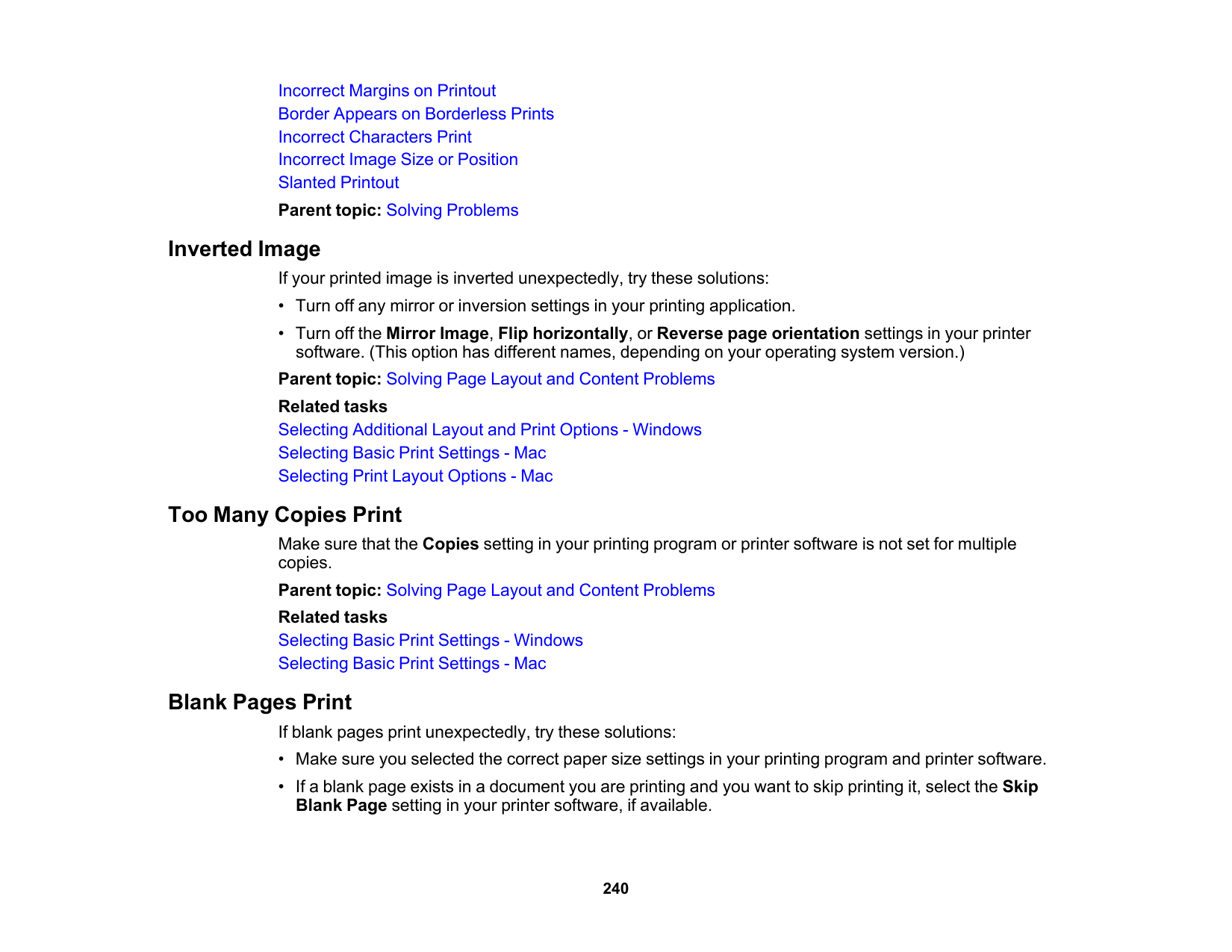 240 Incorrect Margins on Printout Border Appears on Borderless Prints Incorrect Characters Print Incorrect Image Size or Position Slanted Printout Parent topic: Solving Problems Inverted Image If your printed image is inverted unexpectedly, try these solutions: