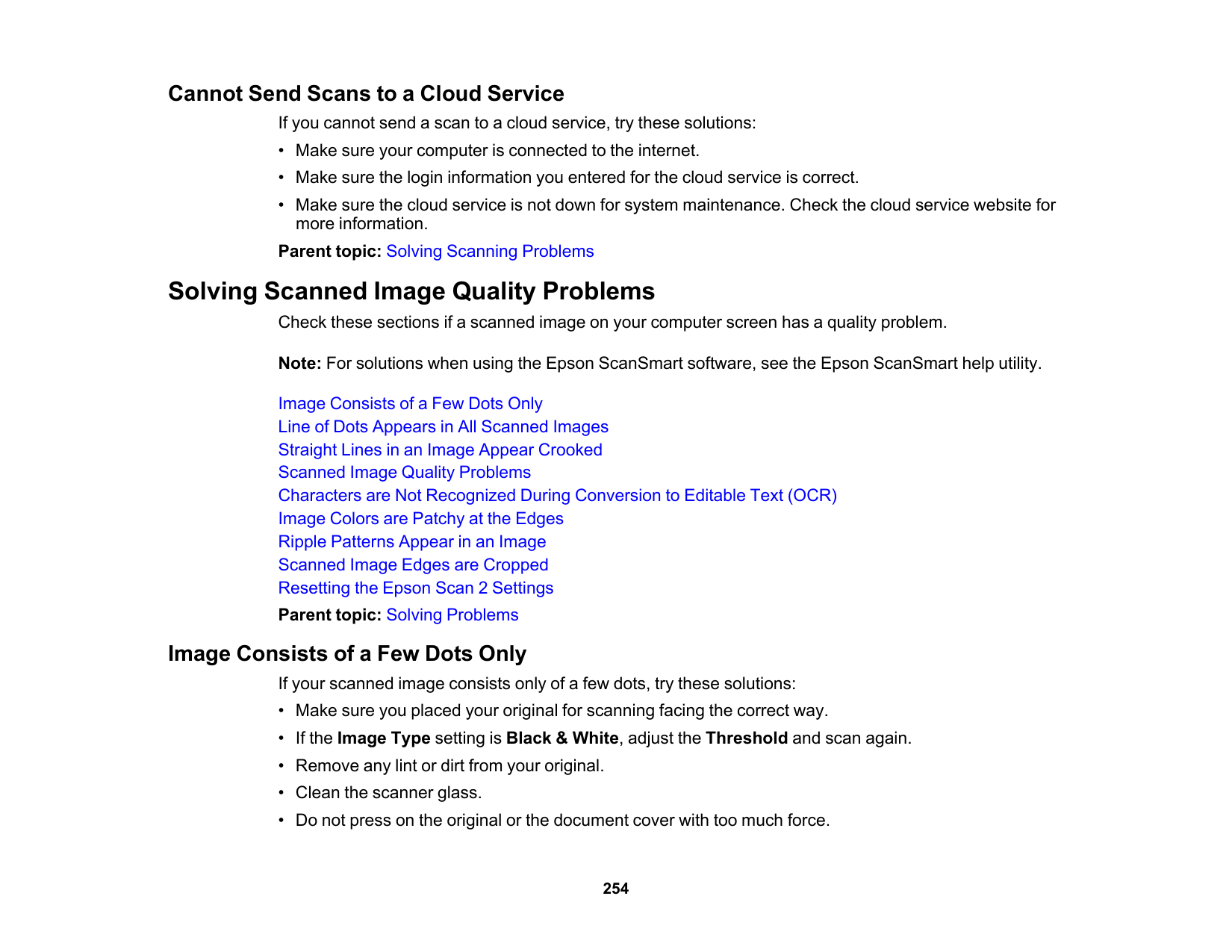 255 Parent topic: Solving Scanned Image Quality Problems Related tasks Cleaning Your Product Related topics Placing Originals on the Product Line of Dots Appears in All Scanned Images If a line of dots appears in all your scanned images, try these solutions: