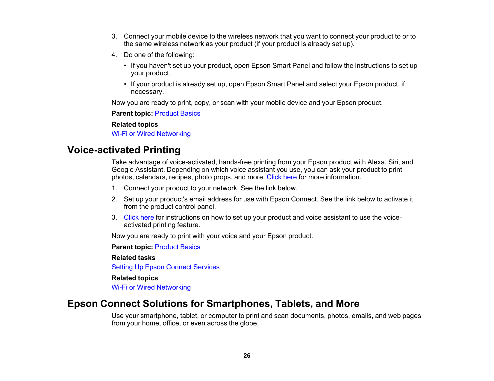 14 Product Basics See these sections to learn about the basic features of your product. Product Parts Locations Using the Control Panel Using Power Saving Settings Using the Epson Smart Panel Mobile App Voice-activated Printing Epson Connect Solutions for Smartphones, Tablets, and More Using AirPrint Setting Up Printing on a Chromebook Android Printing Using the Epson Print Enabler Using Fire OS Printing Using Windows 10 Mobile Printing Using Epson Print and Scan App with Windows Tablets Using the Mopria Print Service Product Parts Locations See these sections to identify the parts on your product. Product Parts - Front Product Parts - Inside Product Parts - Back Parent topic: Product Basics