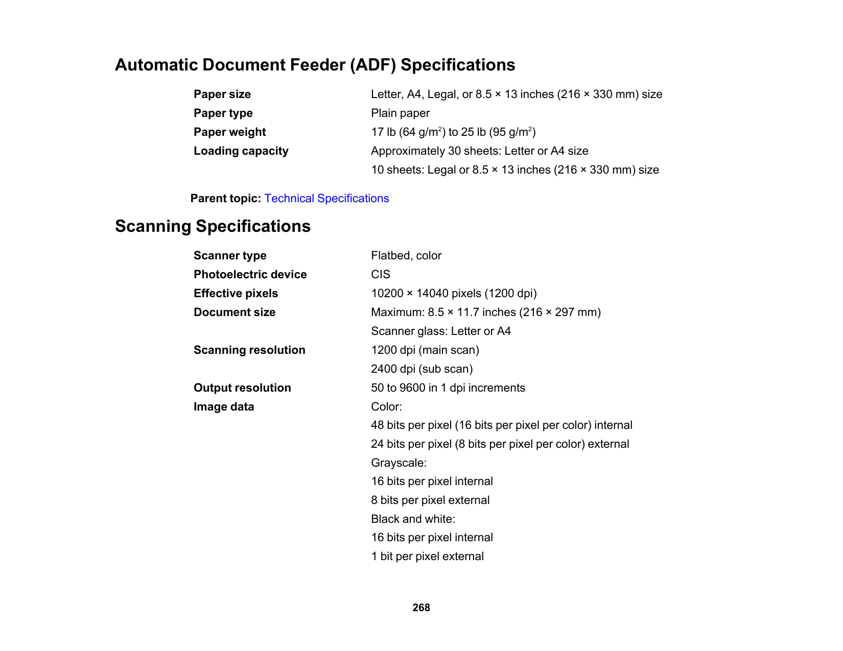 Effective pixels 10200 × 14040 pixels (1200 dpi) Document size Maximum: 8.5 × 11.7 inches (216 × 297 mm) Scanner glass: Letter or A4 Scanning resolution 1200 dpi (main scan) 2400 dpi (sub scan) Output resolution 50 to 9600 in 1 dpi increments Image data Color: 48 bits per pixel (16 bits per pixel per color) internal 24 bits per pixel (8 bits per pixel per color) external Grayscale: 16 bits per pixel internal 8 bits per pixel external Black and white: 16 bits per pixel internal 1 bit per pixel external269 Light source