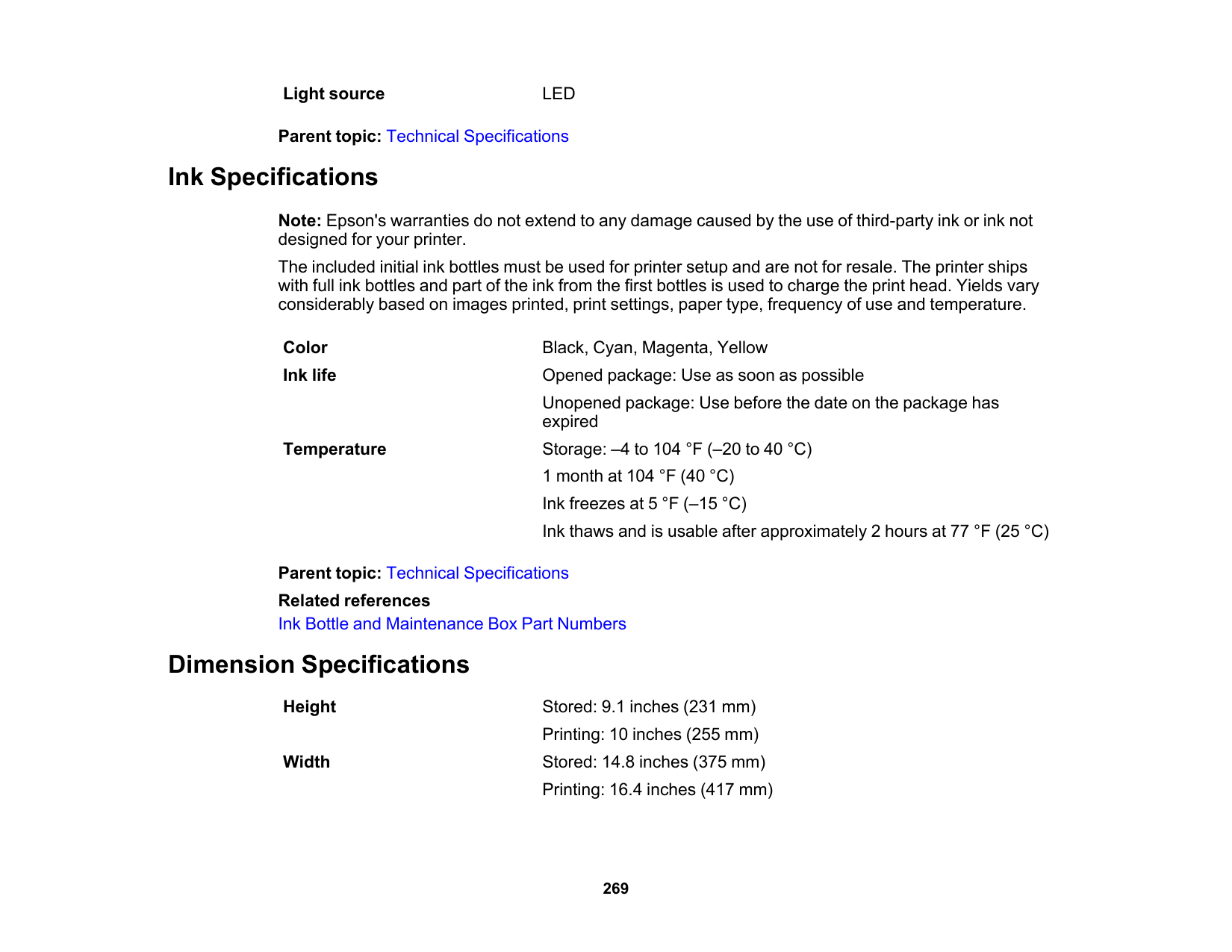 Parent topic: Technical Specifications Ink Specifications Note: Epson's warranties do not extend to any damage caused by the use of third-party ink or ink not designed for your printer. The included initial ink bottles must be used for printer setup and are not for resale. The printer ships with full ink bottles and part of the ink from the first bottles is used to charge the print head. Yields vary considerably based on images printed, print settings, paper type, frequency of use and temperature. Color Black, Cyan, Magenta, Yellow Ink life Opened package: Use as soon as possible Unopened package: Use before the date on the package has expired Temperature Storage: –4 to 104 °F (–20 to 40 °C) 1 month at 104 °F (40 °C) Ink freezes at 5 °F (–15 °C) Ink thaws and is usable after approximately 2 hours at 77 °F (25 °C) Parent topic: Technical Specifications Related references Ink Bottle and Maintenance Box Part Numbers Dimension Specifications Height Stored: 9.1 inches (231 mm) Printing: 10 inches (255 mm) Width Stored: 14.8 inches (375 mm) Printing: 16.4 inches (417 mm)270 Depth Stored: 13.7 inches (347 mm) Printing: 19.8 inches (503 mm) Weight (without ink or power cord) 14.8 lb (6.7 kg) Parent topic: Technical Specifications Electrical Specifications Power supply rating 100 to 240 V Input voltage range 90 to 264 V Rated frequency range 50/60 Hz Input frequency range 49.5 to 60.5 Hz Rated current 0.4 to 0.2 A Power consumption (with USB connection) Standalone copying: Approximately 12 W (ISO/IEC24712) Ready mode: Approximately 5.3 W Sleep mode: Approximately 0.9 W Power off mode: Approximately 0.2 W Parent topic: Technical Specifications Environmental Specifications Temperature Operating: 50 to 95 °F (10 to 35 °C) Storage: –4 to 104 °F (–20 to 40 °C) 1 month at 104 °F (40 °C) Humidity (without condensation) Operating: 20 to 80% RH Storage: 5 to 85% RH Parent topic: Technical Specifications