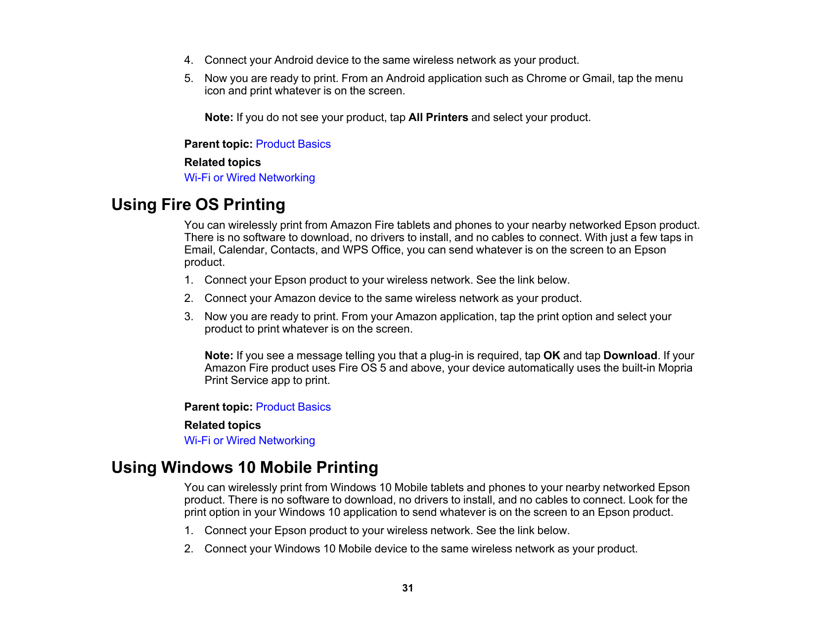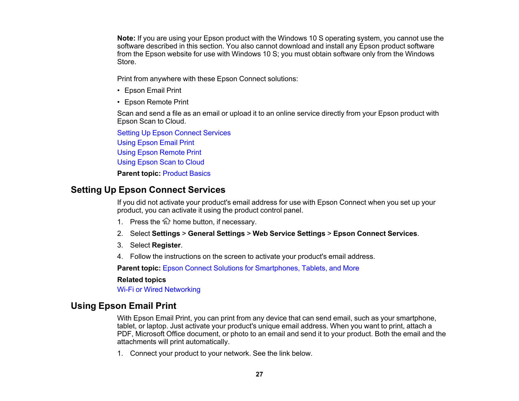 27 Note: If you are using your Epson product with the Windows 10 S operating system, you cannot use the software described in this section. You also cannot download and install any Epson product software from the Epson website for use with Windows 10 S; you must obtain software only from the Windows Store. Print from anywhere with these Epson Connect solutions:
