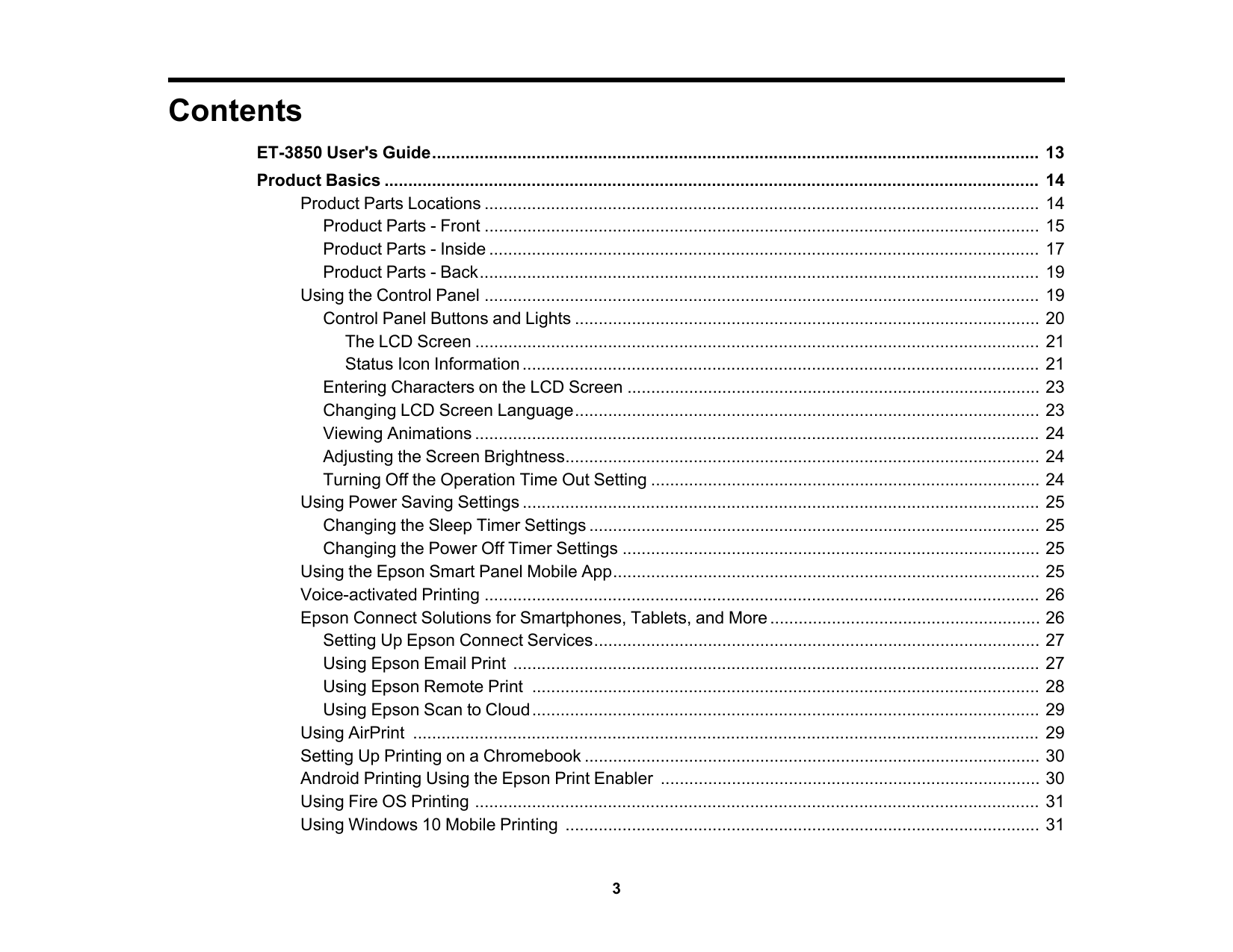 3 Contents ET-3850 User's Guide................................................................................................................................ 13 Product Basics .......................................................................................................................................... 14 Product Parts Locations ..................................................................................................................... 14 Product Parts - Front ..................................................................................................................... 15 Product Parts - Inside .................................................................................................................... 17 Product Parts - Back...................................................................................................................... 19 Using the Control Panel ..................................................................................................................... 19 Control Panel Buttons and Lights .................................................................................................. 20 The LCD Screen ....................................................................................................................... 21 Status Icon Information............................................................................................................. 21 Entering Characters on the LCD Screen ....................................................................................... 23 Changing LCD Screen Language.................................................................................................. 23 Viewing Animations ....................................................................................................................... 24 Adjusting the Screen Brightness.................................................................................................... 24 Turning Off the Operation Time Out Setting .................................................................................. 24 Using Power Saving Settings ............................................................................................................. 25 Changing the Sleep Timer Settings ............................................................................................... 25 Changing the Power Off Timer Settings ........................................................................................ 25 Using the Epson Smart Panel Mobile App.......................................................................................... 25 Voice-activated Printing ..................................................................................................................... 26 Epson Connect Solutions for Smartphones, Tablets, and More......................................................... 26 Setting Up Epson Connect Services.............................................................................................. 27 Using Epson Email Print ............................................................................................................... 27 Using Epson Remote Print ........................................................................................................... 28 Using Epson Scan to Cloud........................................................................................................... 29 Using AirPrint .................................................................................................................................... 29 Setting Up Printing on a Chromebook ................................................................................................ 30 Android Printing Using the Epson Print Enabler ................................................................................ 30 Using Fire OS Printing ....................................................................................................................... 31 Using Windows 10 Mobile Printing .................................................................................................... 31