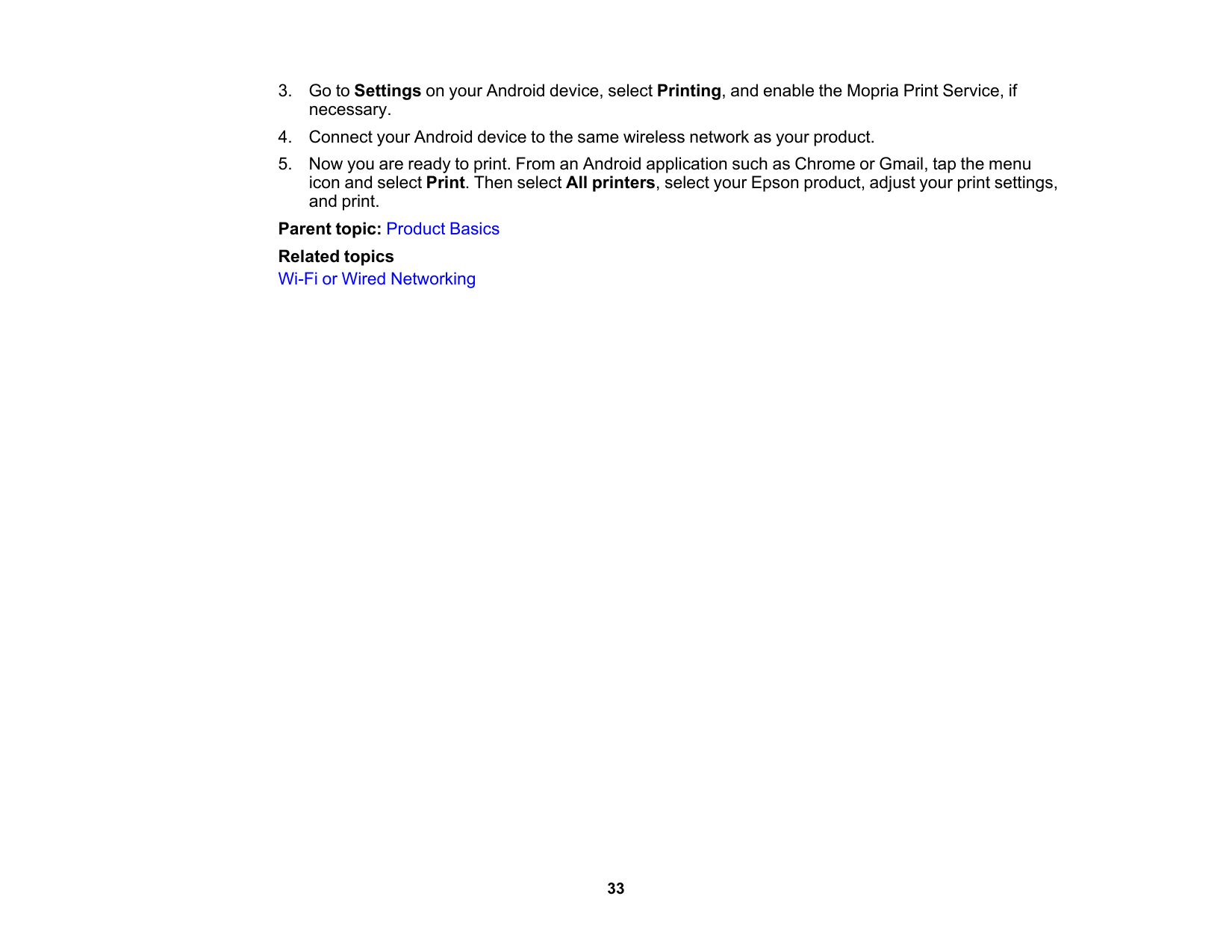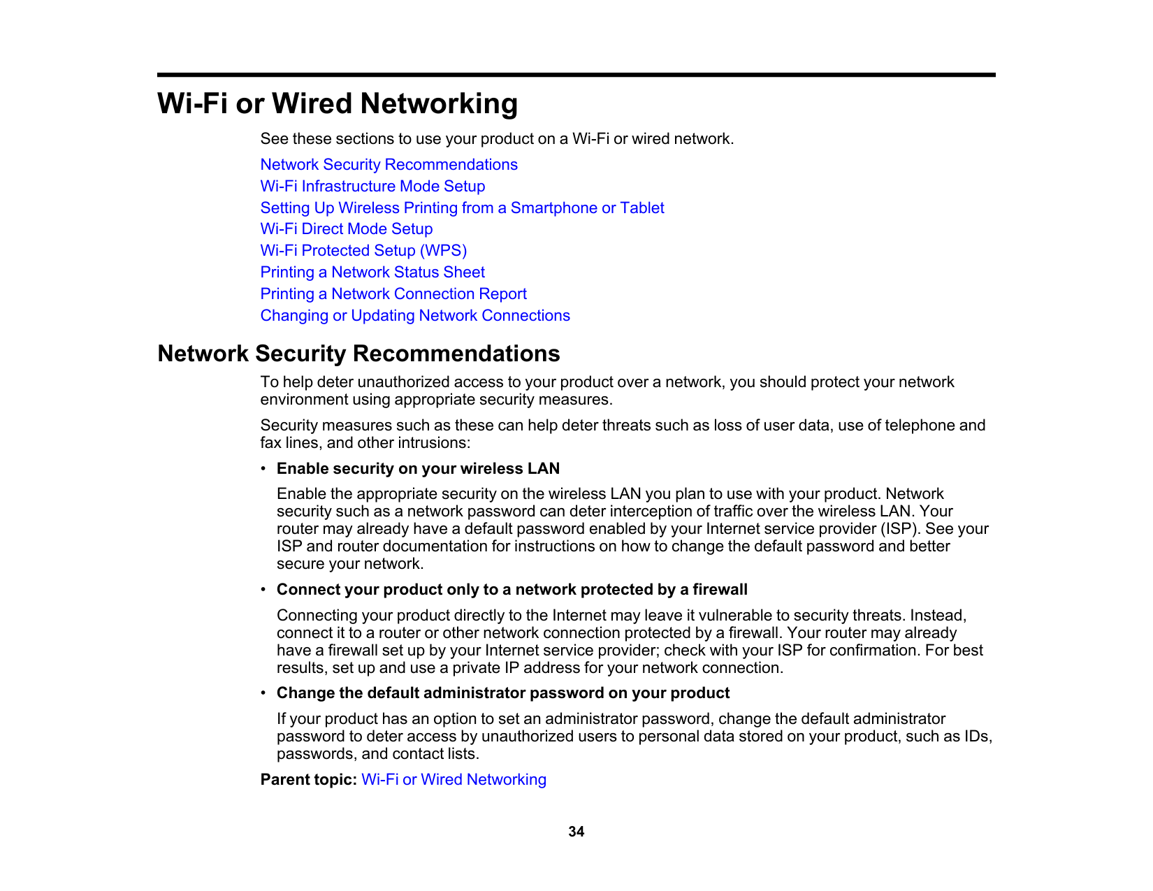 34 Wi-Fi or Wired Networking See these sections to use your product on a Wi-Fi or wired network. Network Security Recommendations Wi-Fi Infrastructure Mode Setup Setting Up Wireless Printing from a Smartphone or Tablet Wi-Fi Direct Mode Setup Wi-Fi Protected Setup (WPS) Printing a Network Status Sheet Printing a Network Connection Report Changing or Updating Network Connections Network Security Recommendations To help deter unauthorized access to your product over a network, you should protect your network environment using appropriate security measures. Security measures such as these can help deter threats such as loss of user data, use of telephone and fax lines, and other intrusions: