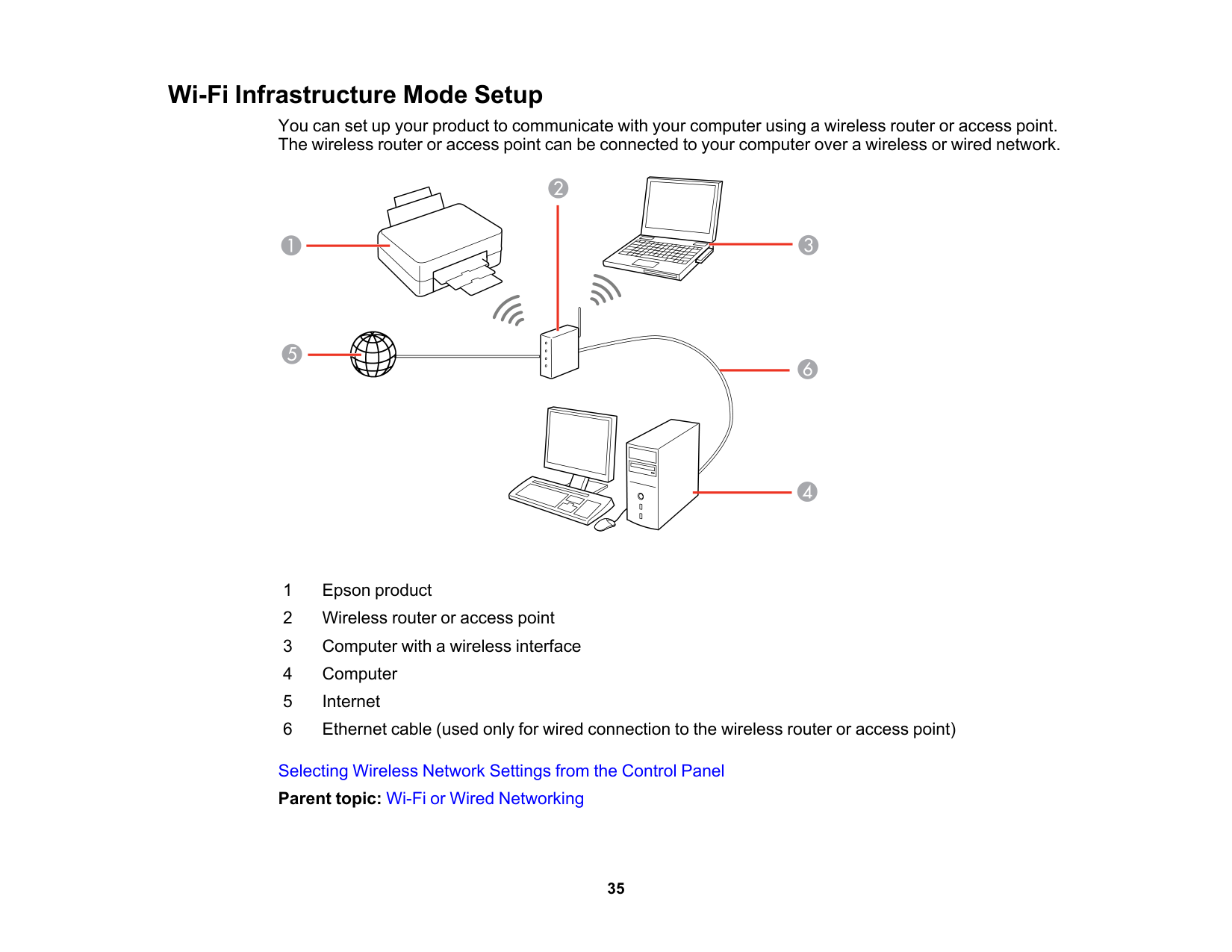 35 Wi-Fi Infrastructure Mode Setup You can set up your product to communicate with your computer using a wireless router or access point. The wireless router or access point can be connected to your computer over a wireless or wired network. 1 Epson product 2 Wireless router or access point 3 Computer with a wireless interface 4 Computer 5 Internet 6 Ethernet cable (used only for wired connection to the wireless router or access point) Selecting Wireless Network Settings from the Control Panel Parent topic: Wi-Fi or Wired Networking