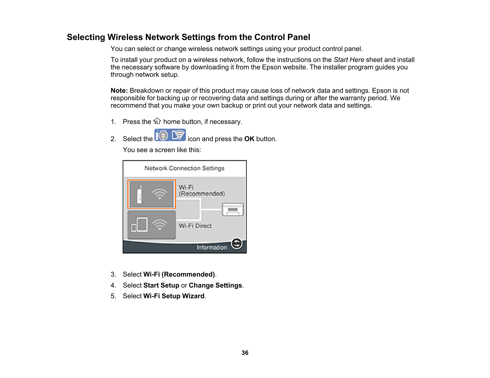 36 Selecting Wireless Network Settings from the Control Panel You can select or change wireless network settings using your product control panel. To install your product on a wireless network, follow the instructions on the Start Here sheet and install the necessary software by downloading it from the Epson website. The installer program guides you through network setup. Note: Breakdown or repair of this product may cause loss of network data and settings. Epson is not responsible for backing up or recovering data and settings during or after the warranty period. We recommend that you make your own backup or print out your network data and settings.