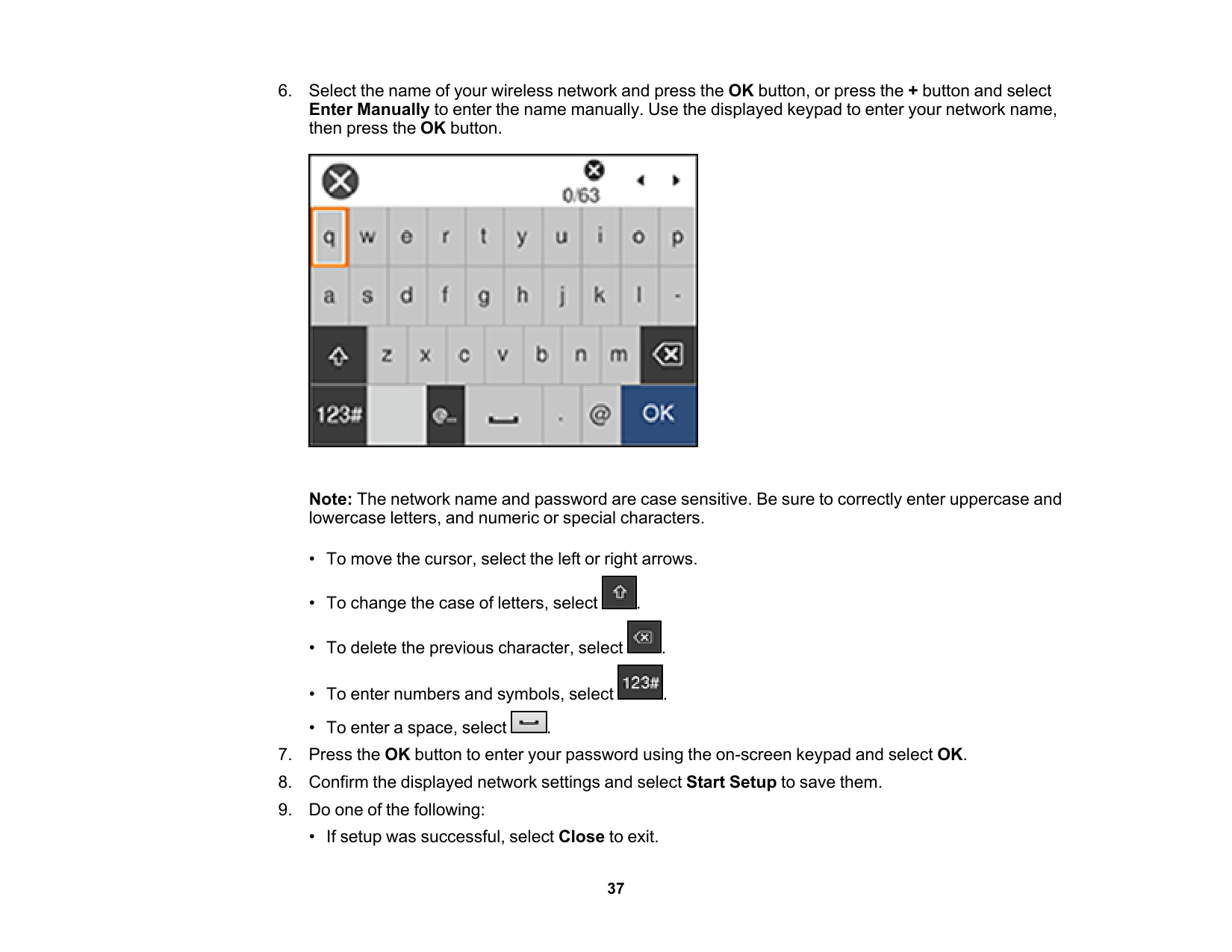 To connect to a wireless network, press the home button, select the network icon, then select Wi-Fi (Recommended) and choose Wi-Fi Setup Wizard. Select your network name, enter your password using the on-screen keypad, confirm the settings, and select Start Setup to save them. Note that the network name and password are case sensitive, so be sure to correctly enter uppercase and lowercase letters and any special characters. (Page 36-37)