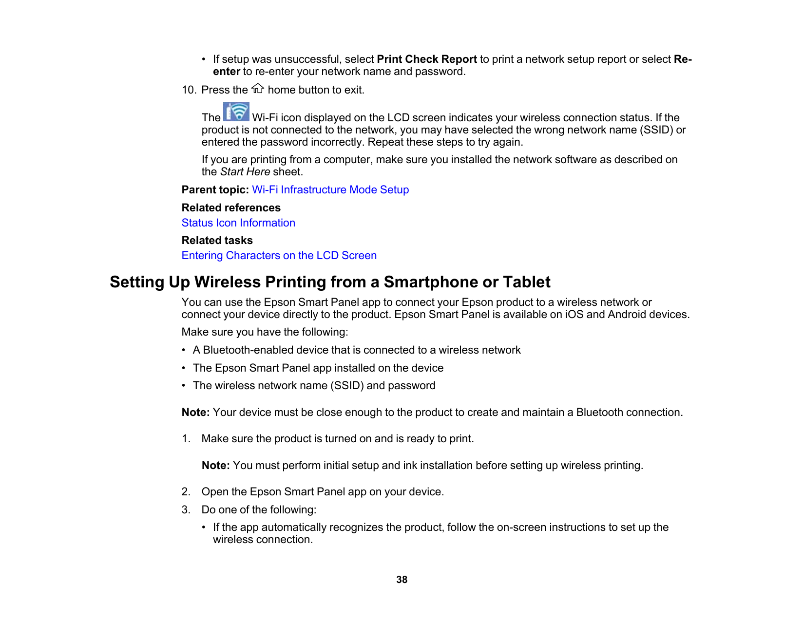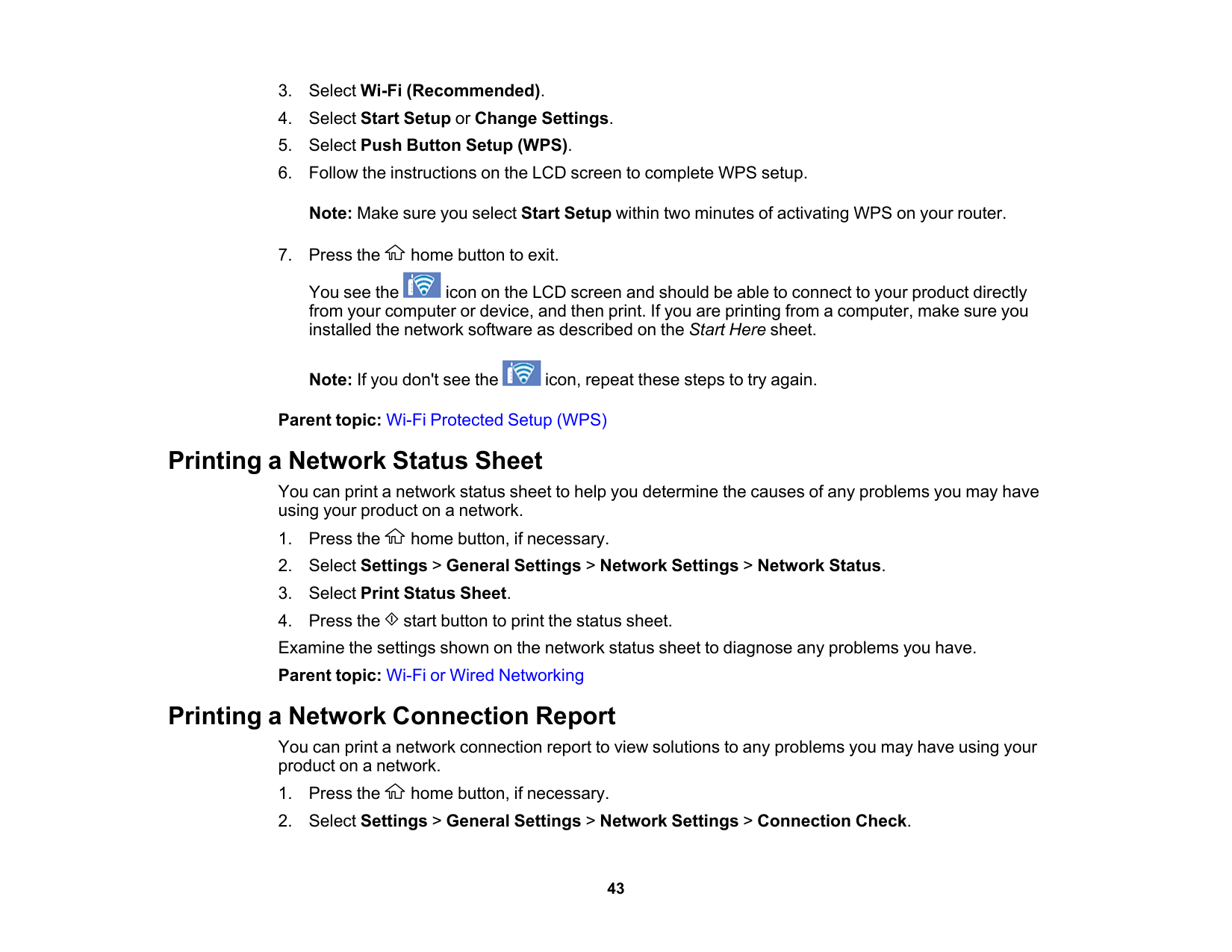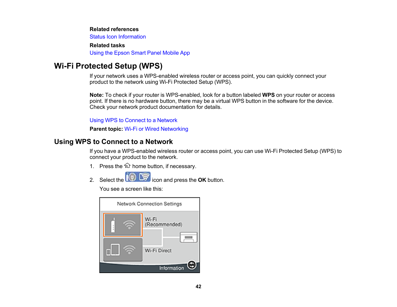 42 Related references Status Icon Information Related tasks Using the Epson Smart Panel Mobile App Wi-Fi Protected Setup (WPS) If your network uses a WPS-enabled wireless router or access point, you can quickly connect your product to the network using Wi-Fi Protected Setup (WPS). Note: To check if your router is WPS-enabled, look for a button labeled WPS on your router or access point. If there is no hardware button, there may be a virtual WPS button in the software for the device. Check your network product documentation for details. Using WPS to Connect to a Network Parent topic: Wi-Fi or Wired Networking Using WPS to Connect to a Network If you have a WPS-enabled wireless router or access point, you can use Wi-Fi Protected Setup (WPS) to connect your product to the network.