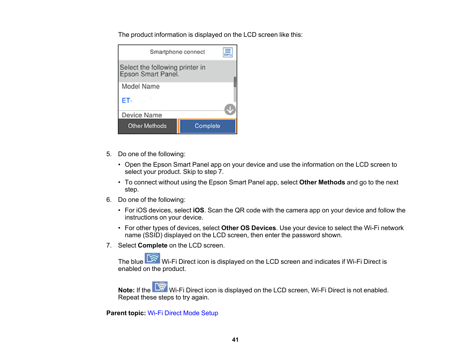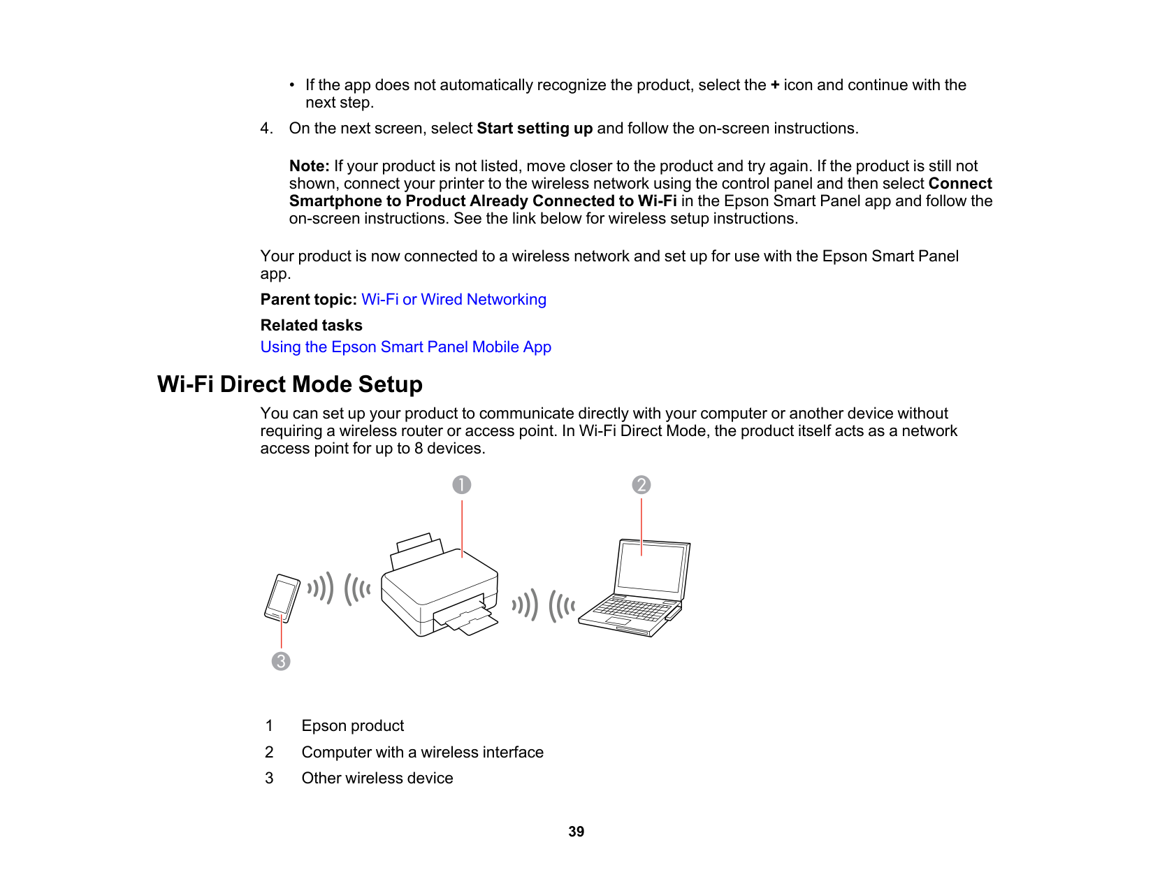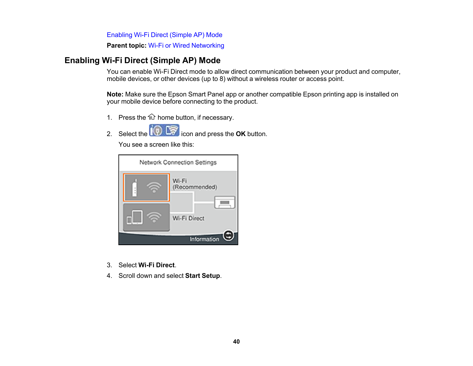 40 Enabling Wi-Fi Direct (Simple AP) Mode Parent topic: Wi-Fi or Wired Networking Enabling Wi-Fi Direct (Simple AP) Mode You can enable Wi-Fi Direct mode to allow direct communication between your product and computer, mobile devices, or other devices (up to 8) without a wireless router or access point. Note: Make sure the Epson Smart Panel app or another compatible Epson printing app is installed on your mobile device before connecting to the product.