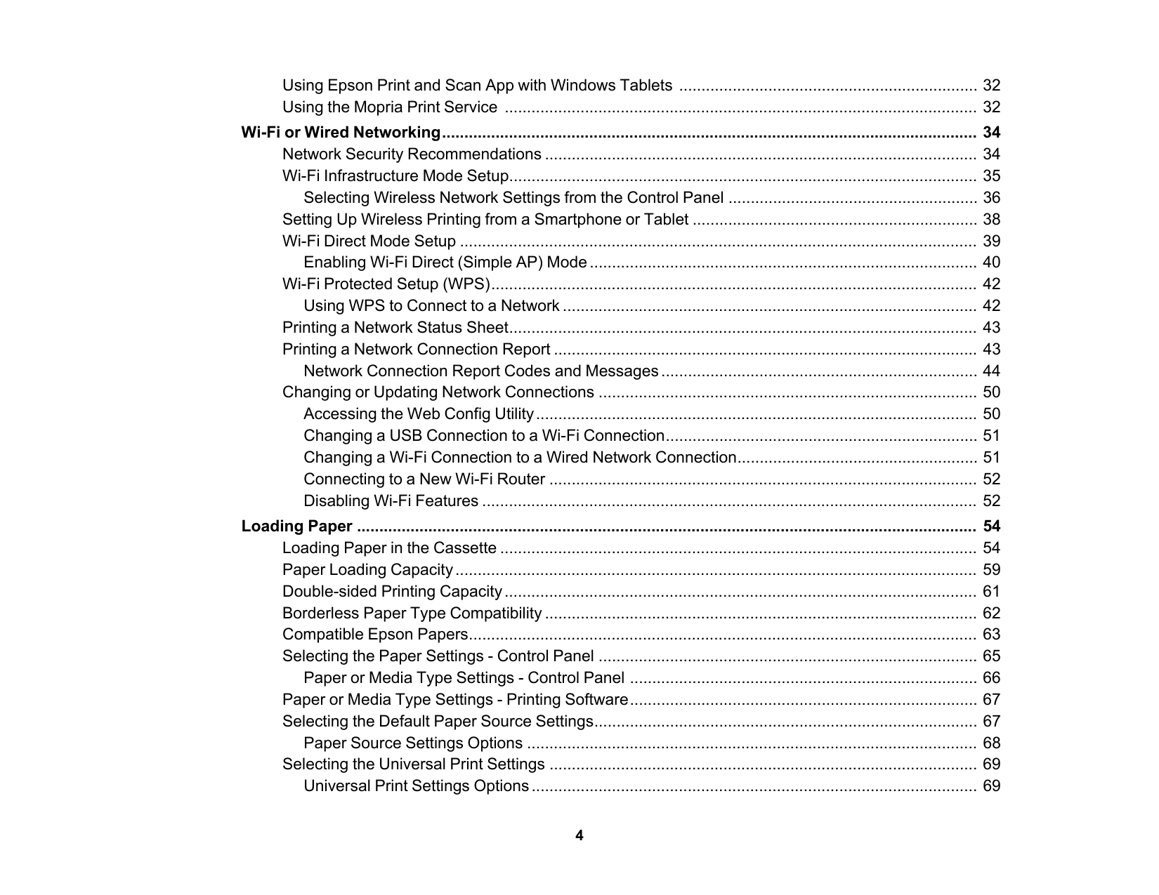 4 Using Epson Print and Scan App with Windows Tablets ................................................................... 32 Using the Mopria Print Service .......................................................................................................... 32 Wi-Fi or Wired Networking........................................................................................................................ 34 Network Security Recommendations ................................................................................................. 34 Wi-Fi Infrastructure Mode Setup......................................................................................................... 35 Selecting Wireless Network Settings from the Control Panel ........................................................ 36 Setting Up Wireless Printing from a Smartphone or Tablet ................................................................ 38 Wi-Fi Direct Mode Setup .................................................................................................................... 39 Enabling Wi-Fi Direct (Simple AP) Mode....................................................................................... 40 Wi-Fi Protected Setup (WPS)............................................................................................................. 42 Using WPS to Connect to a Network ............................................................................................. 42 Printing a Network Status Sheet......................................................................................................... 43 Printing a Network Connection Report ............................................................................................... 43 Network Connection Report Codes and Messages....................................................................... 44 Changing or Updating Network Connections ..................................................................................... 50 Accessing the Web Config Utility................................................................................................... 50 Changing a USB Connection to a Wi-Fi Connection...................................................................... 51 Changing a Wi-Fi Connection to a Wired Network Connection...................................................... 51 Connecting to a New Wi-Fi Router ................................................................................................ 52 Disabling Wi-Fi Features ............................................................................................................... 52 Loading Paper ........................................................................................................................................... 54 Loading Paper in the Cassette ........................................................................................................... 54 Paper Loading Capacity..................................................................................................................... 59 Double-sided Printing Capacity.......................................................................................................... 61 Borderless Paper Type Compatibility ................................................................................................. 62 Compatible Epson Papers.................................................................................................................. 63 Selecting the Paper Settings - Control Panel ..................................................................................... 65 Paper or Media Type Settings - Control Panel .............................................................................. 66 Paper or Media Type Settings - Printing Software.............................................................................. 67 Selecting the Default Paper Source Settings...................................................................................... 67 Paper Source Settings Options ..................................................................................................... 68 Selecting the Universal Print Settings ................................................................................................ 69 Universal Print Settings Options.................................................................................................... 69