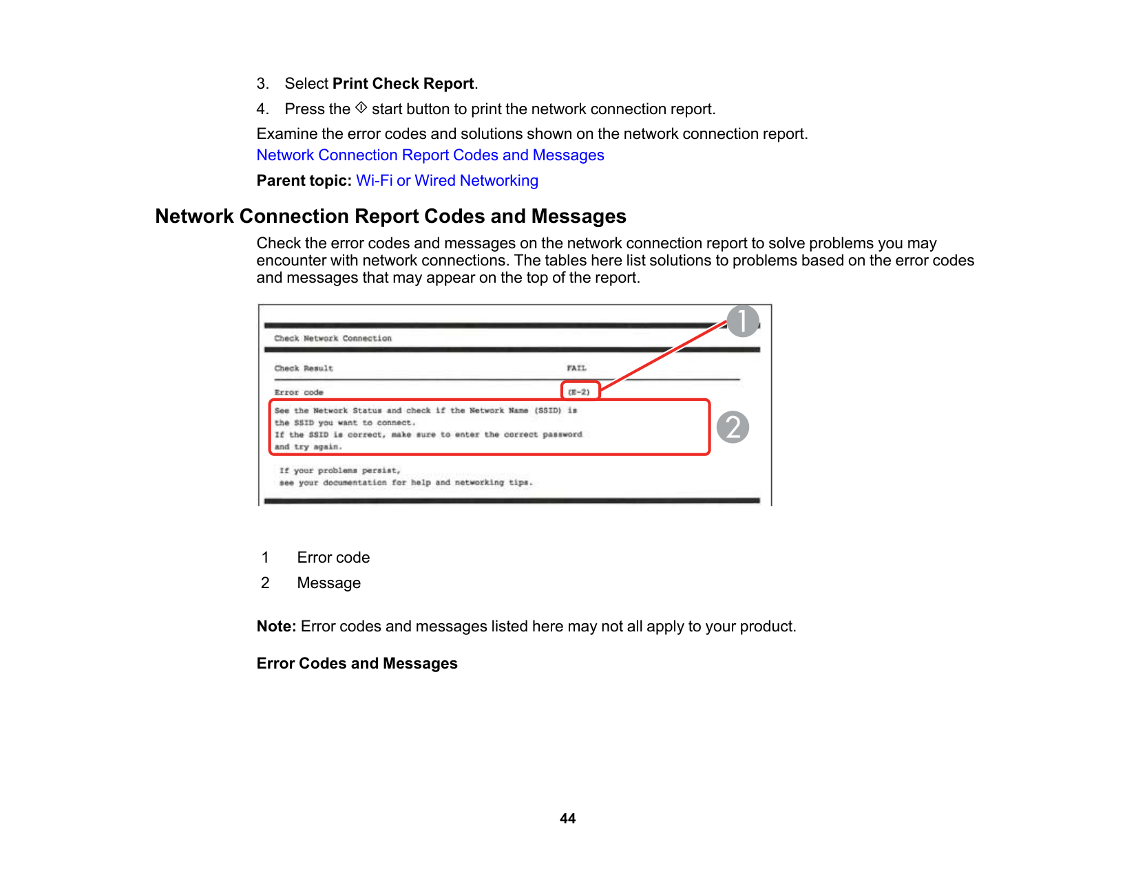 Press the home button, then select Settings > General Settings > Network Settings > Connection Check, and select Print Check Report. Press the start button to print the report, then examine the error codes and messages shown to identify and resolve network issues. (Page 43-44)