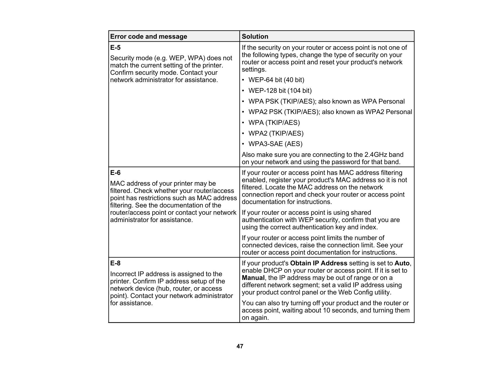 Confirm that the network cable is connected and network devices such as hub, router, or access point are turned on. Make sure your router, access point, and/or hub are turned on, and the network cable is securely connected to your device and to your product. If you are trying to set up Wi-Fi, remove the network cable and set up Wi-Fi again. Ethernet and Wi-Fi cannot be connected at the same time.46 Error code and message Solution E-2, E-3, or E-7 No wireless network names (SSID) found. Confirm that the router/access point is turned on and the wireless network (SSID) is set up correctly. Contact your network administrator for assistance. No wireless network names (SSID) found. Confirm that the wireless network name (SSID) of the PC you wish to connect is set up correctly. Contact your network administrator for assistance. Entered security key/password does not match the one set for your router/access point. Confirm security key/password. Contact your network administrator for assistance. Check the following: