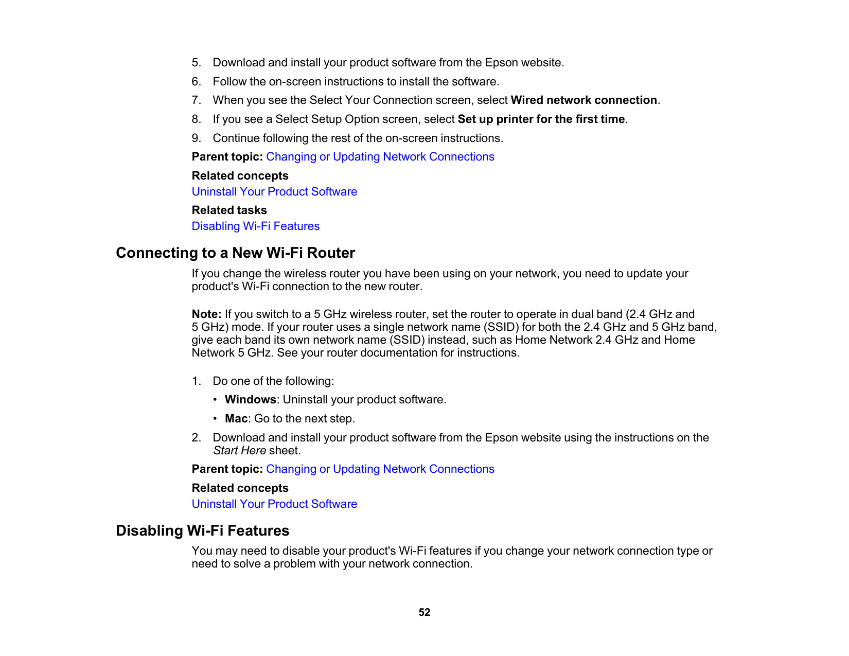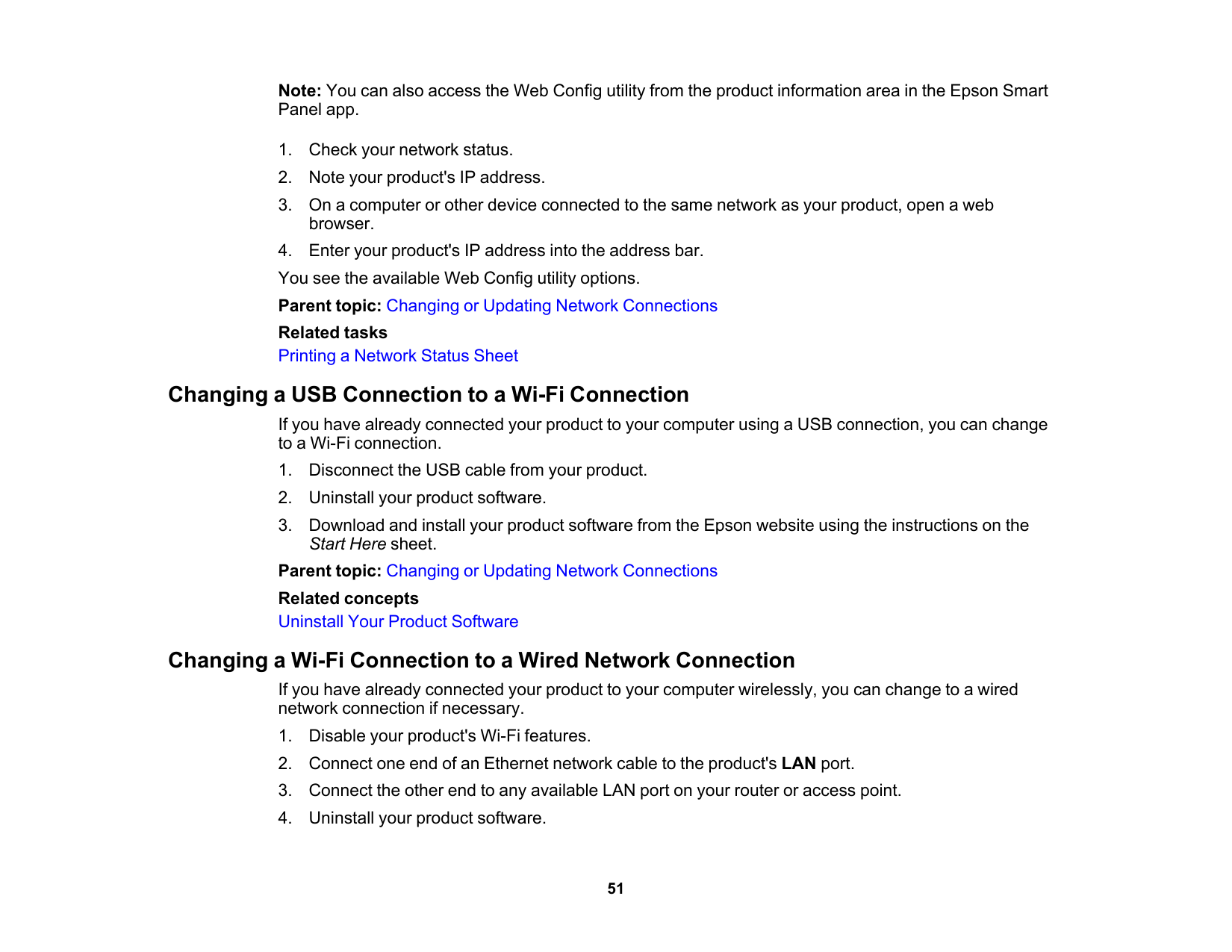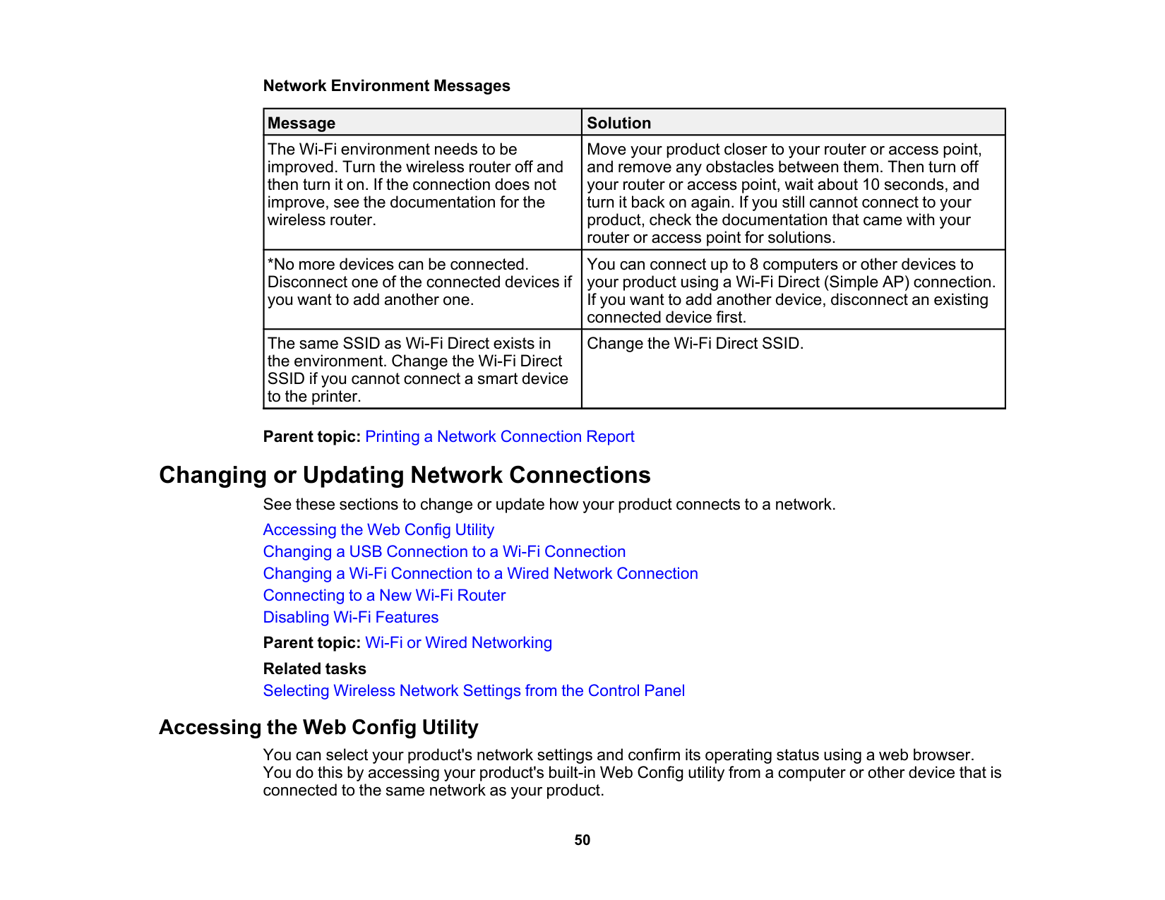 Confirm the following: -Entered security key/password is correct -Index of the security key/password is set to the first number -Connection and network setup of the PC or other device is correct Contact your network administrator for assistance. Make sure your router, access point, and/or hub are turned on. Also make sure the TCP/IP setup on your router, access point, and/or hub is not set manually; this may cause your product's network settings to differ from the manually set up devices. If you still cannot connect to your product, do the following:50 Network Environment Messages Message Solution The Wi-Fi environment needs to be improved. Turn the wireless router off and then turn it on. If the connection does not improve, see the documentation for the wireless router. Move your product closer to your router or access point, and remove any obstacles between them. Then turn off your router or access point, wait about 10 seconds, and turn it back on again. If you still cannot connect to your product, check the documentation that came with your router or access point for solutions. *No more devices can be connected. Disconnect one of the connected devices if you want to add another one. You can connect up to 8 computers or other devices to your product using a Wi-Fi Direct (Simple AP) connection. If you want to add another device, disconnect an existing connected device first. The same SSID as Wi-Fi Direct exists in the environment. Change the Wi-Fi Direct SSID if you cannot connect a smart device to the printer. Change the Wi-Fi Direct SSID. Parent topic: Printing a Network Connection Report Changing or Updating Network Connections See these sections to change or update how your product connects to a network. Accessing the Web Config Utility Changing a USB Connection to a Wi-Fi Connection Changing a Wi-Fi Connection to a Wired Network Connection Connecting to a New Wi-Fi Router Disabling Wi-Fi Features Parent topic: Wi-Fi or Wired Networking Related tasks Selecting Wireless Network Settings from the Control Panel Accessing the Web Config Utility You can select your product's network settings and confirm its operating status using a web browser. You do this by accessing your product's built-in Web Config utility from a computer or other device that is connected to the same network as your product.