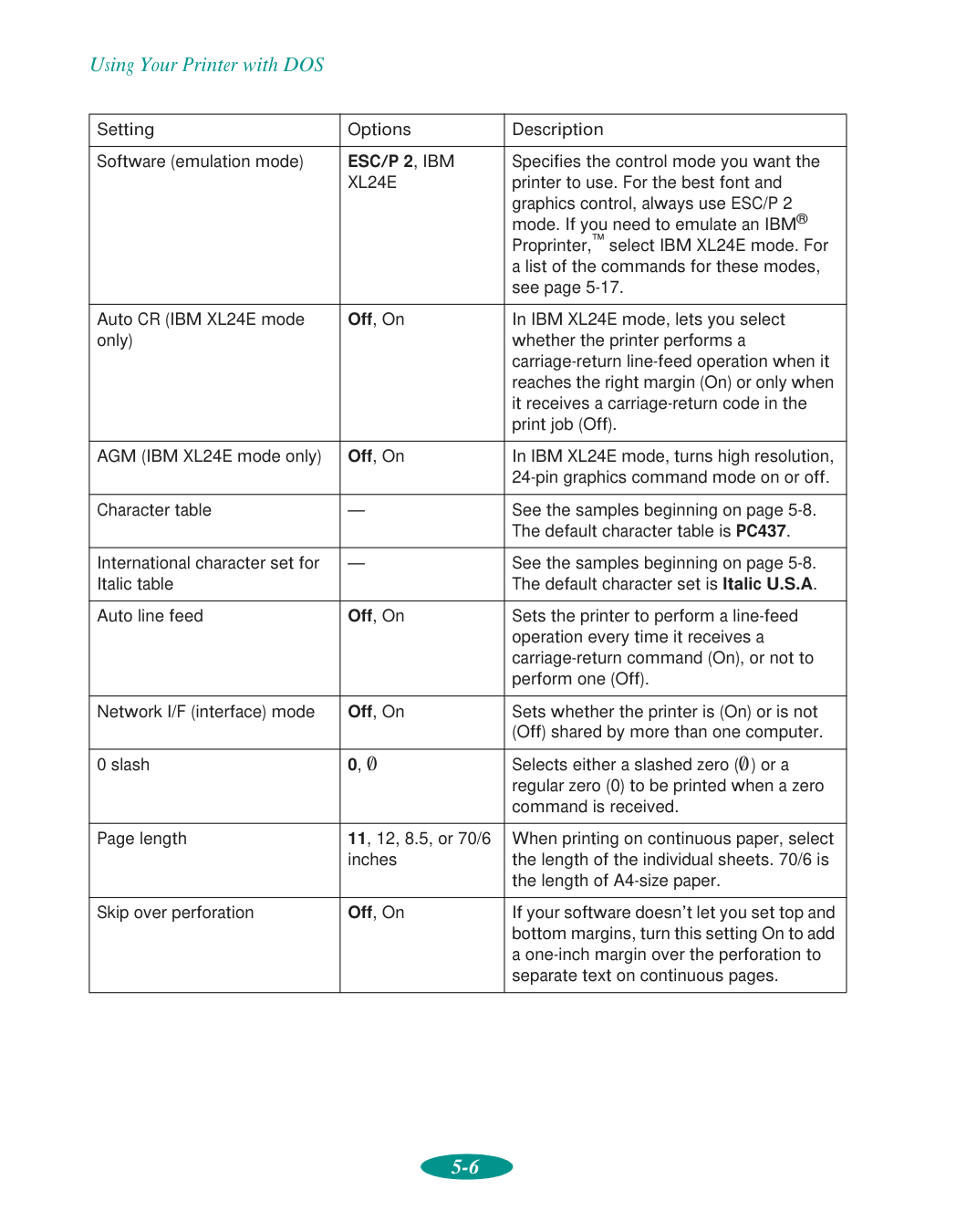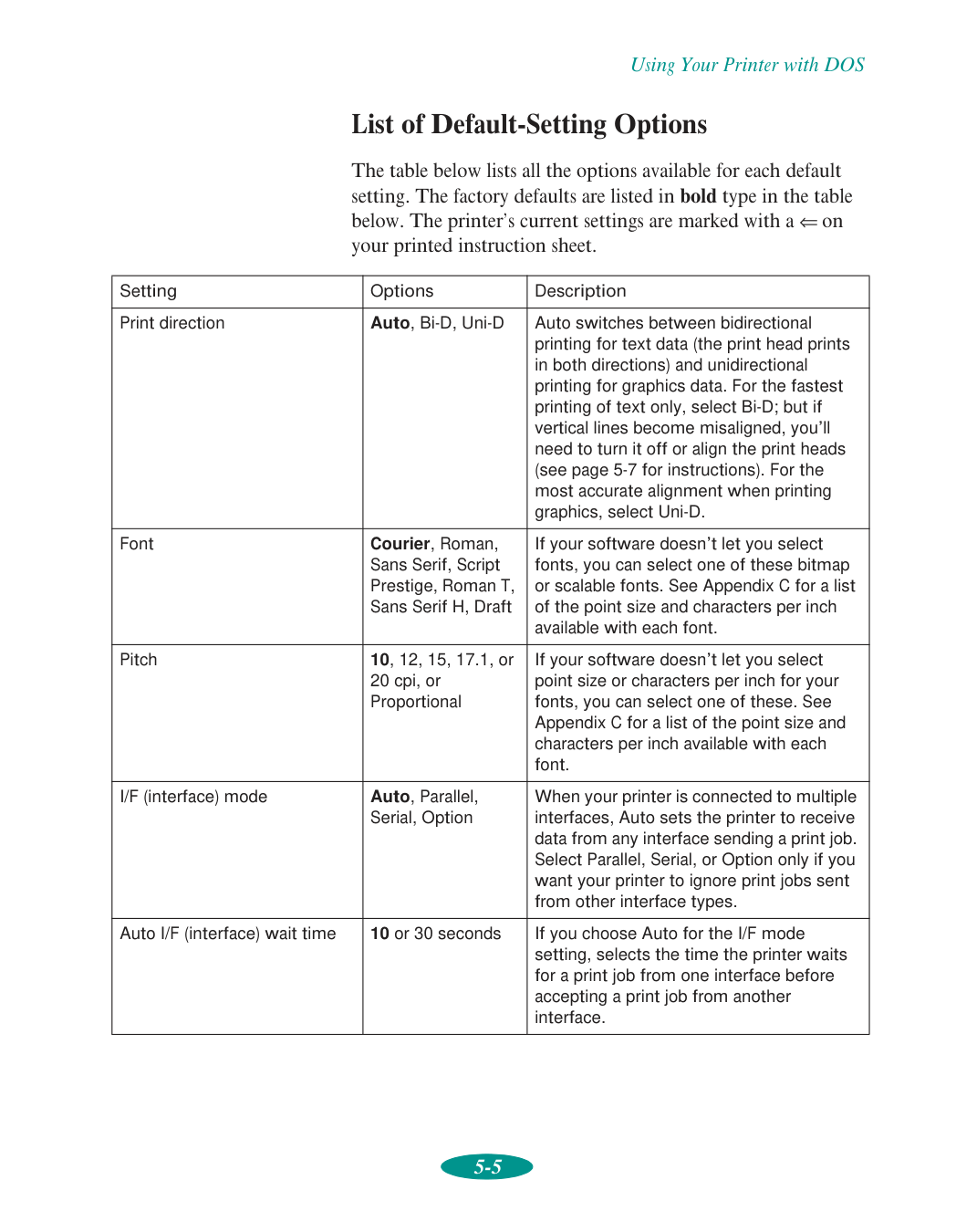 Default printer options, setting, 1-5 to 1-6 Default-setting mode, 5-3 to 5-7,7-16, C-2