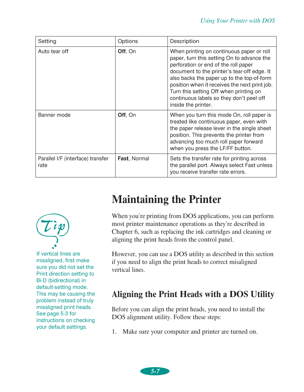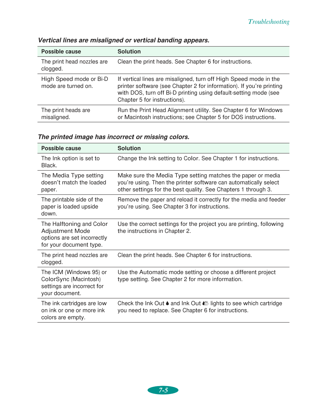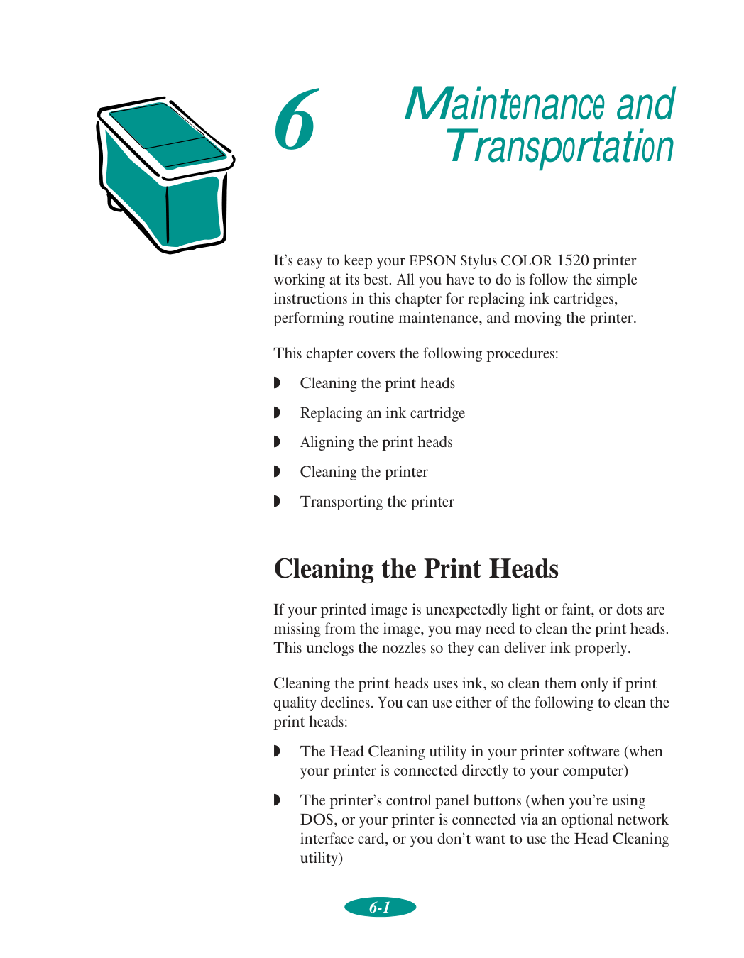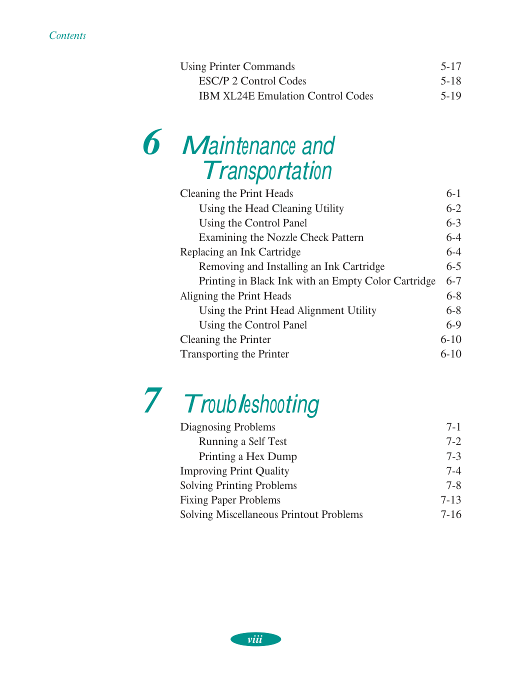 Selecting Printer Software for DOS 5-1 Changing Printer Settings with Default-Setting Mode 5-3 Entering Default-Setting Mode 5-3 List of Default-Setting Options 5-5 Maintaining the Printer 5-7 Aligning the Print Heads with a DOS Utility 5-7 Selecting Character Tables 5-8 International Character Sets 5-16 Characters Available with the ESC ( ^ Command 5-17Contents viii Using Printer Commands 5-17 ESC/P 2 Control Codes 5-18 IBM XL24E Emulation Control Codes 5-19 6 Maintenance and Transportation Cleaning the Print Heads 6-1 Using the Head Cleaning Utility 6-2 Using the Control Panel 6-3 Examining the Nozzle Check Pattern 6-4 Replacing an Ink Cartridge 6-4 Removing and Installing an Ink Cartridge 6-5 Printing in Black Ink with an Empty Color Cartridge 6-7 Aligning the Print Heads 6-8 Using the Print Head Alignment Utility 6-8 Using the Control Panel 6-9 Cleaning the Printer 6-10 Transporting the Printer 6-10 7 Troubleshooting Diagnosing Problems 7-1 Running a Self Test 7-2 Printing a Hex Dump 7-3 Improving Print Quality 7-4 Solving Printing Problems 7-8 Fixing Paper Problems 7-13 Solving Miscellaneous Printout Problems 7-16