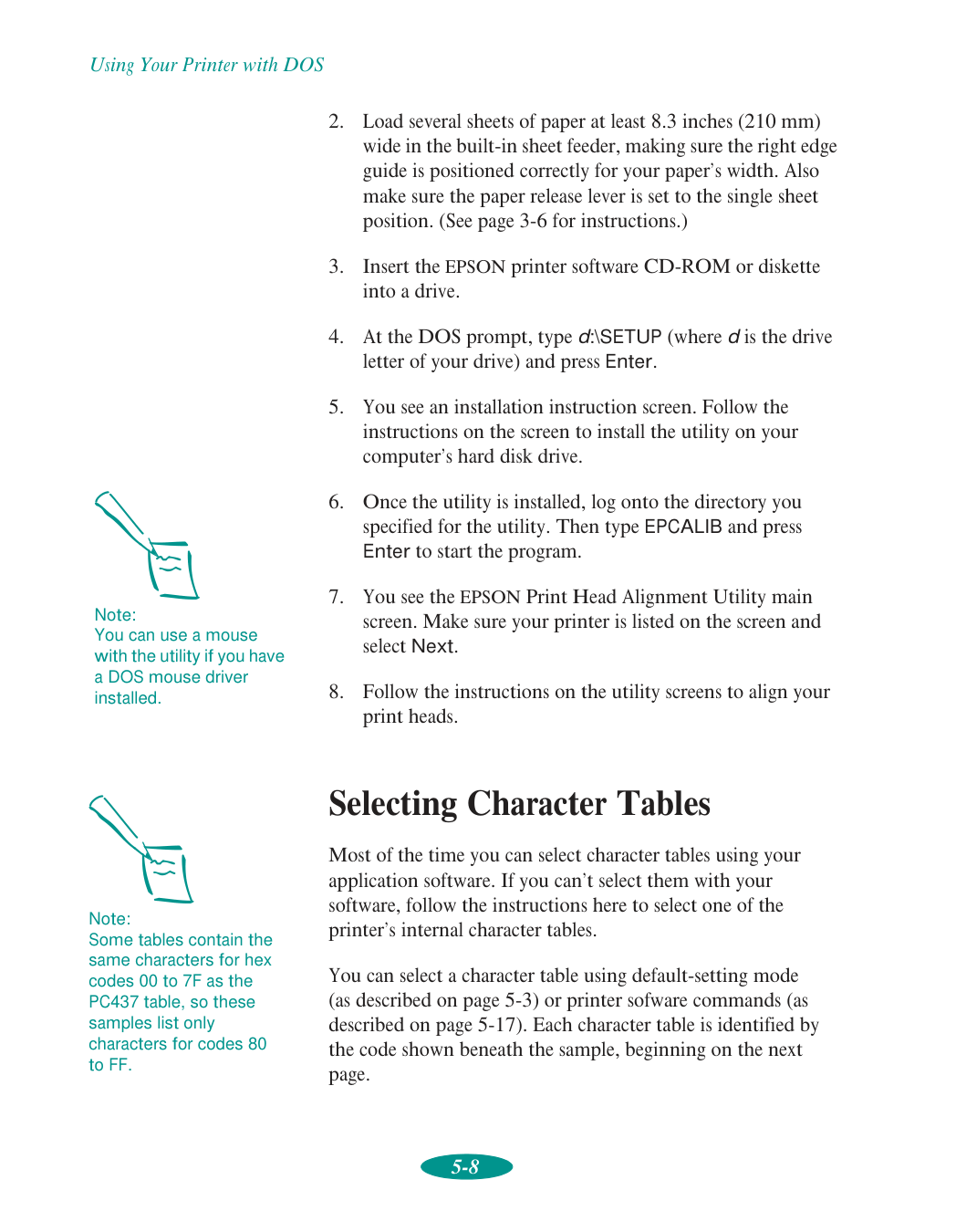 AutoCAD driver, 1, 5-1 changing printer settings, 5-3 to 5-7 character tables, 5-6, 5-8 to 5-17, C-2 EPCALIB utility, 5-7 to 5-8 maintaining printer, 5-7 to 5-8 printer commands, 5-17 to 5-19 selecting printer software for, 5-1 to 5-2 using printer with, 5-1 to 5-19 Download Service, EPSON, 6 Draft printing, 2-3, 2-5E