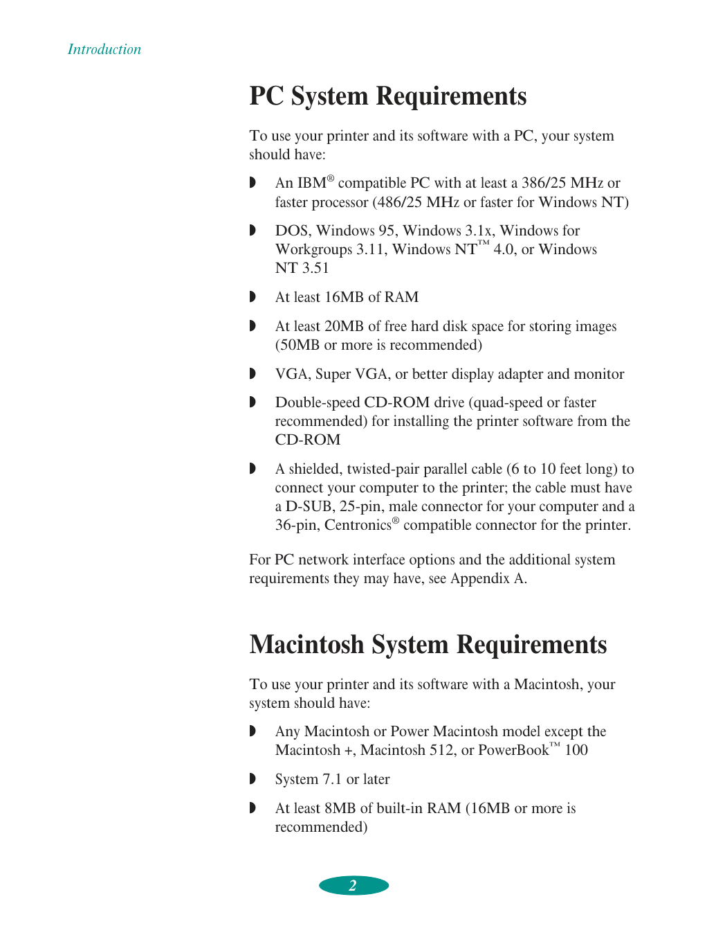 A shielded, twisted-pair parallel cable (6 to 10 feet long) to connect your computer to the printer; the cable must have a D-SUB, 25-pin, male connector for your computer and a 36-pin, Centronics® compatible connector for the printer. For PC network interface options and the additional system requirements they may have, see Appendix A. Macintosh System Requirements To use your printer and its software with a Macintosh, your system should have:Q